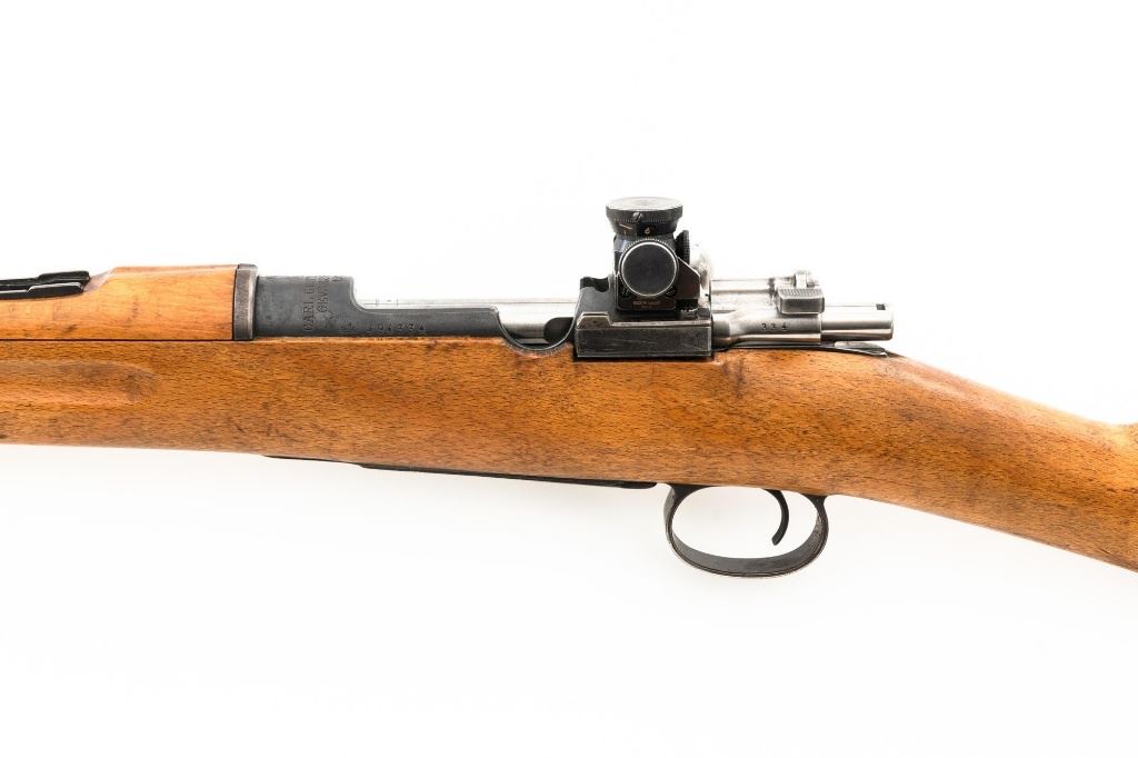 Swedish Model 1896 Mauser Bolt Action Rifle, #494334, 6.5x55mm cal., 29.5" barrel, blued finish with bright bolt assembly, hardwood stock and handguard. Issue sights removed now fitted with globe type front sight with insert and rear aperture sight, marked "Elit/m/Edstrom". Target sight is in good used condition and functions properly. With steel cleaning rod, cotton military sling, and three (3) excellent condition steel stripper clips. Sling is in good used condition. Top of the receiver ring is marked with Swedish crest over "CARL GUSTAFFS STADS/GEVARSFAKTORI/1921". Matching numbers. No visible import marks. Condition overall is very good, retaining approx. 85% blue, showing areas of thinning and toning, frosting across the barrel and receiver. Bolt assembly is in excellent condition. Wood has been sanded and stained, now in very good condition, with light handling marks. The rear sling swivel, buttstock brass disc, and range scale have been removed. Action operates smoothly. Bore is bright with very good, clearly defined rifling. Est.: $300-$500. (C&R)