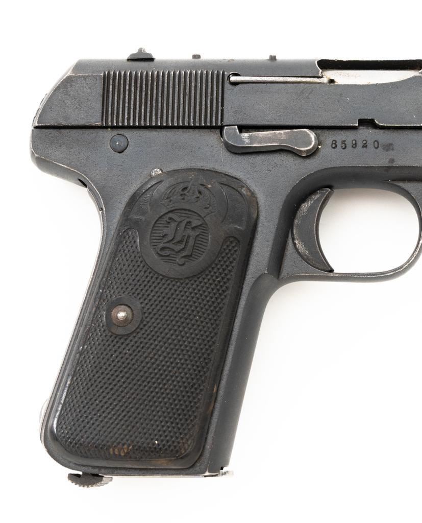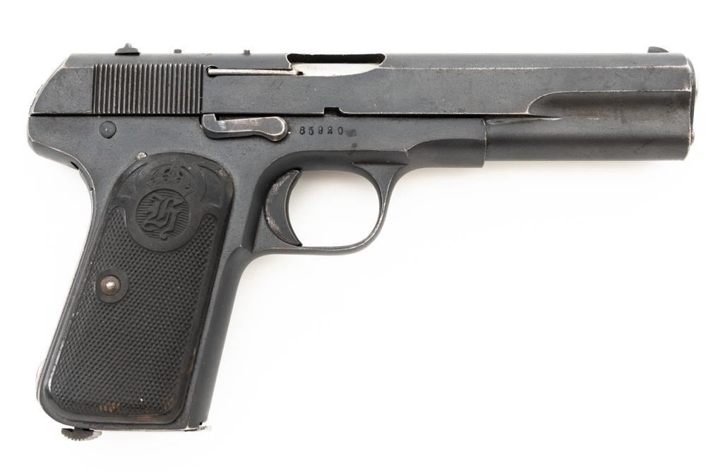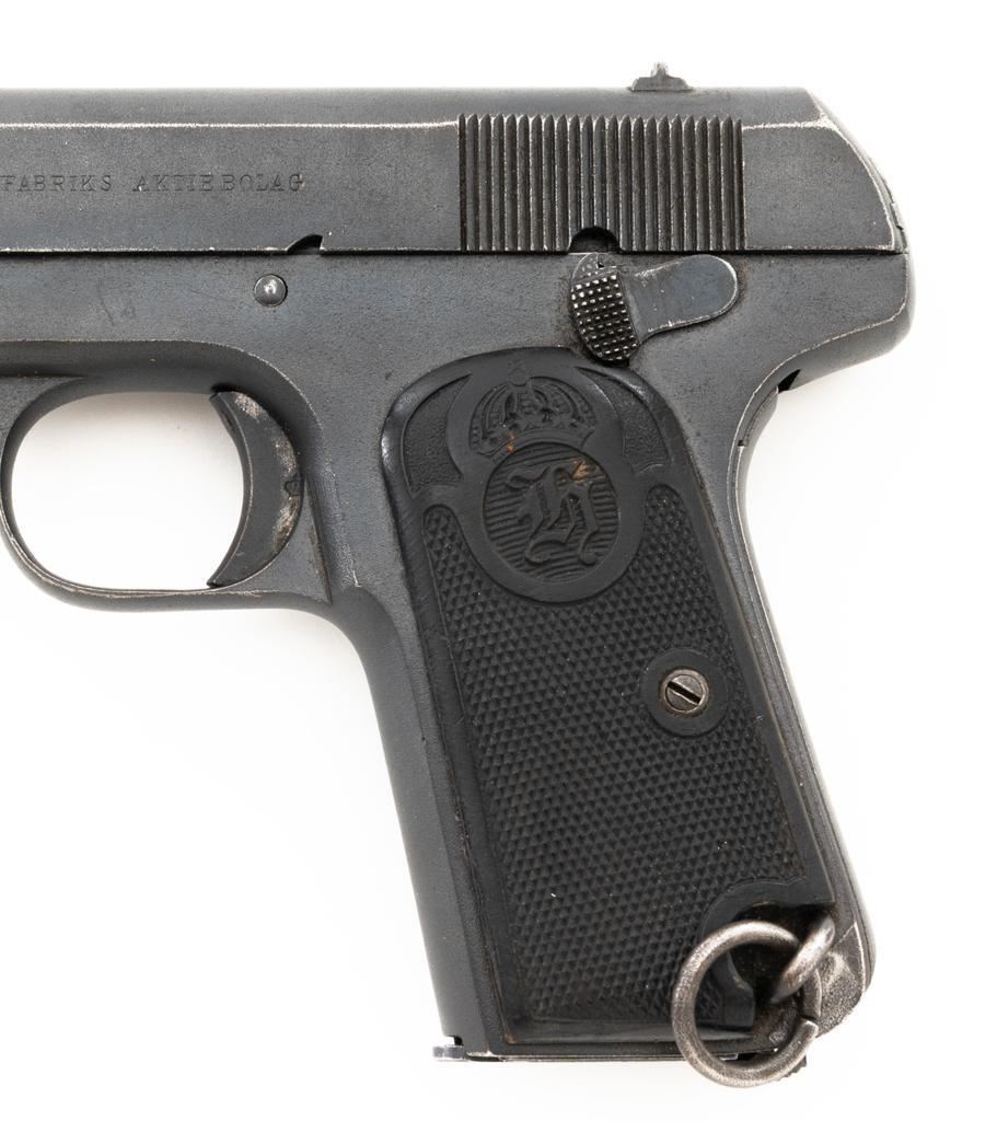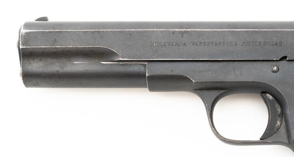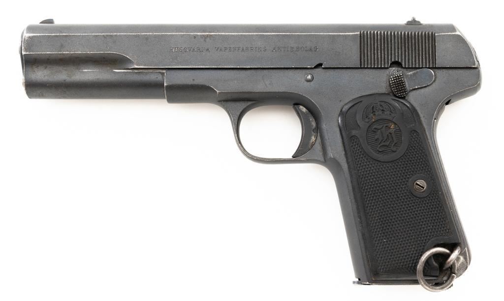 Swedish Model 1907 Semi-Automatic Pistol, #85920, .380 ACP cal., 5"barrel, blued finish, black plastic checkered grips embossed with crowned Husqvarna logos on each side, blade front sight, fixed rear sight with "U"-notched groove, and lanyard ring. Includes one unmarked blued steel magazine. Pistol is marked "HUSQVARNA VAPENFABRIKS AKTIEBOLAG" on left side of the slide. No visible import marks. Condition overall is fine as arsenal refurbished, retaining approx. 92%-94% blue, with high point edgewear, and areas of patina to the slide. Left grip is very good, showing typical light handling marks. Right side grip shows a little more wear at the top and fine cracks around the grip screw. Action operates smoothly. Bore is bright with very good rifling. Est.: $400-$600. (C&R)