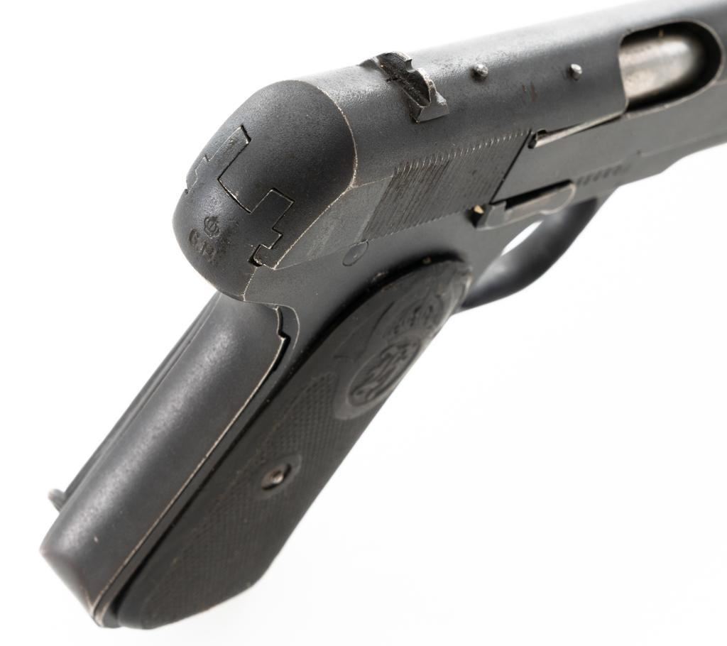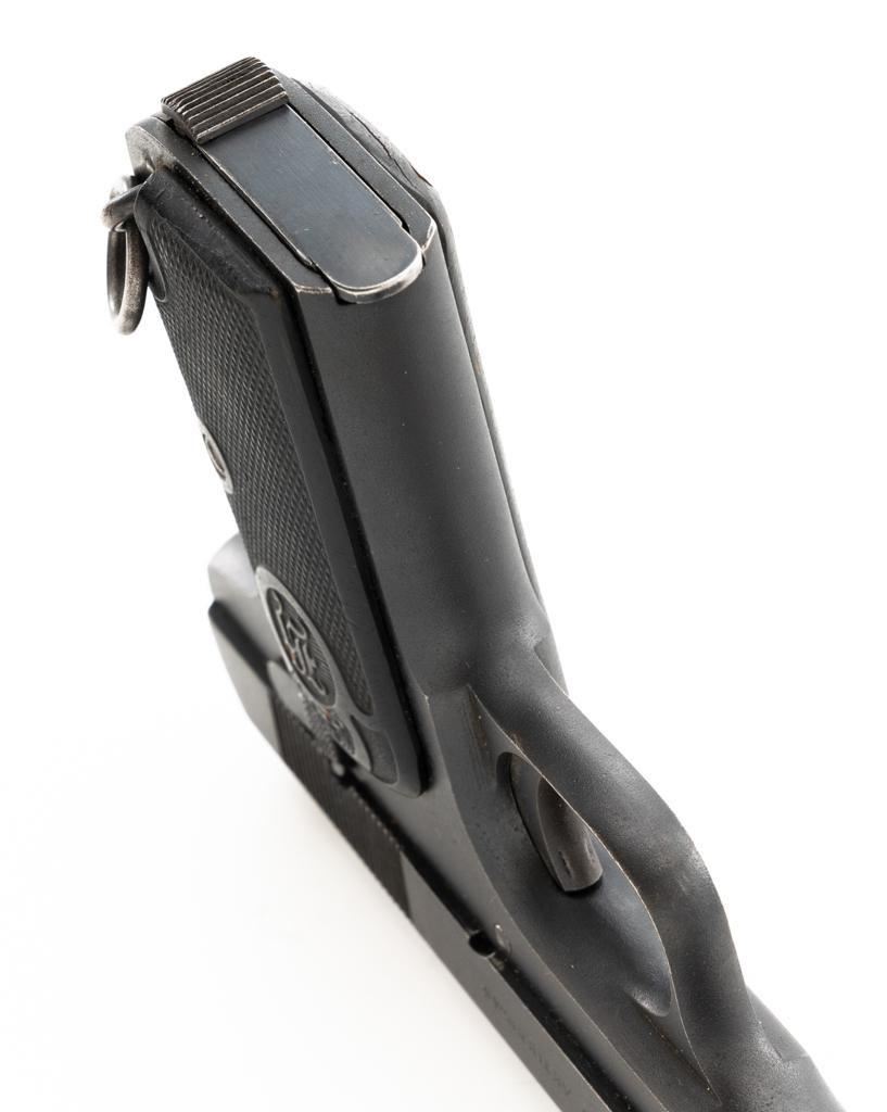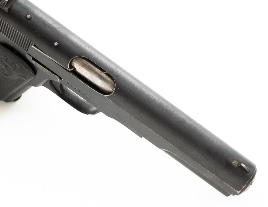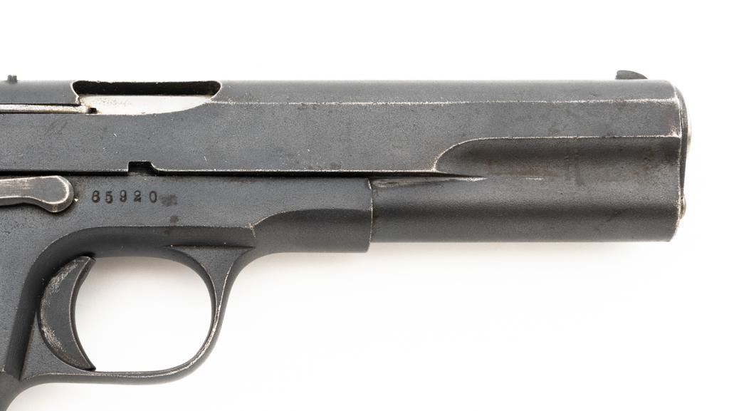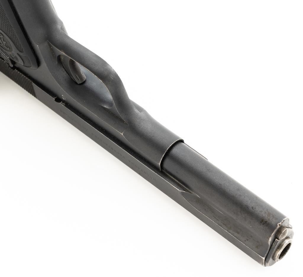 Swedish Model 1907 Semi-Automatic Pistol, #85920, .380 ACP cal., 5"barrel, blued finish, black plastic checkered grips embossed with crowned Husqvarna logos on each side, blade front sight, fixed rear sight with "U"-notched groove, and lanyard ring. Includes one unmarked blued steel magazine. Pistol is marked "HUSQVARNA VAPENFABRIKS AKTIEBOLAG" on left side of the slide. No visible import marks. Condition overall is fine as arsenal refurbished, retaining approx. 92%-94% blue, with high point edgewear, and areas of patina to the slide. Left grip is very good, showing typical light handling marks. Right side grip shows a little more wear at the top and fine cracks around the grip screw. Action operates smoothly. Bore is bright with very good rifling. Est.: $400-$600. (C&R)