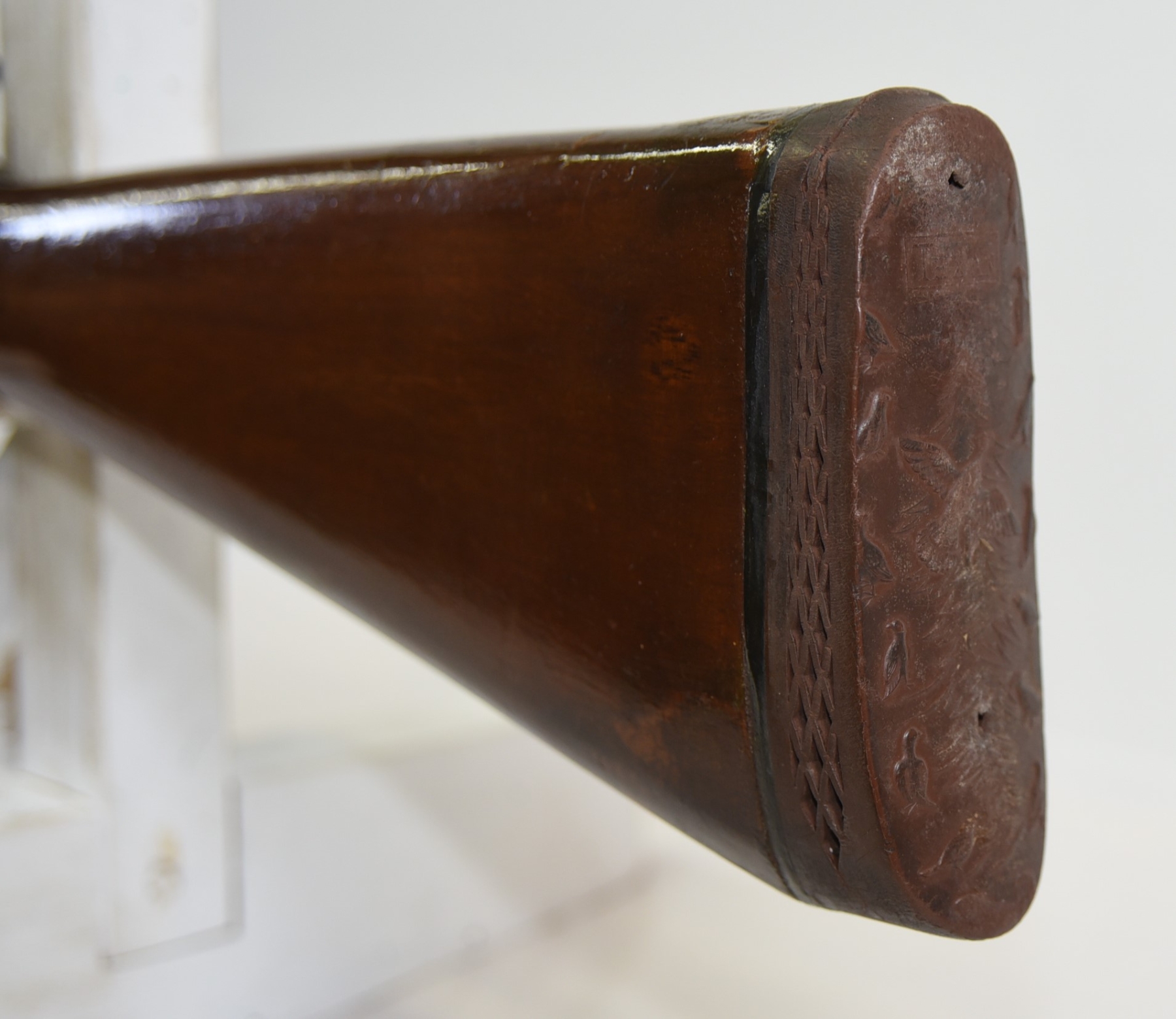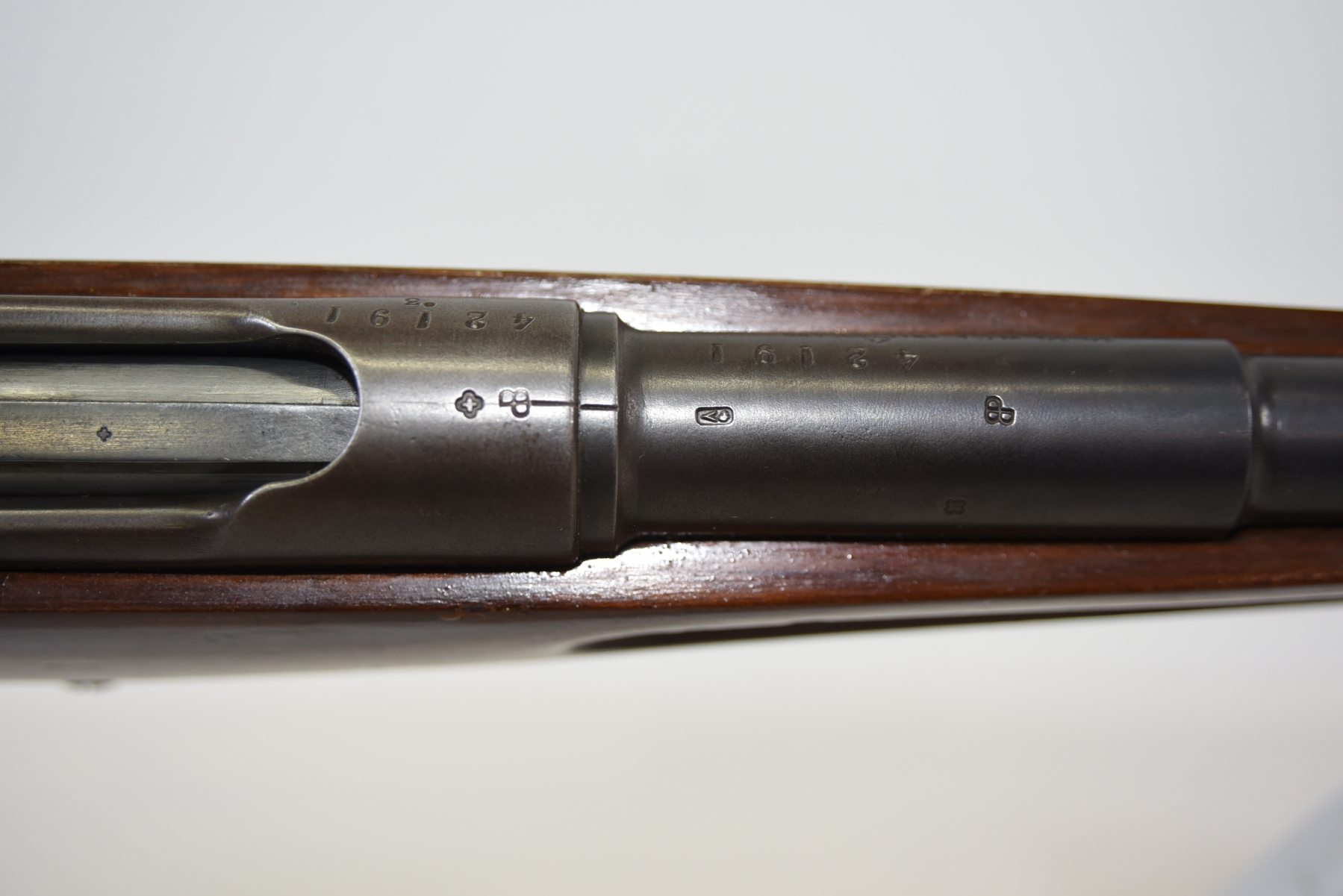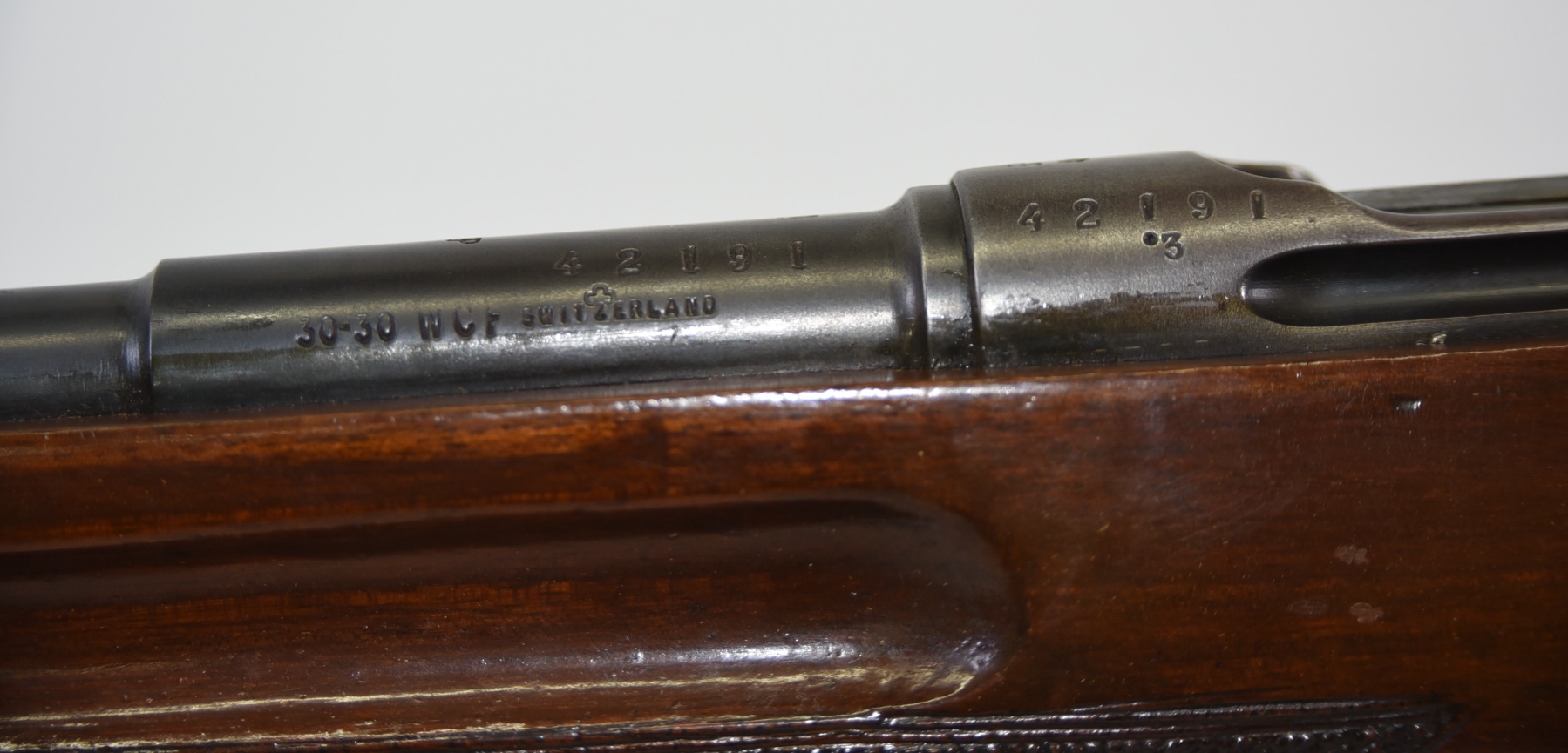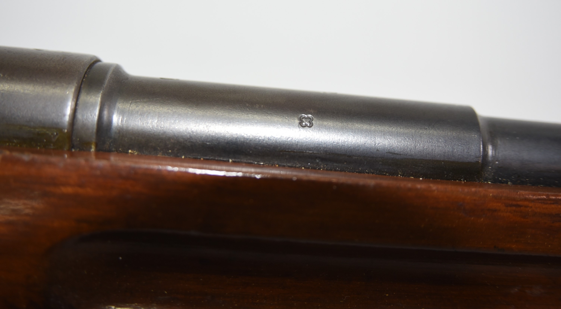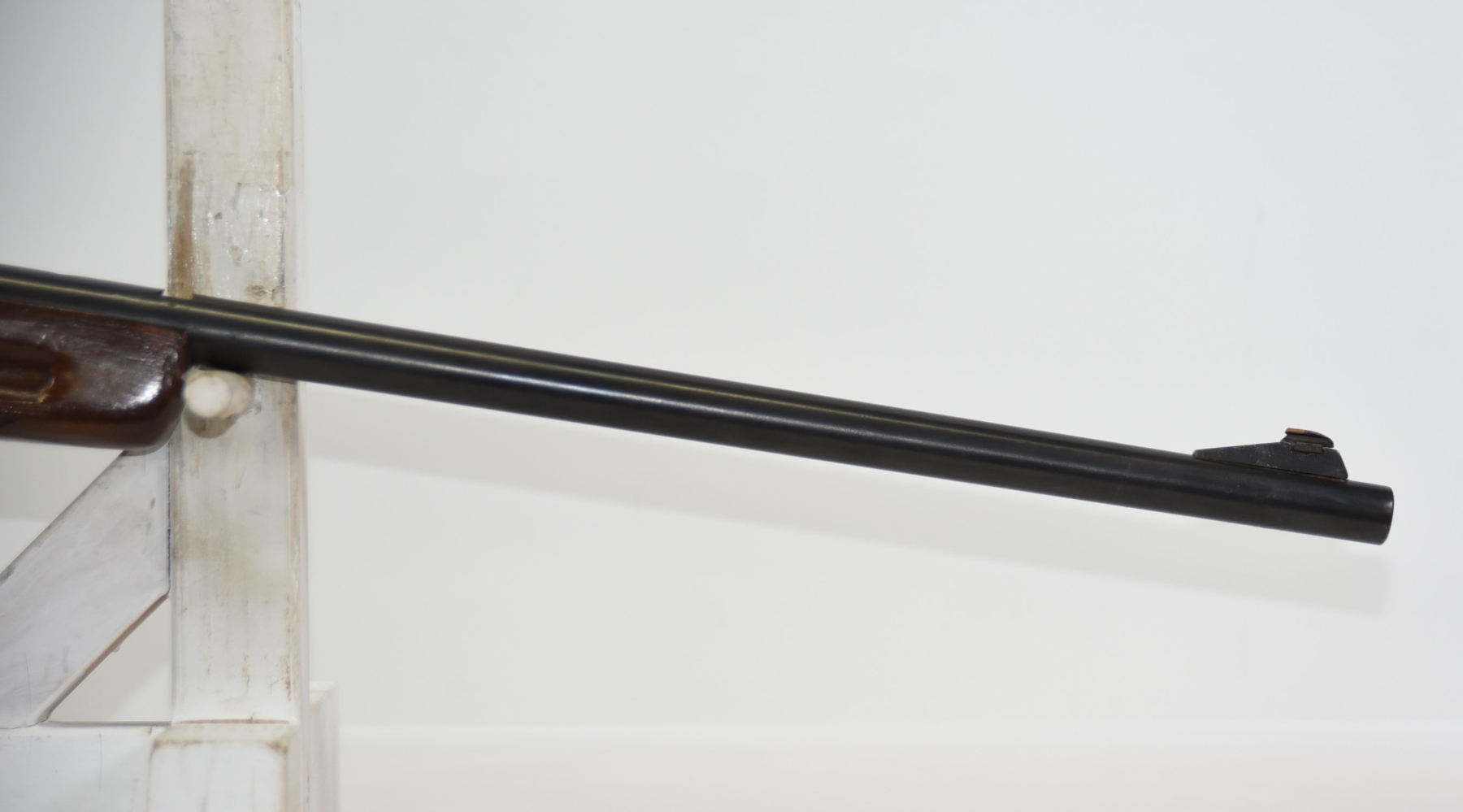 Wood stock has been sporterized - shows scratches, scuffs, light dents, finish wear; condition is fair.