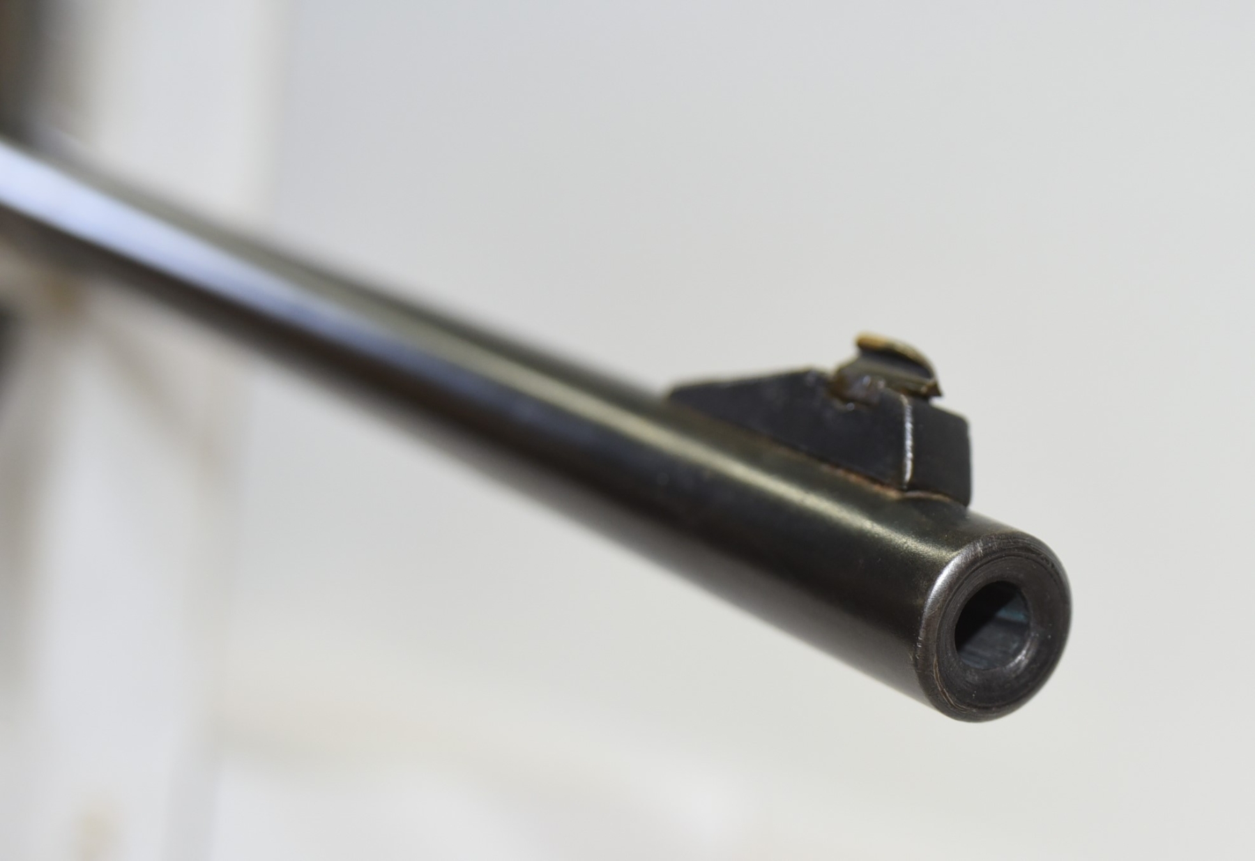 Metal finish shows scratches, is missing rear sight, scuffs, finish wear, light dents; condition is fair.