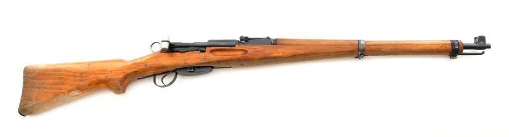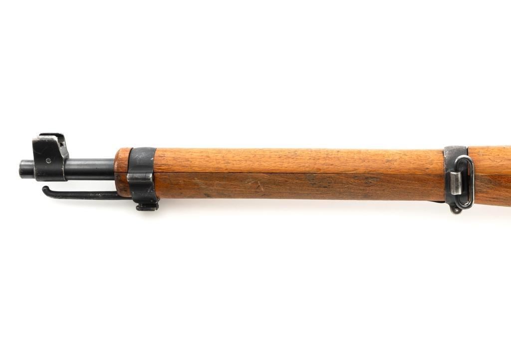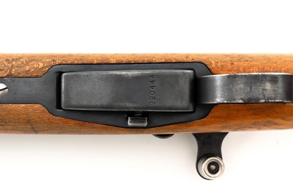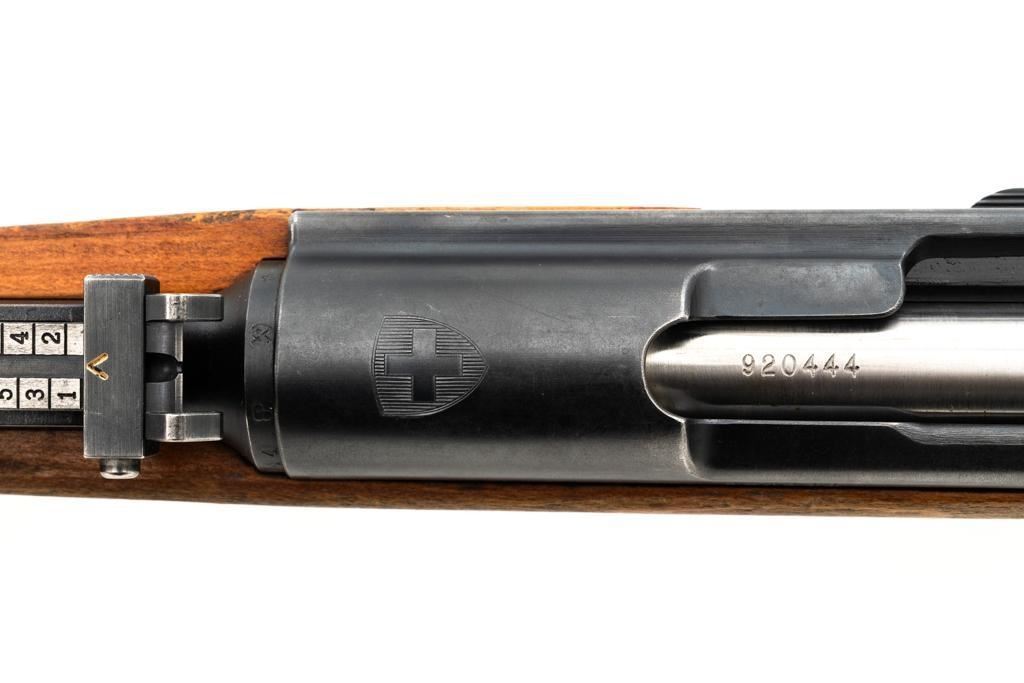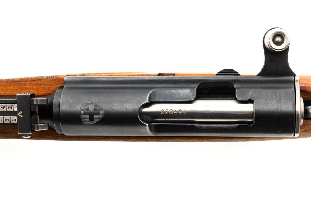 Swiss K31 Straight Pull Rifle, #920444, 7.5x55mm cal., 25.6" barrel, blued finish with bright bolt body, hardwood stock and handguard, blade front sight with protectors, and adjustable tangent rear sight with "U"-notched groove, graduated to 1500 meters. Top of receiver and right side of the buttstock with "(Swiss cross)" inside a shield proofs. Matching numbers. Import marked on right side of the barrel. Condition overall is very good+, retaining approx. 90%-92% blue, with wear around the muzzle area, to the rear barrel band, and magazine. Wood shows general thinning and loss of finish. especially to left side of the forend and both sides of the buttstock; with scattered dents and scratches. Action operates smoothly. Bright bore rates very good, with defined rifling. Est.: $400-$600. (C&R)