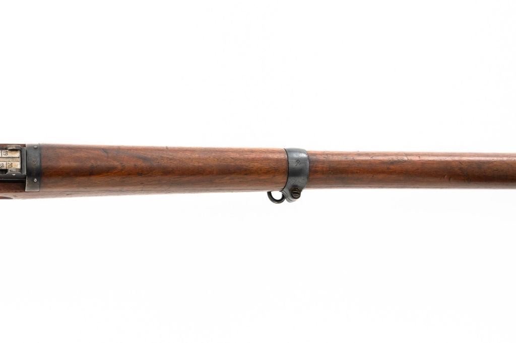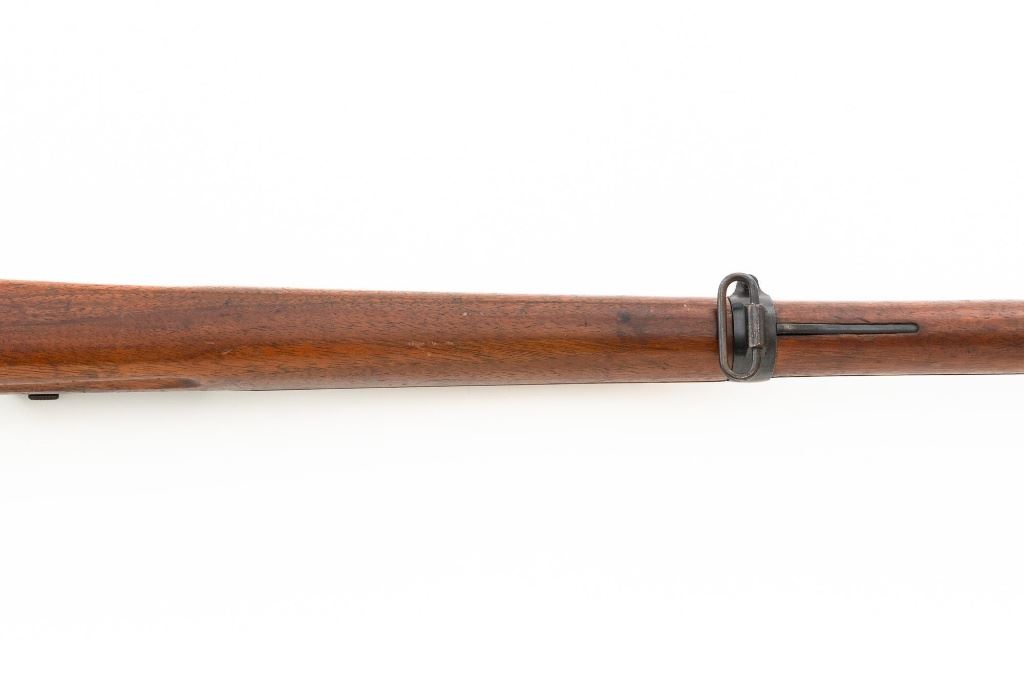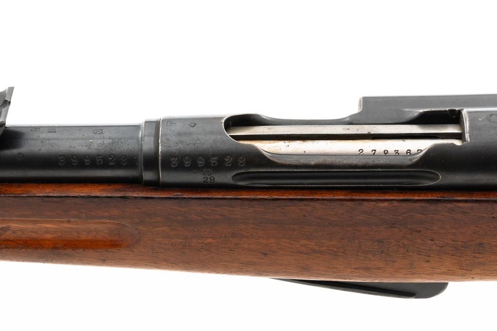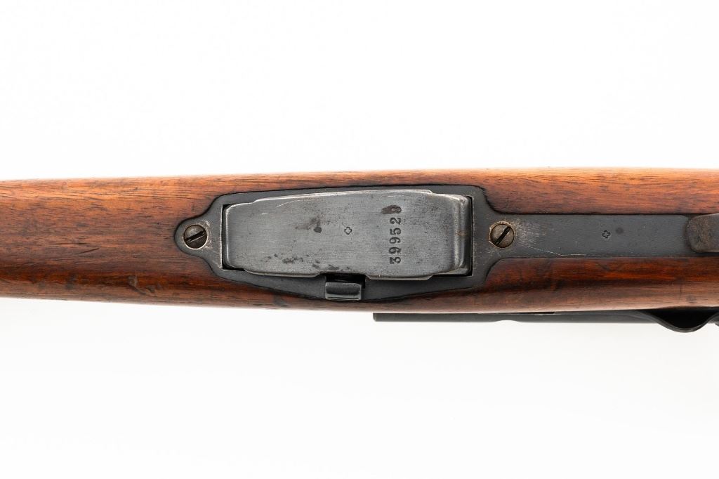 Swiss Model 1911 Schmidt-Rubin Straight Pull Rifle, #399528, 7.5x55mm cal., 30.7" barrel, blued finish with bright bolt assembly, hardwood stock and handguard, dovetailed blade front sight, and adjustable tangent rear sight with "U"-notched groove, graduated to 2000 meters. Includes a 6-round blued steel magazine. Buttplate and screws are missing. Top of the receiver ring and right side of the buttstock marked with a Swiss cross. Matching numbers on the barrel and magazine. Bolt does not match. No visible import marks. Condition overall is very good, retaining approx. 85% blue. Wear to rear of the receiver accounts for much of the finish loss. Wood with scattered mostly moderate impressions and scratches. Action operates smoothly. Bore is bright with very good rifling. Est.: $300-$400. (C&R)