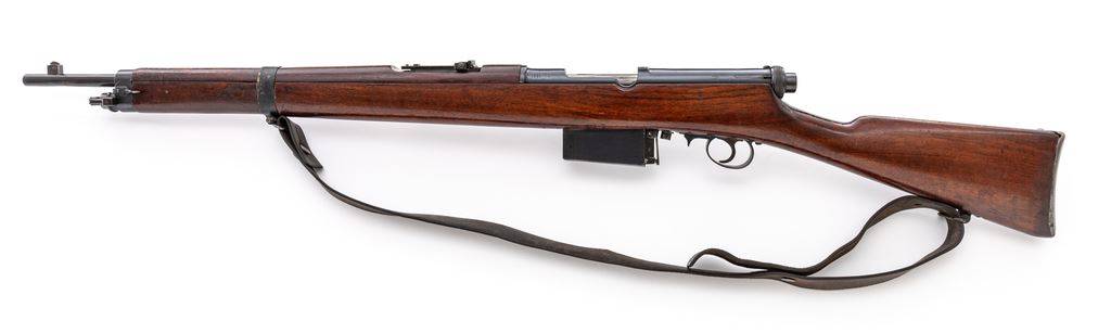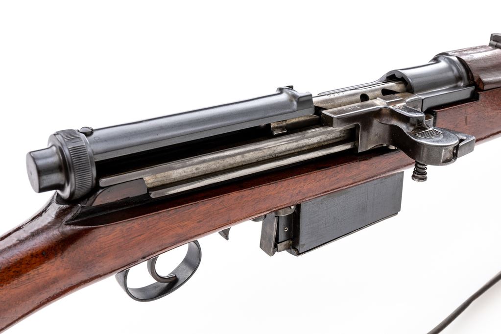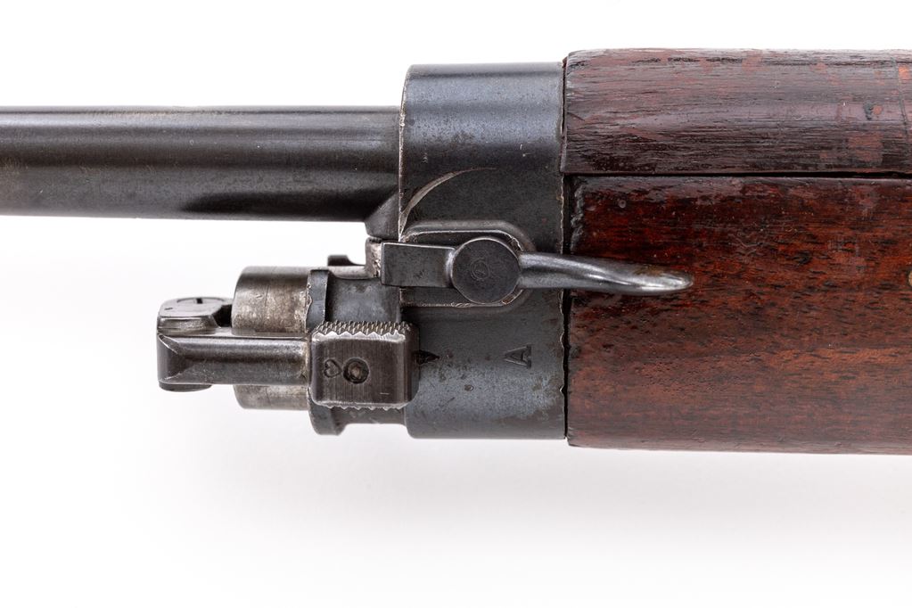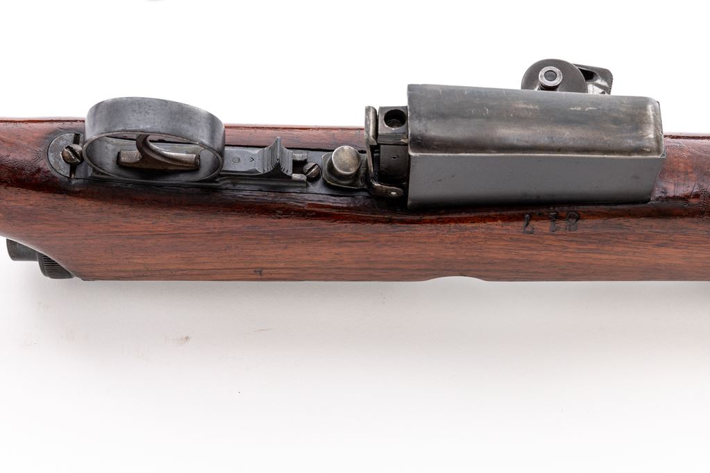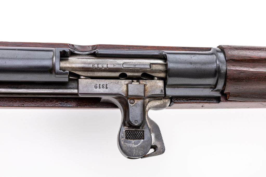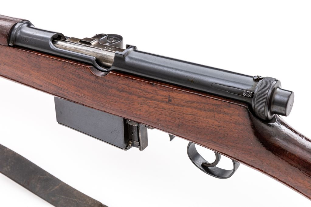Swiss Mondragon Model 1908/German FSK15 Semi-Automatic Rifle, #1319, 7x57mm, 23" barrel, 43.5" overall, blued finish, hardwood stock, blade front sight and adjustable folding leaf rear sight. Rifle serial number 1319 is known to have been converted from a Model 1908 to an FSK15. Crest has been ground off the top of the receiver ring and is partially visible on the left side. Buttstock has been shortened and buttplate modified to fit. Barrel has been shortened (it is now 23", not 25" as per the specification for the FSK15), and bayonet mounting bar has been removed from the barrel. Charging handle has been modified so that it won't separate from the return spring, "81.7" has been stamped into the left side of the forend above the magazine box; a screw was added to the gas cylinder to prevent rotation, and a retaining screw was added to the receiver end cap. Receiver, bolt, and operating handle have matching numbers. Includes a good condition leather sling. Condition overall is very good with the metal retaining approx. 90% of its reblued finish. Wood has had varnish applied, now darkened, showing scratches and handling marks to the forend and handguard. Action operates smoothly, bright bore is excellent. No visible import marks. Est.: $5,000-$7,000. (C&R)