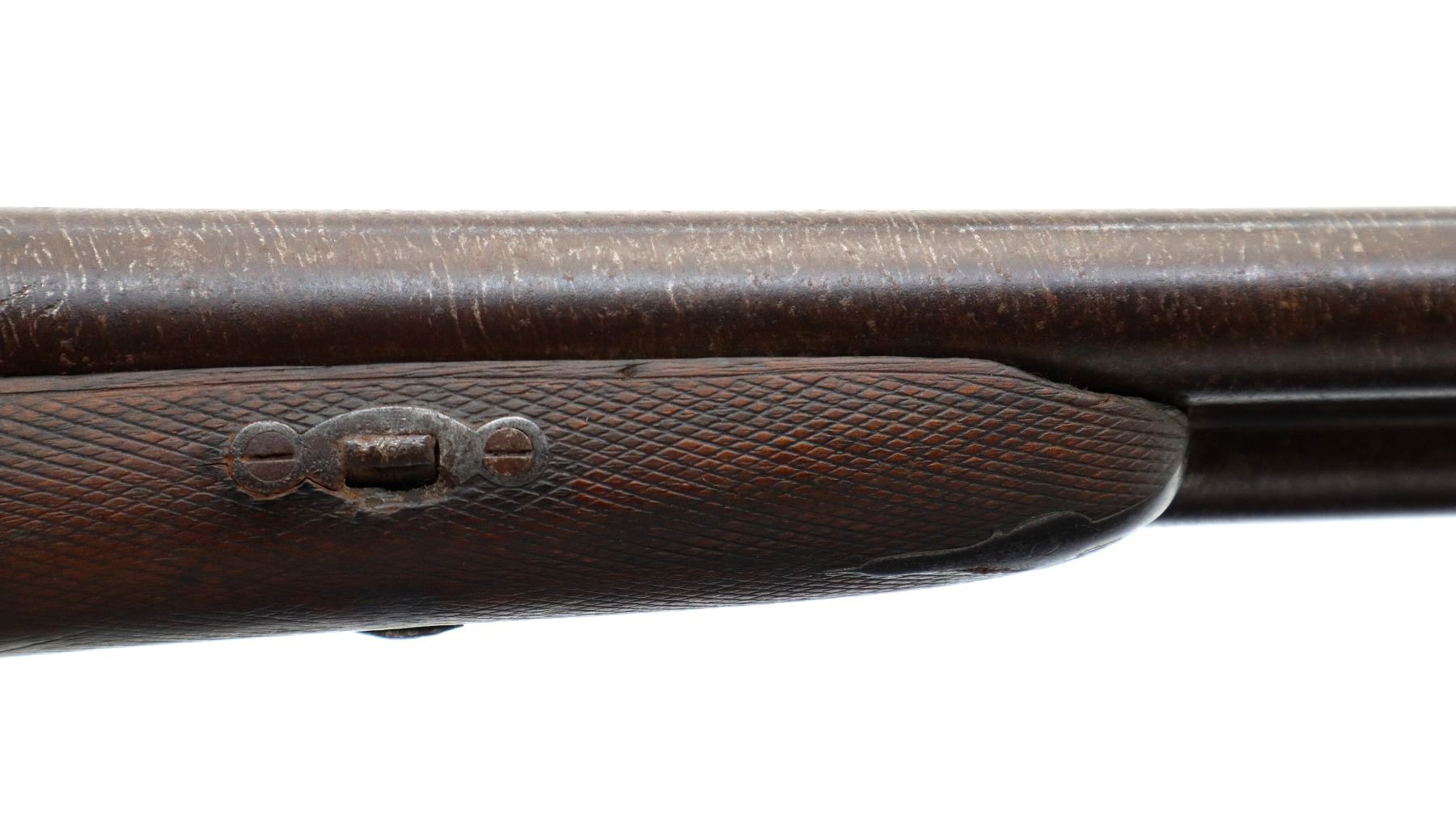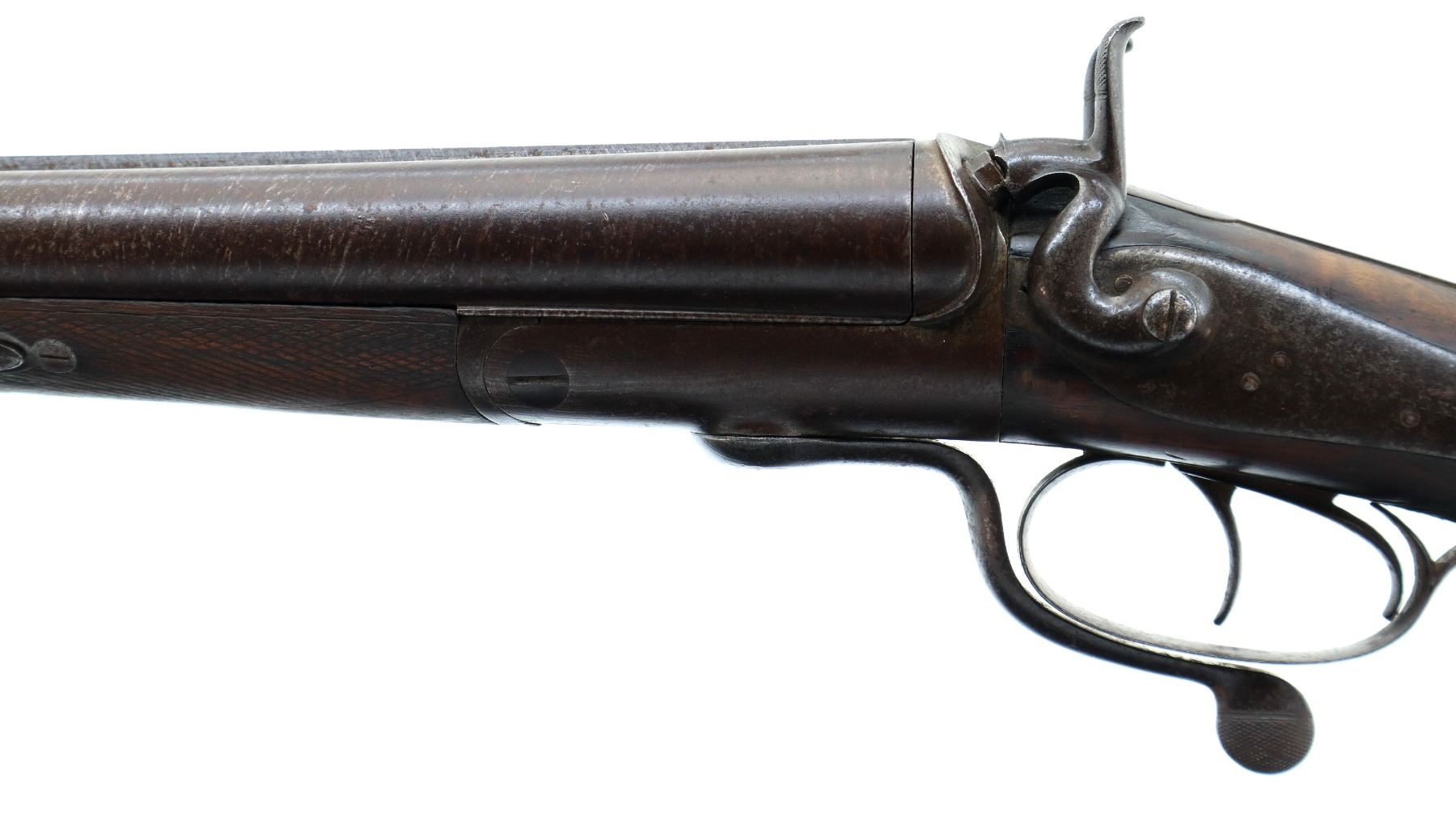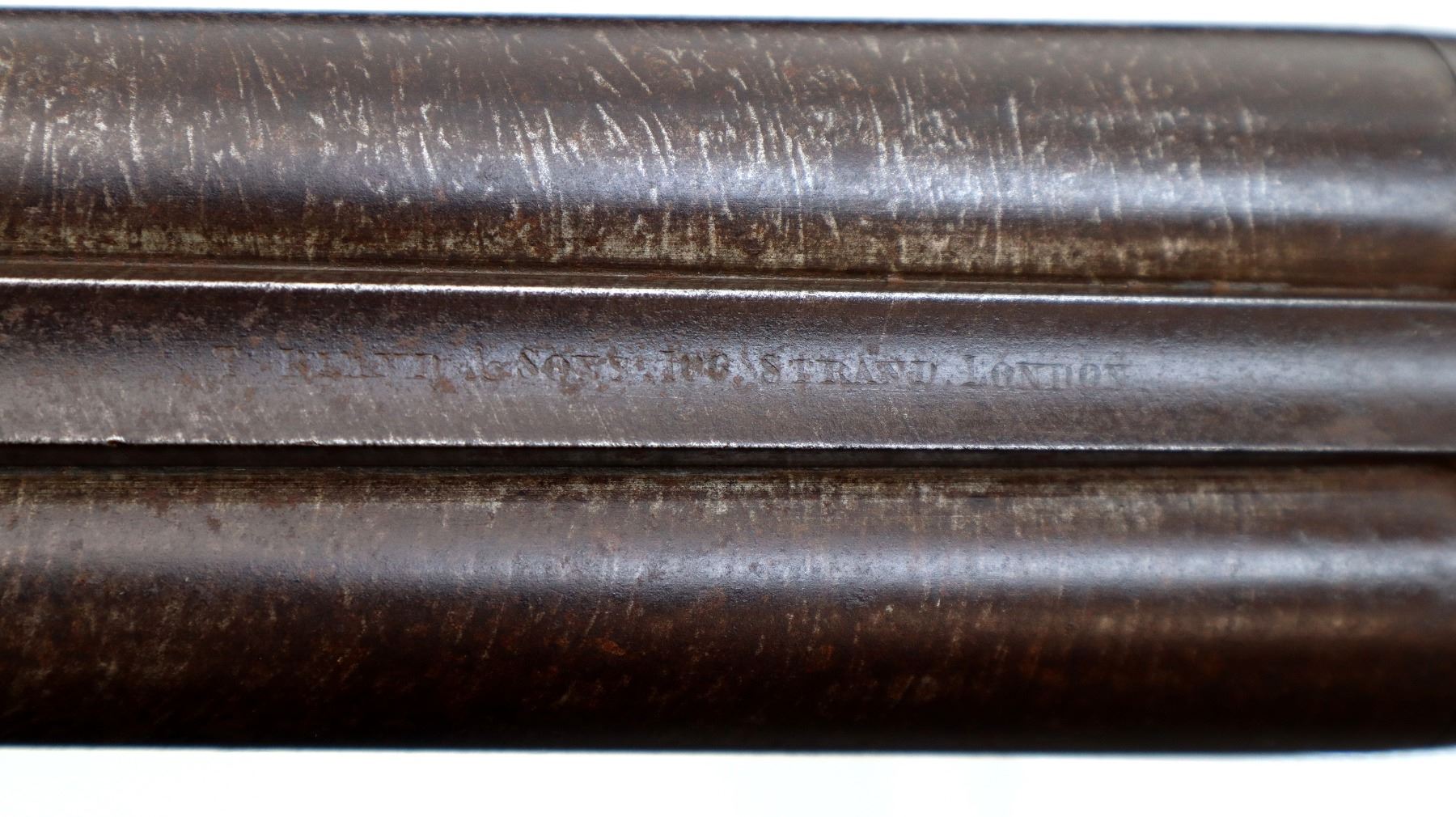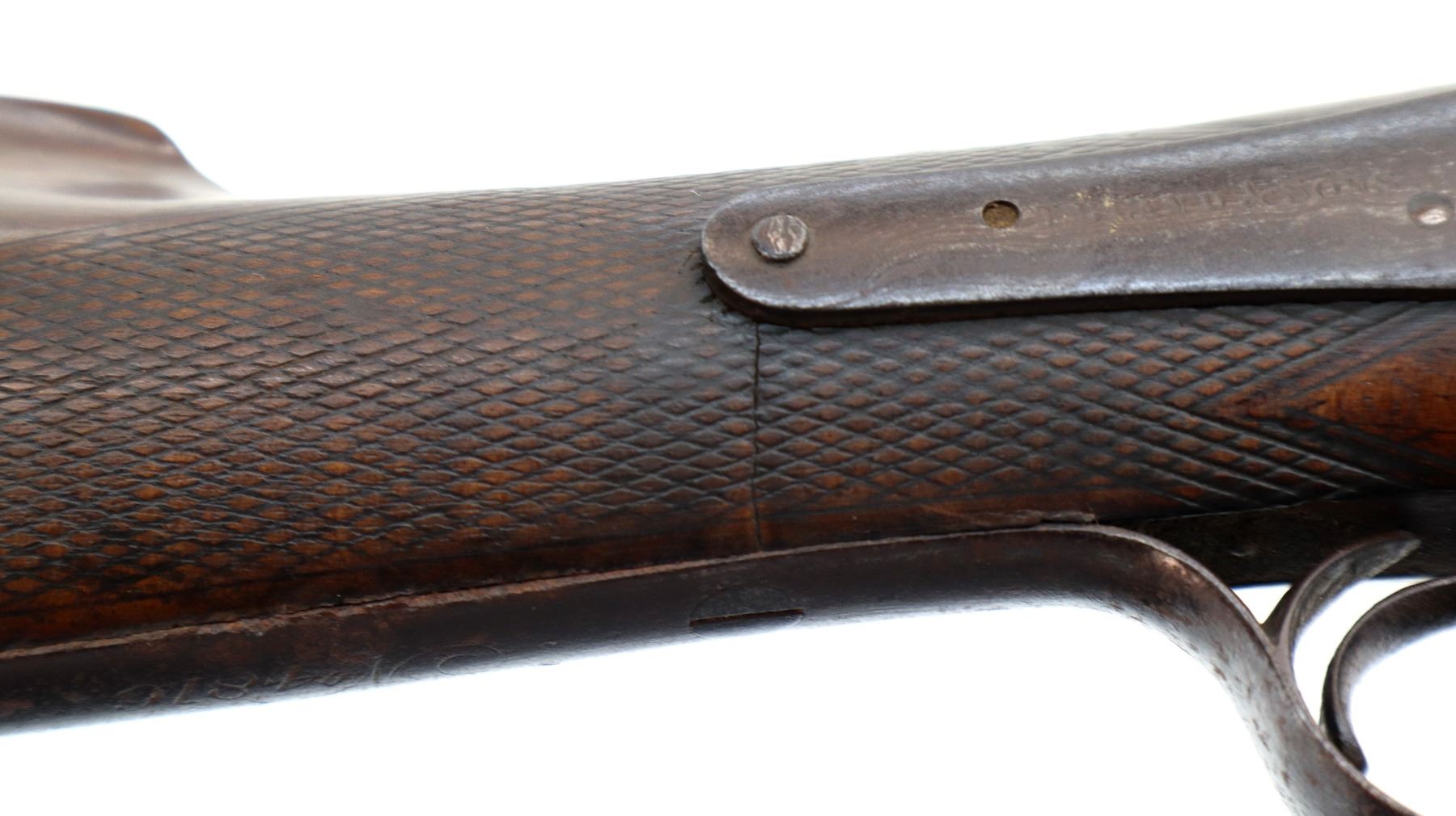 Main Description: Silver bead, Damascus barrels with smooth rib that are bulged, back action locks with checkered spur hammers that function, extractor, double triggers, underlever is loose with no tension. Two piece wood stocks, checkered forearm with single wedge one side plate is damaged, checkered straight grip, smooth steel butt plate, vanity plate.