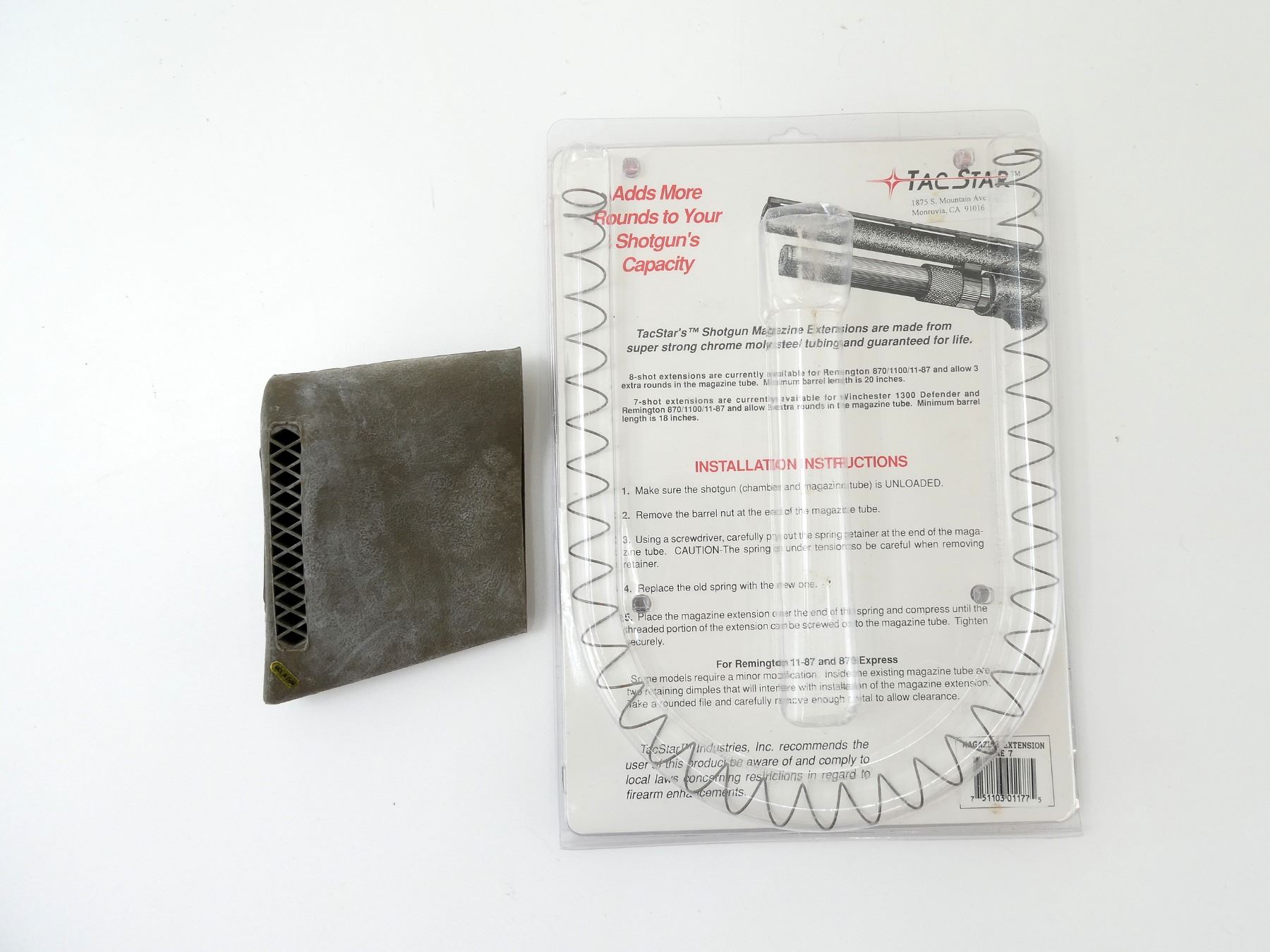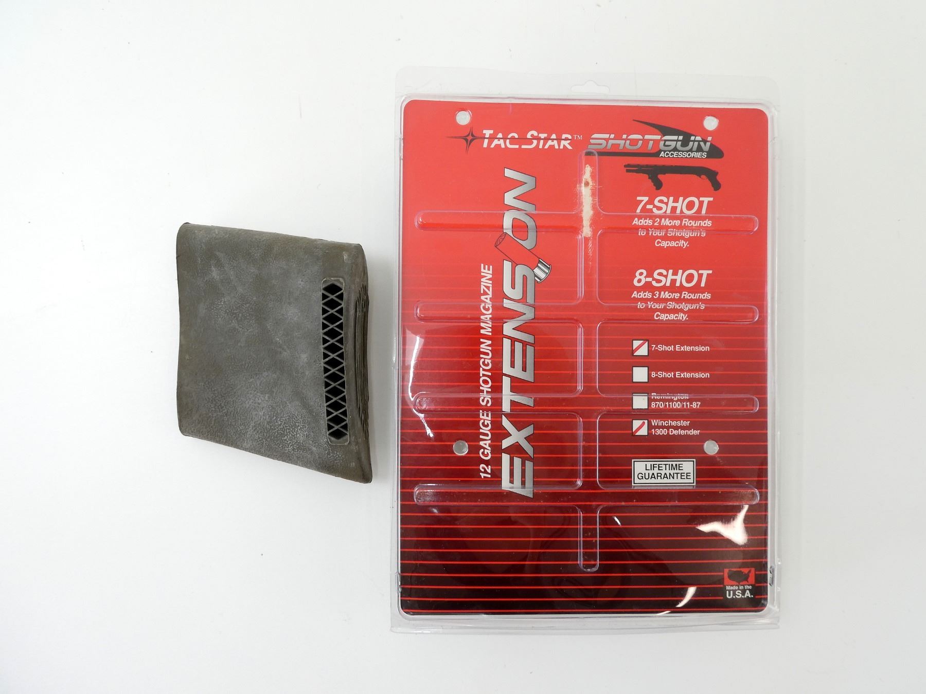 LOT INCLUDES; (1) TACSTAR REMINGTON 1300 DEFENDER 12 G. EXTENDED MAG TUBE SPRING, 7 SHOTS, APPEARS NEW OLD STOCK IN ORIGINAL PACKAGING & (1) UNKNOWN SLIP-ON RUBBER RECOIL PAD. MAY REQUIRE FITTING. SEE PHOTOS.