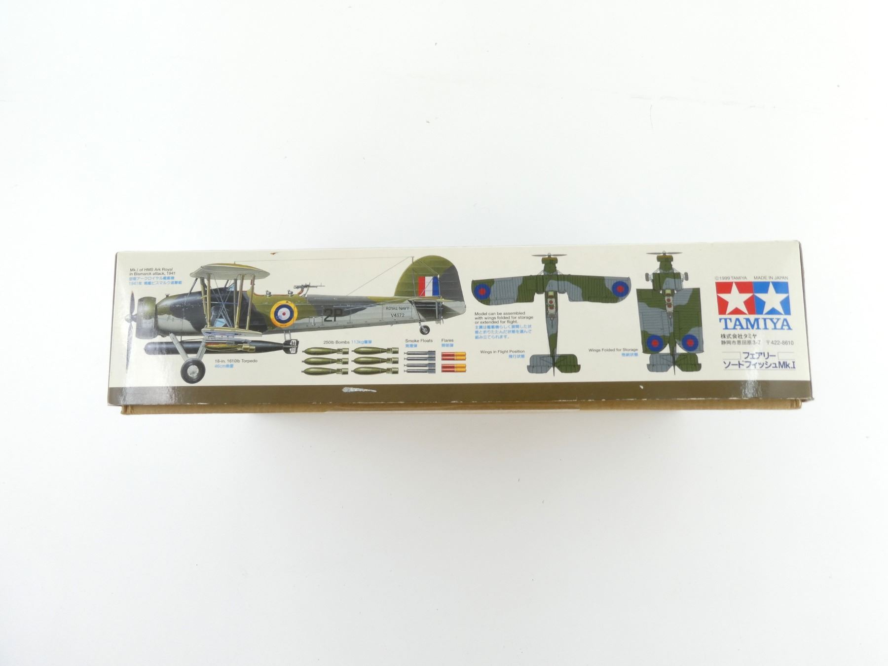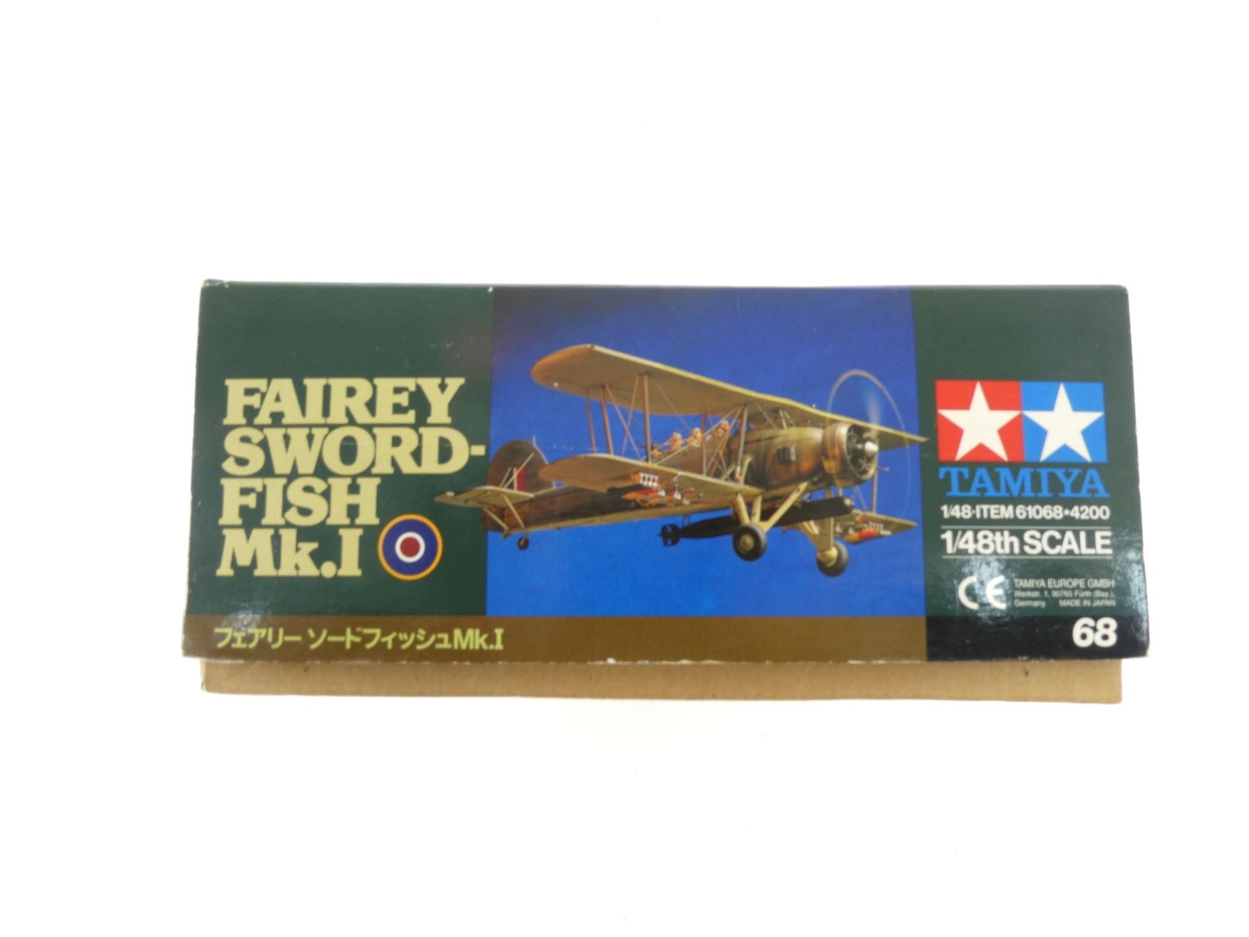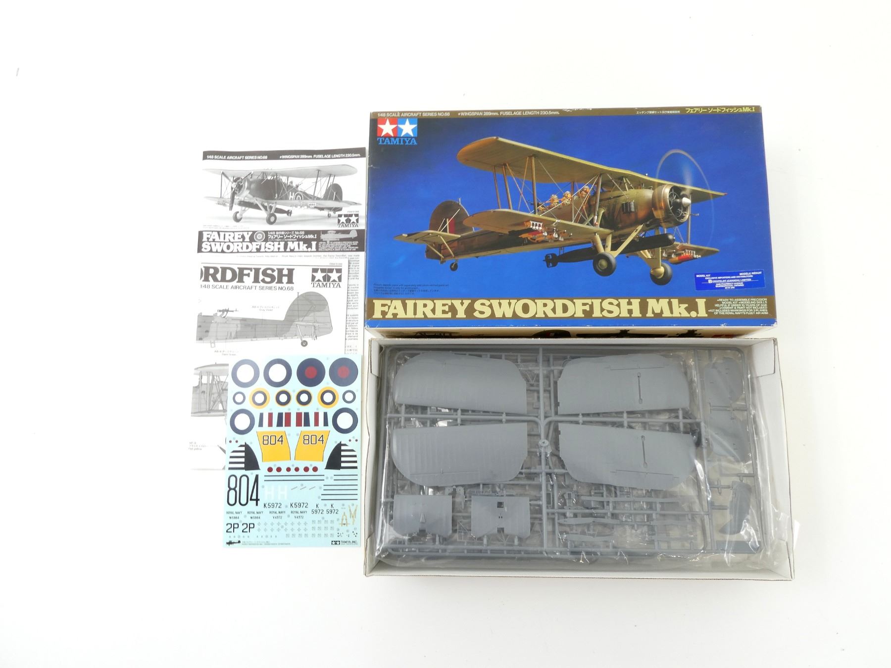 (1) FAIREY SWORDFISH MK.I MODEL PLANE, MADE BY TAMIYA, 1:48 SCALE, IN ORIGINAL PACKAGING WITH INSTRUCTIONS, APPEARS NEW OLD STOCK PIECES SEALED IN UN-OPENED PLASTIC PACKAGING, KIT MAY NOT BE COMPLETE / PIECES MAY BE MISSING. SEE PHOTOS.