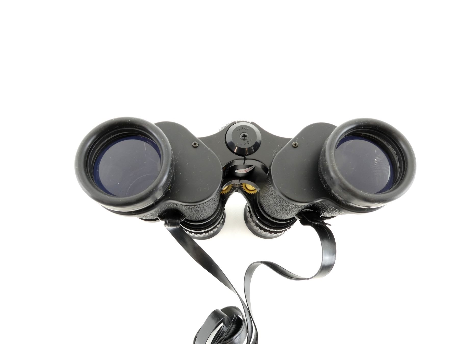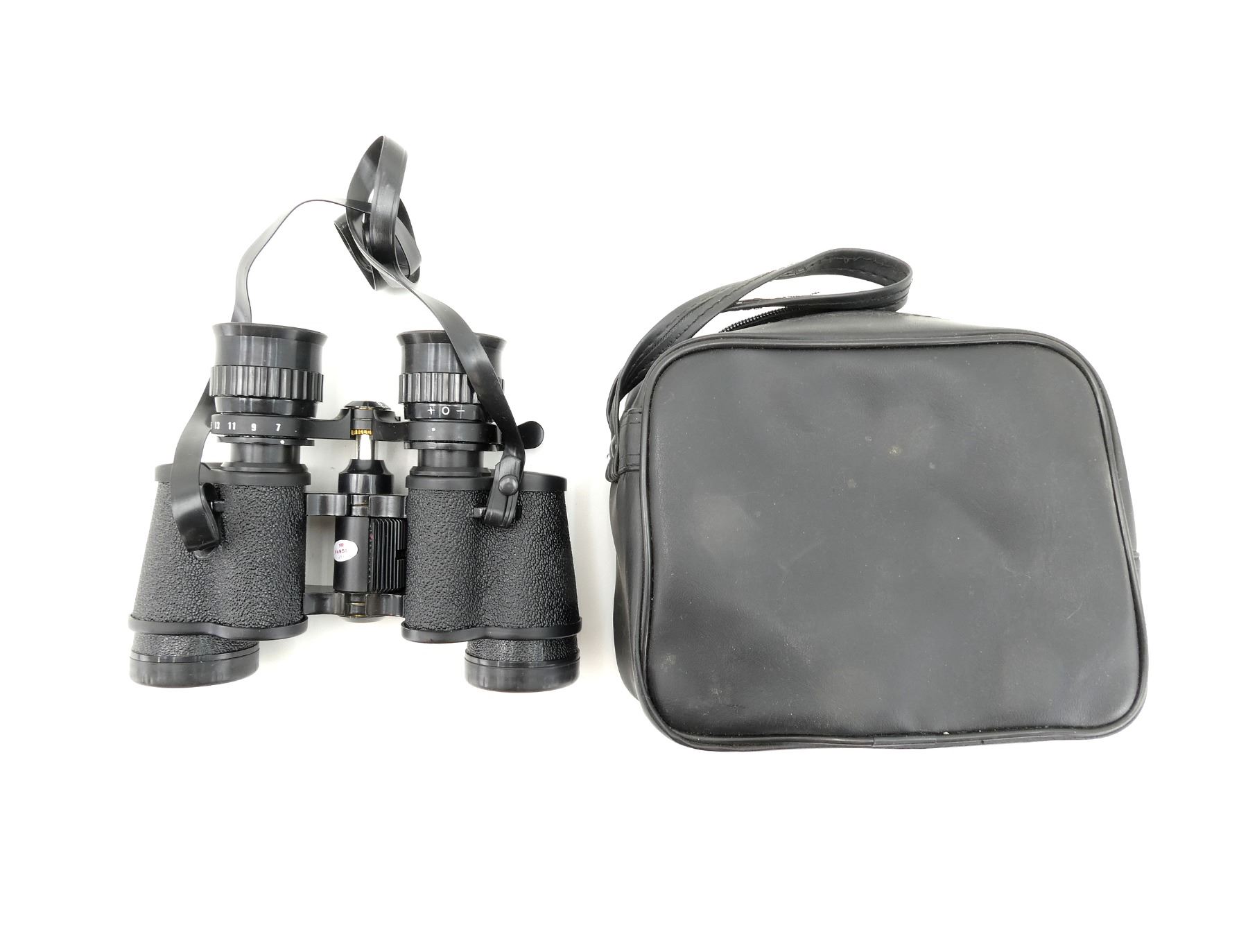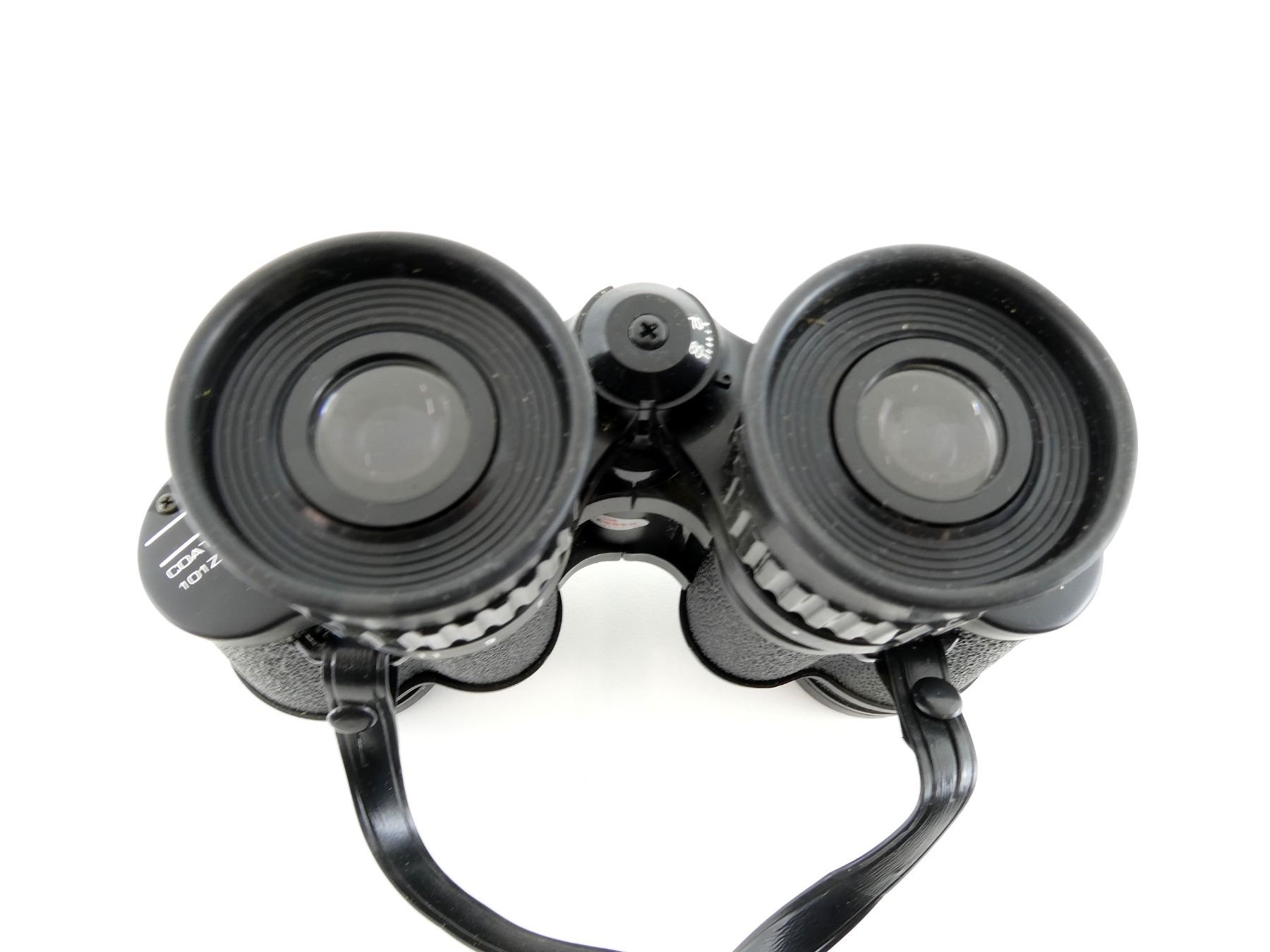 (1) CLEAR OPTICS, WORKING FOCUS DIAL, MARKED "290FT AT 1000YDS AT 7X", "97M/1000M AT 7X", WITH NECK LANYARD, LENS COVERS & CARRY CASE, SHOWS WEAR & TEAR / USE MARKINGS. SEE PHOTOS.