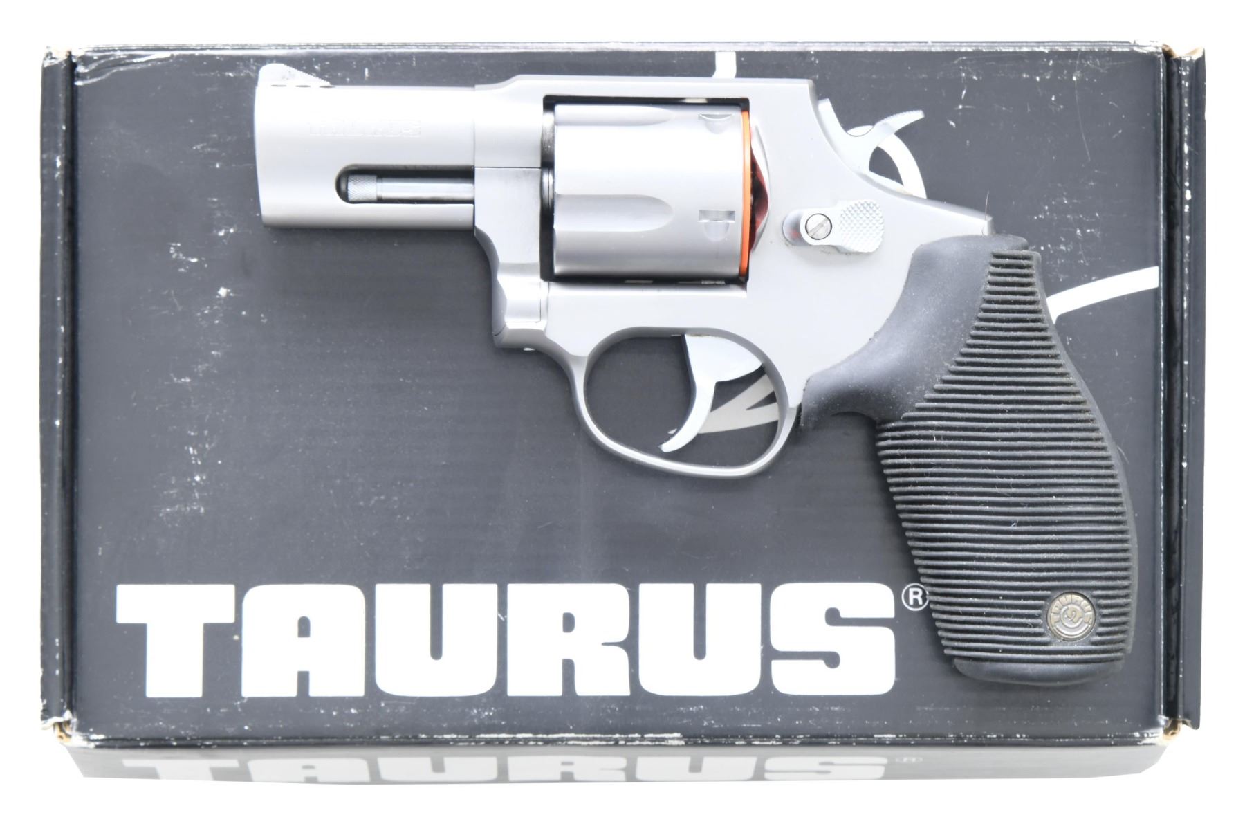 Cal. 41 Mag. S# SH753857. Bbl. 2 1/2" ported. Ramped serrated blade front sight. Fixed rear sight. 5-shot cyl. Stainless finish. Grooved black rubber grips with Taurus medallions. UNATTACHED ACCESSORIES: matching numbered factory box with manual, paperwork & key for internal locking system. CONDITION: metal & grips show scattered light handling marks. Action functions properly when hand cycled. Bright near excellent bore. (25-3392/MJC). MODERN. $300-500.