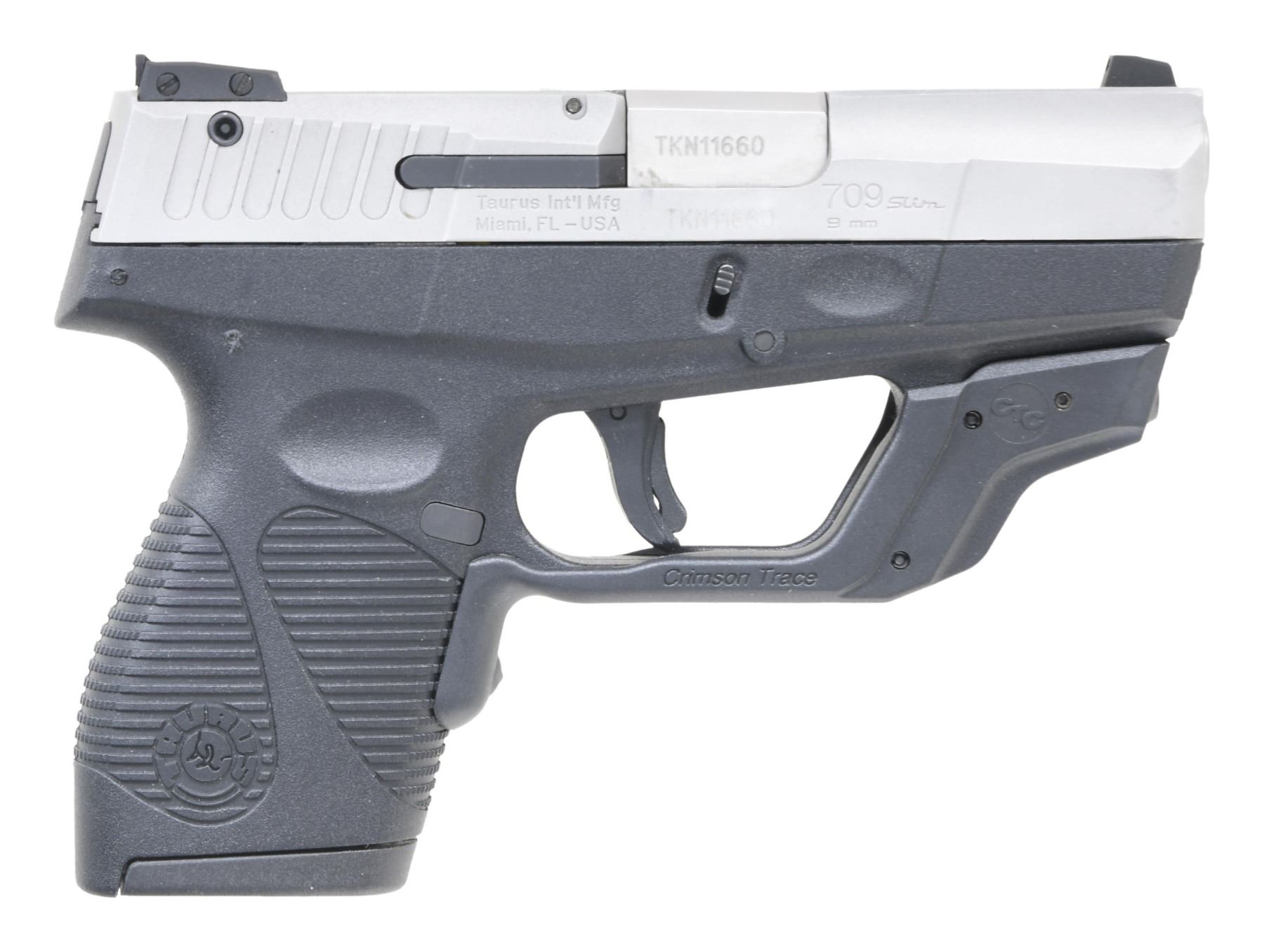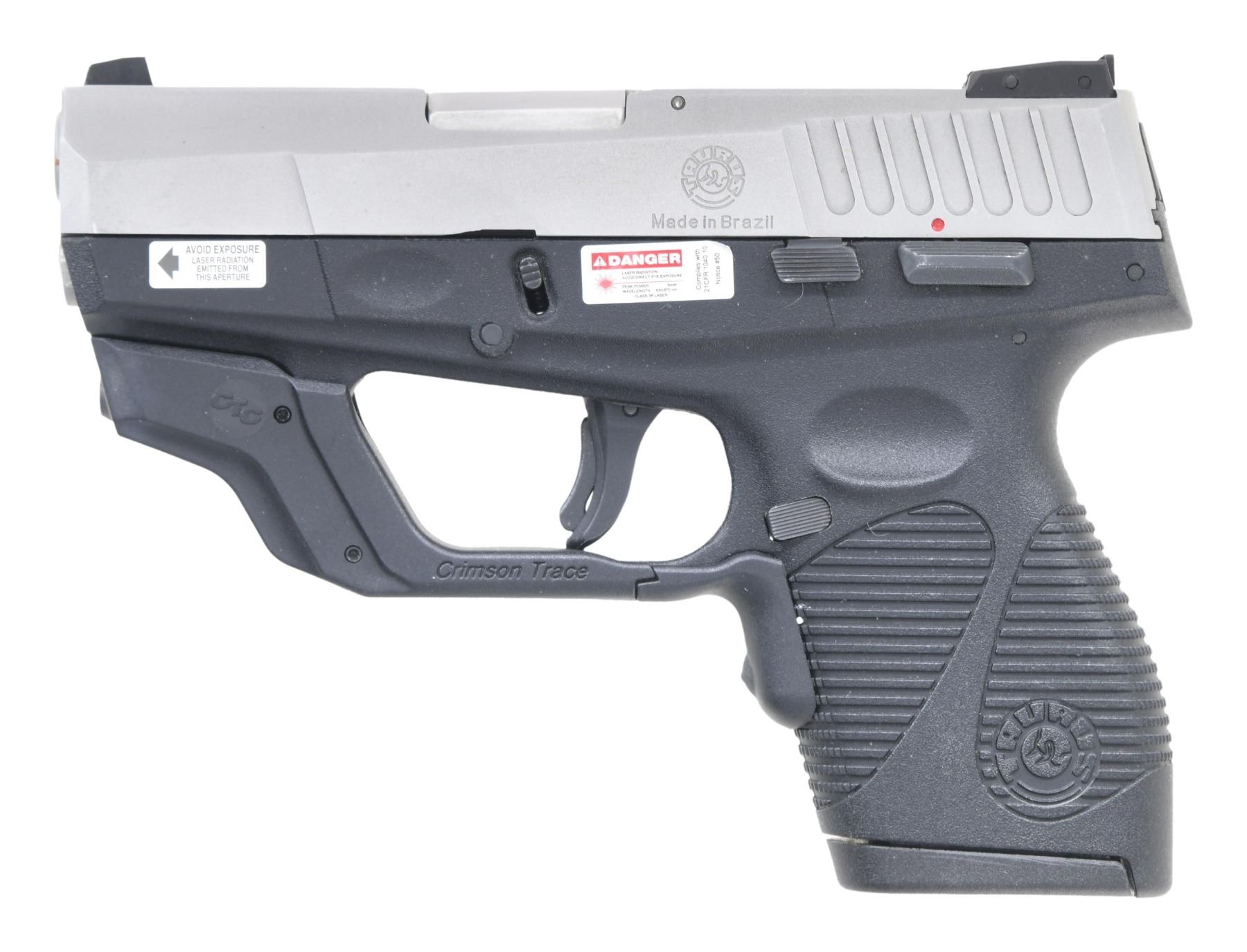 Cal. 9mm Luger. S# TKN11660. Bbl. 3 1/5". Three dot sights with adjustable rear. Matte stainless slide. Black polymer frame. Crimson Trace laser on trigger guard. MAGS: 1-7 rd. UNATTACHED ACCESSORIES: black leather carrying case. CONDITION: frame & slide show light handling & operational wear. Action functions properly when hand cycled. Very good + bore. (25-2413/MJC). MODERN. $300-500.