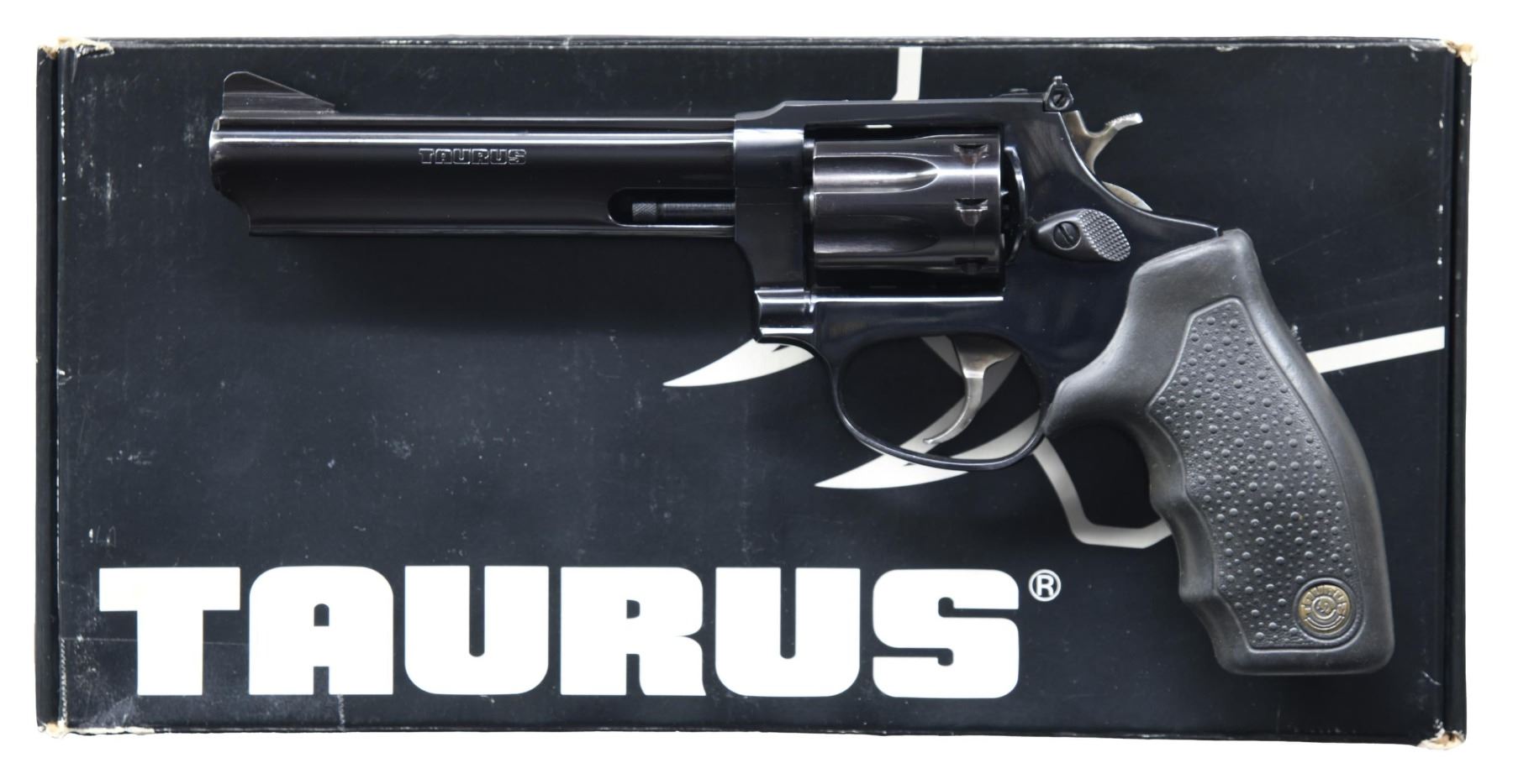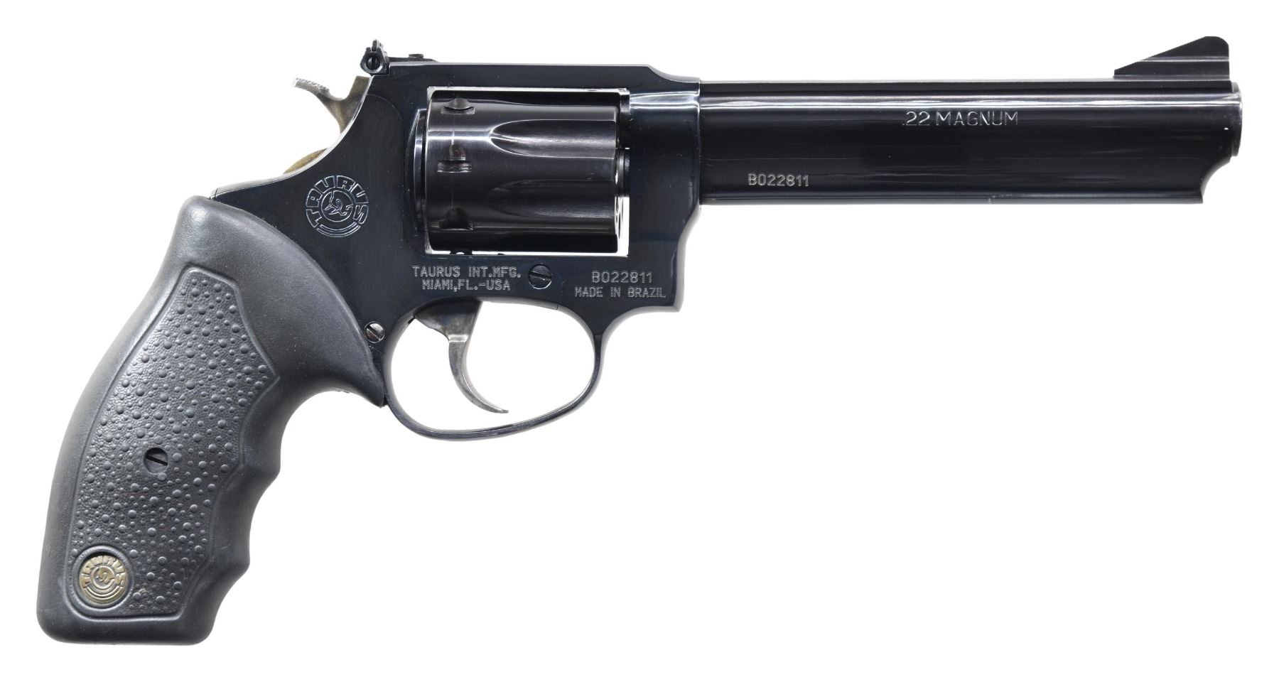 Cal. 22 Mag. S# B022811. Bbl. 5". Ramped serrated blade front sight. Adjustable square notch rear sight. 8-shot cyl. Blued finish with case colored hammer & trigger. Finger groove grips with Taurus medallions. UNATTACHED ACCESSORIES: matching numbered factory box with manual. CONDITION: grips show light handling wear. Metal retains 98% original blue with some edge wear on both sides of muzzle. Action functions properly when hand cycled. Bright near excellent bore. (25-3395/MJC). MODERN. $200-300.