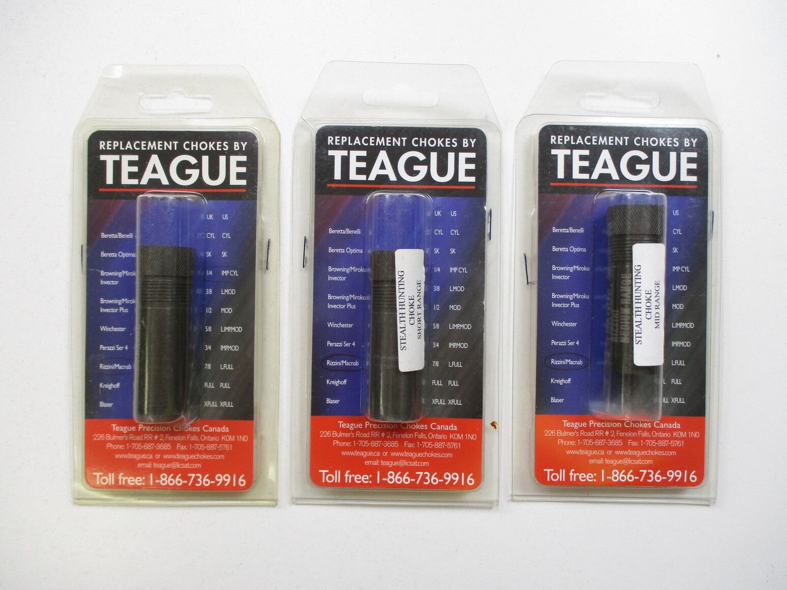 TEAGUE RIZZINI 12 GAUGE HUNTING SHOTGUN CHOKES , LOT OF 3. EXTENDED STYLE, STEEL, INCLUDES: (1) LONG RANGE, (1) MID RANGE, (1) SHORT RANGE, IN ORIGINAL PACKAGE.