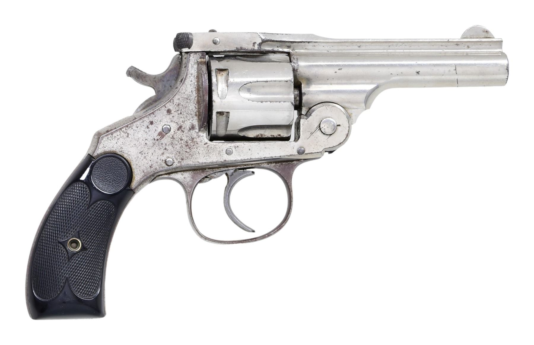 Cal. 32 S&W. S# 60229. Bbl. 3 1/4". Round blade front sight. U-notch rear sight. Thames Arms revolver made in early 1900's in Norwich, CT. Nickel finish. Checkered black hard rubber grips. CONDITION: grips show some handling marks. Metal retains 80% nickel with scattered flaking, handling marks, pitting & oxidation. Cyl. has some notable play & appears to have a timing issue. Pitted bore with evident rifling. (25-1586/MJC). CURIO. $150-250.