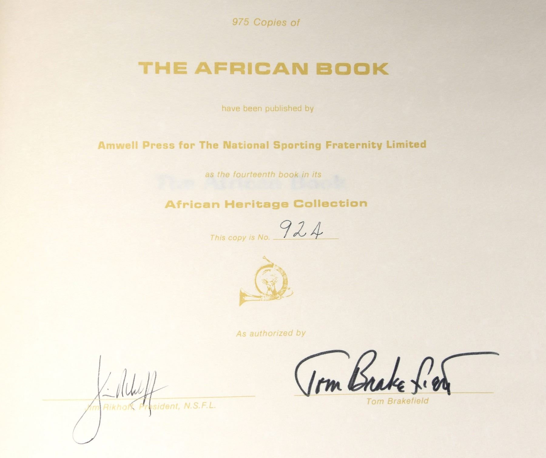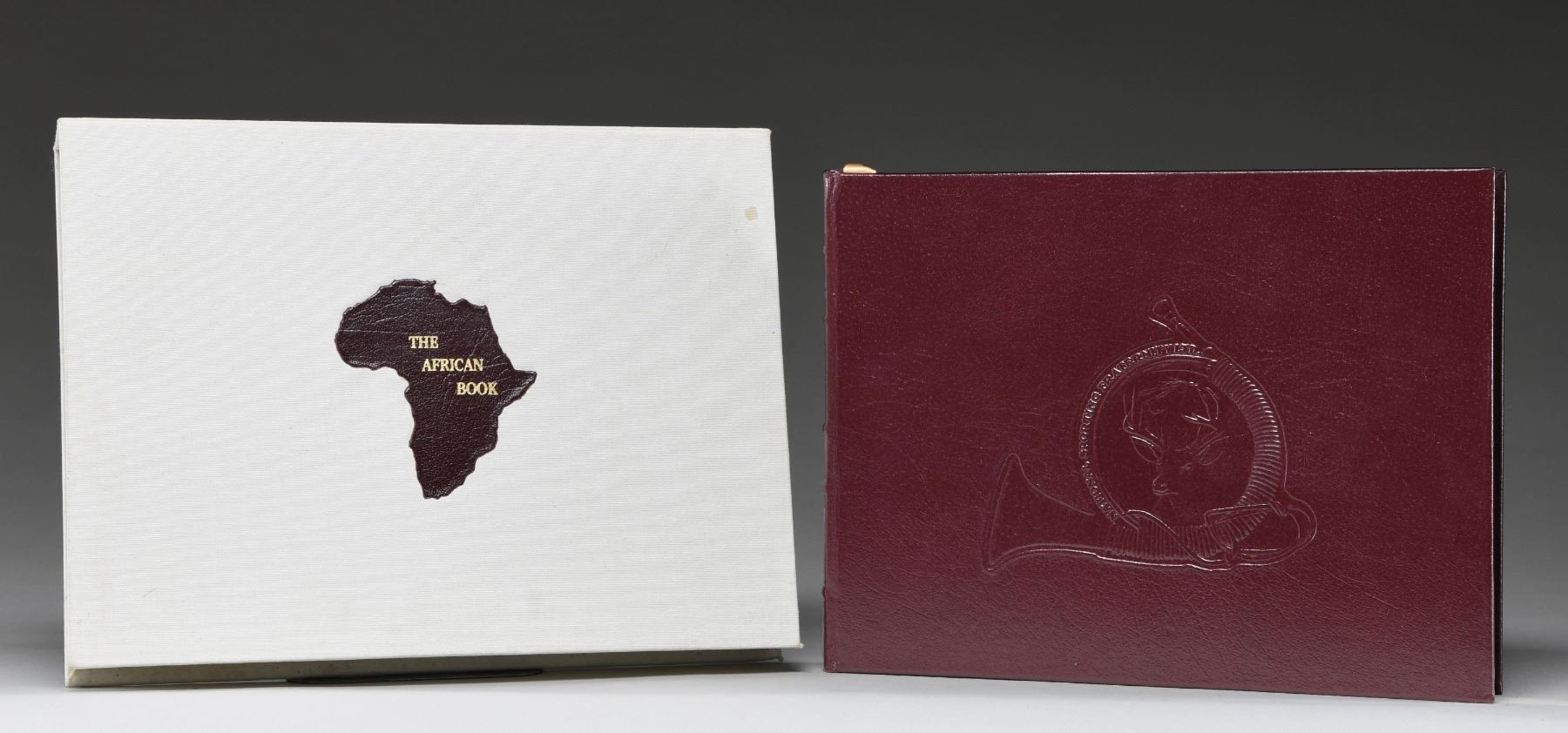 1 of 975 copies of "The African Book" by the Amwell Press for the National Sporting Fraternity Limited. Book is numbered "924" on the interior. Brown leather cover, with canvas wrapped hard case. CONDITION: book is excellent overall. Hard case shows some wear and spots of discoloration, but otherwise remains sturdy and serviceable. PROVENANCE: From the Estate of Jon Thomas, Gunsport, LTD. (02-24069/MLW). $100-200.