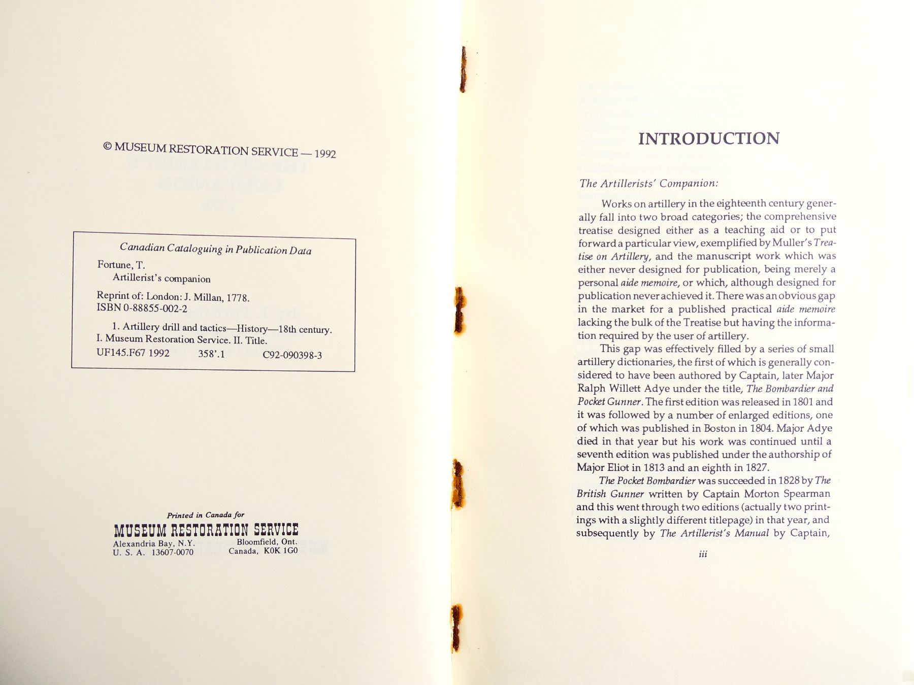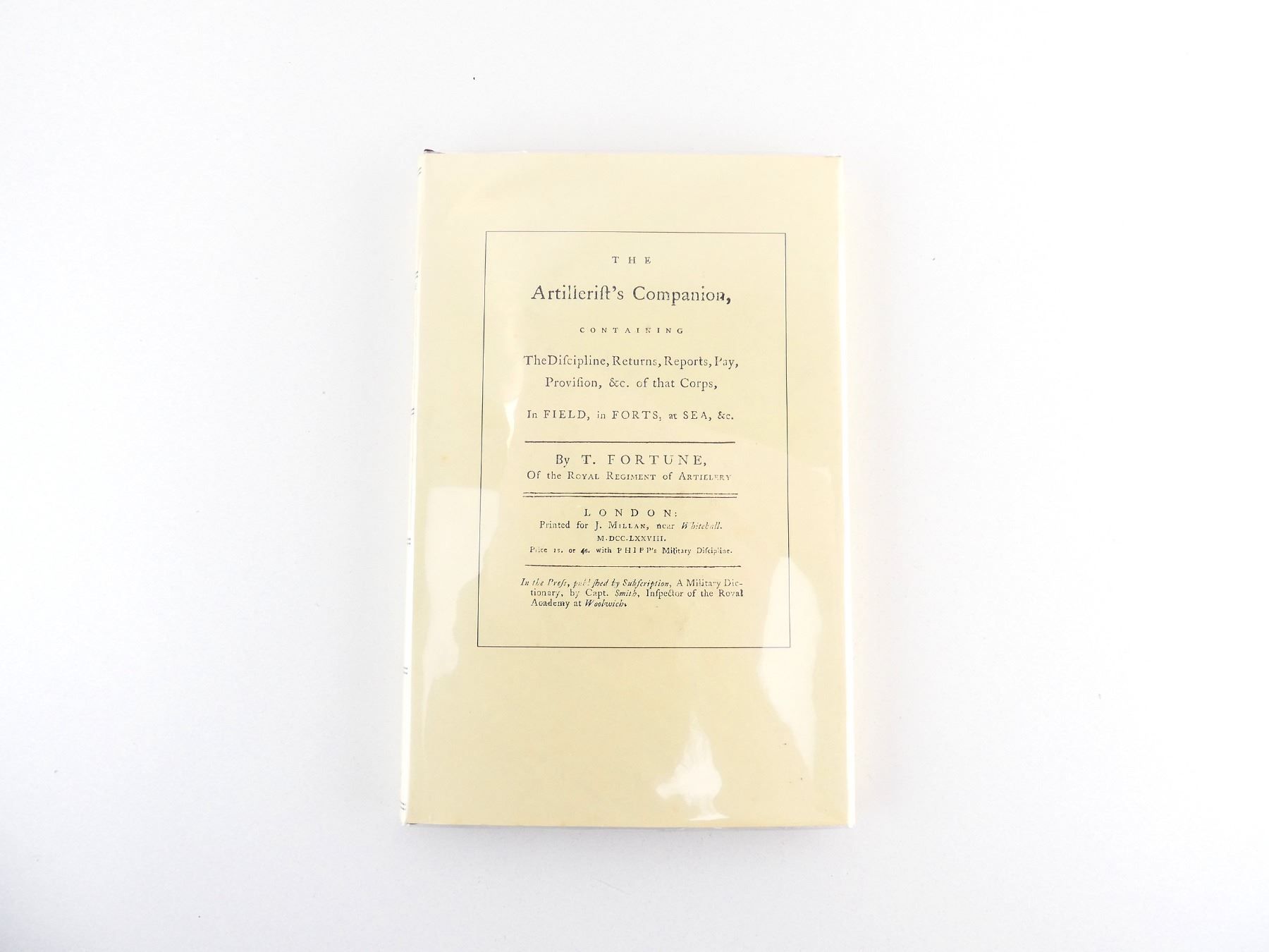 (1) "THE ARTILLERIST'S COMPANION 1778, CONTAINING THE DISCIPLINE, RETURNS, REPORTS, PAY, PROVISION, &C. OF THAT CORPS, IN FIELD, IN FORTS, AT SEA, &C." BOOK BY T.FORTUNE, OF THE ROYAL REGIMENT OF ARTILLERY, REPRINT, HARD COVER WITH DUST COVER, ISBN: 0-88855-002-2. SEE PHOTOS.