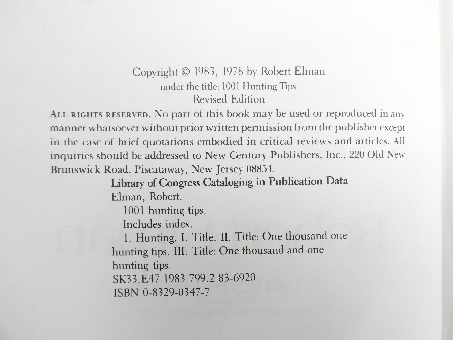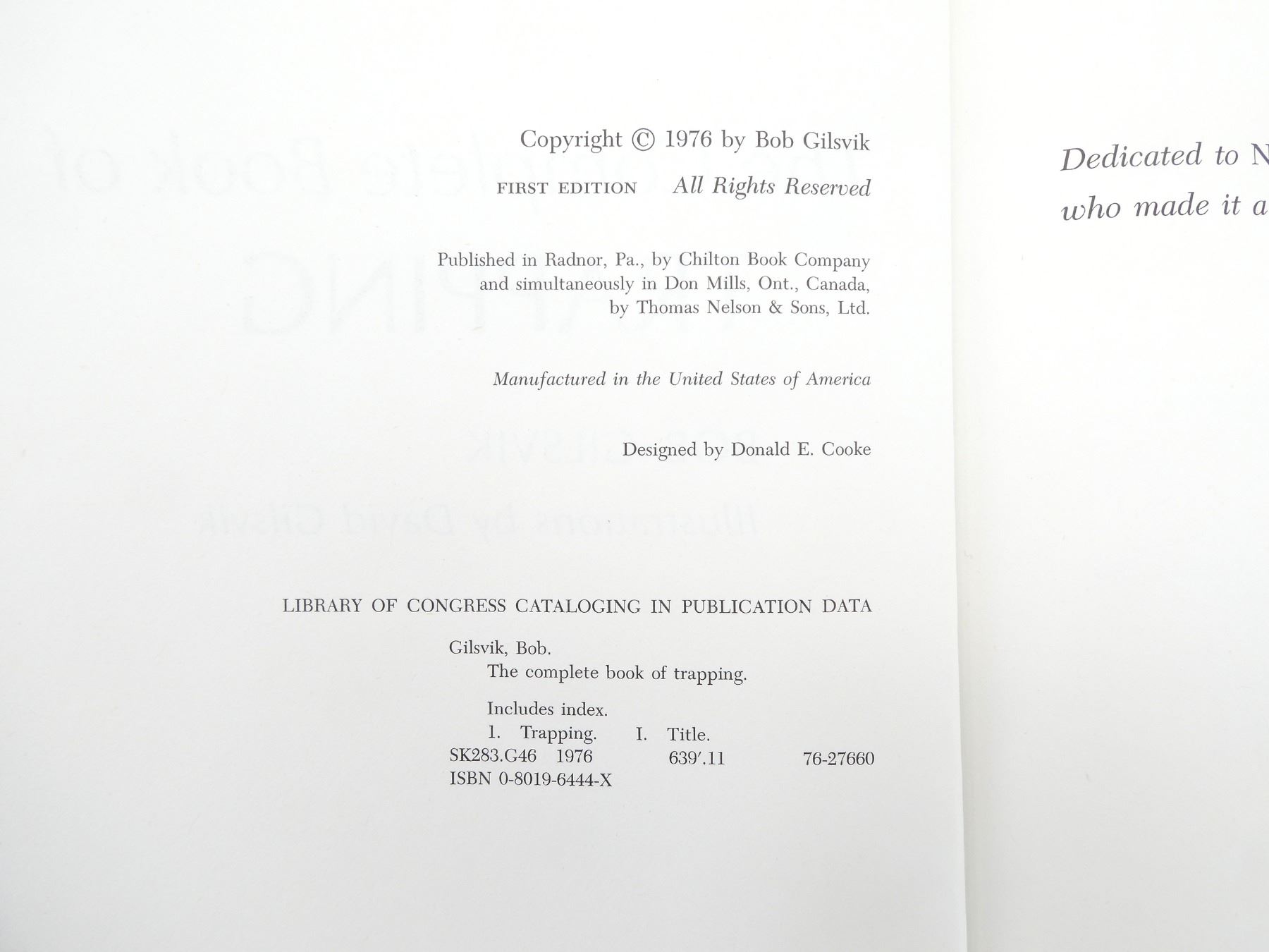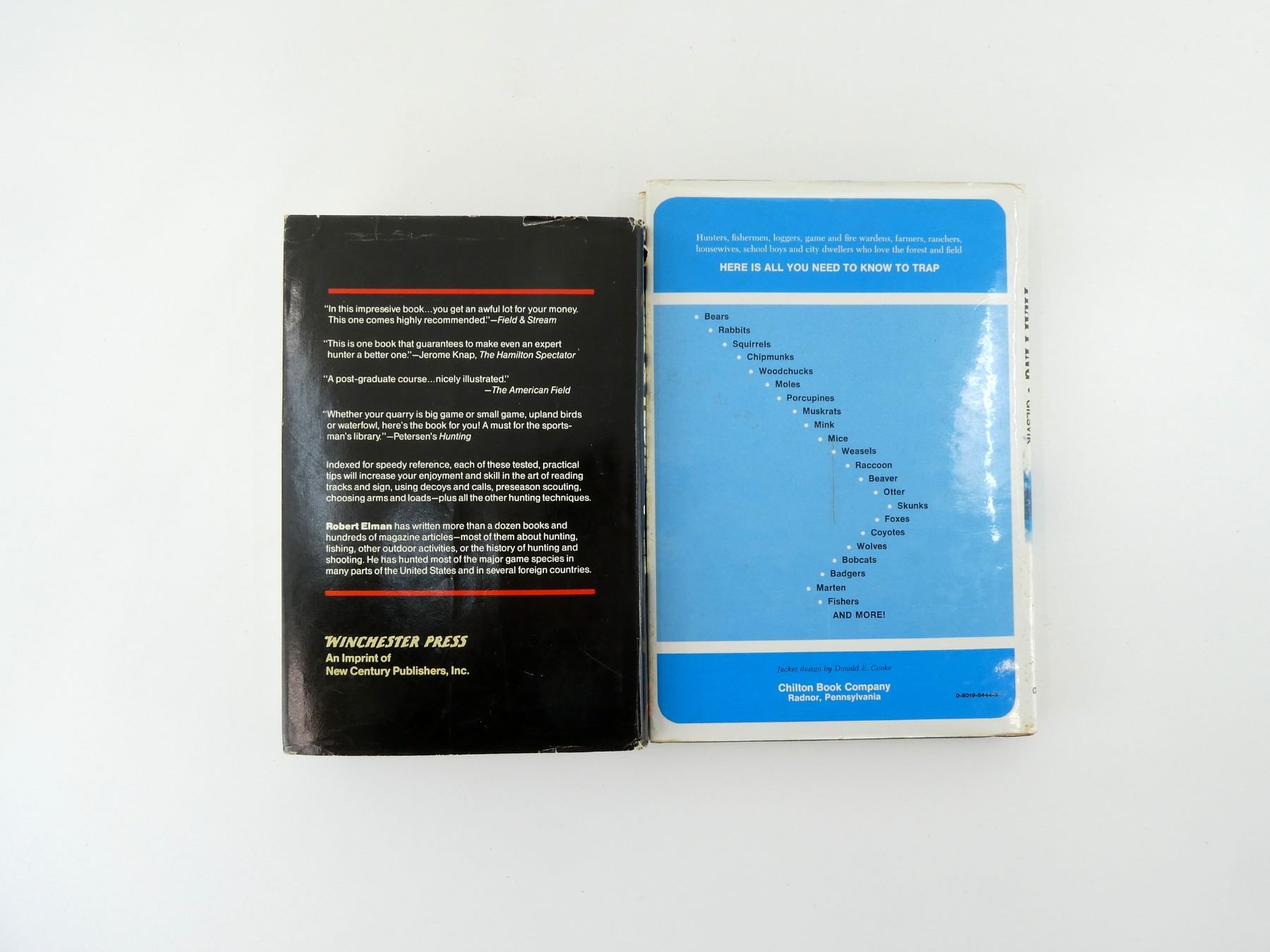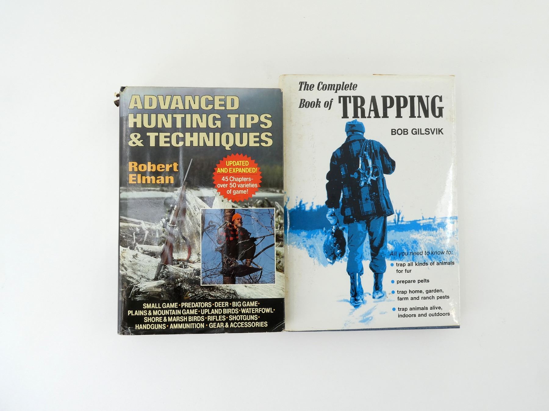 LOT INCLUDES; (1) "THE COMPLETE BOOK OF TRAPPING" BY BOB GILSVIK, HARD COVER WITH DUST COVER, ISBN: 0-8019-6444-X & (1) "ADVANCED HUNTING TIPS & TECHNIQUES" BOOK BY ROBERT ELMAN, HARD COVER WITH DUST COVER, ISBN: 0-8329-0347-7. SEE PHOTOS.