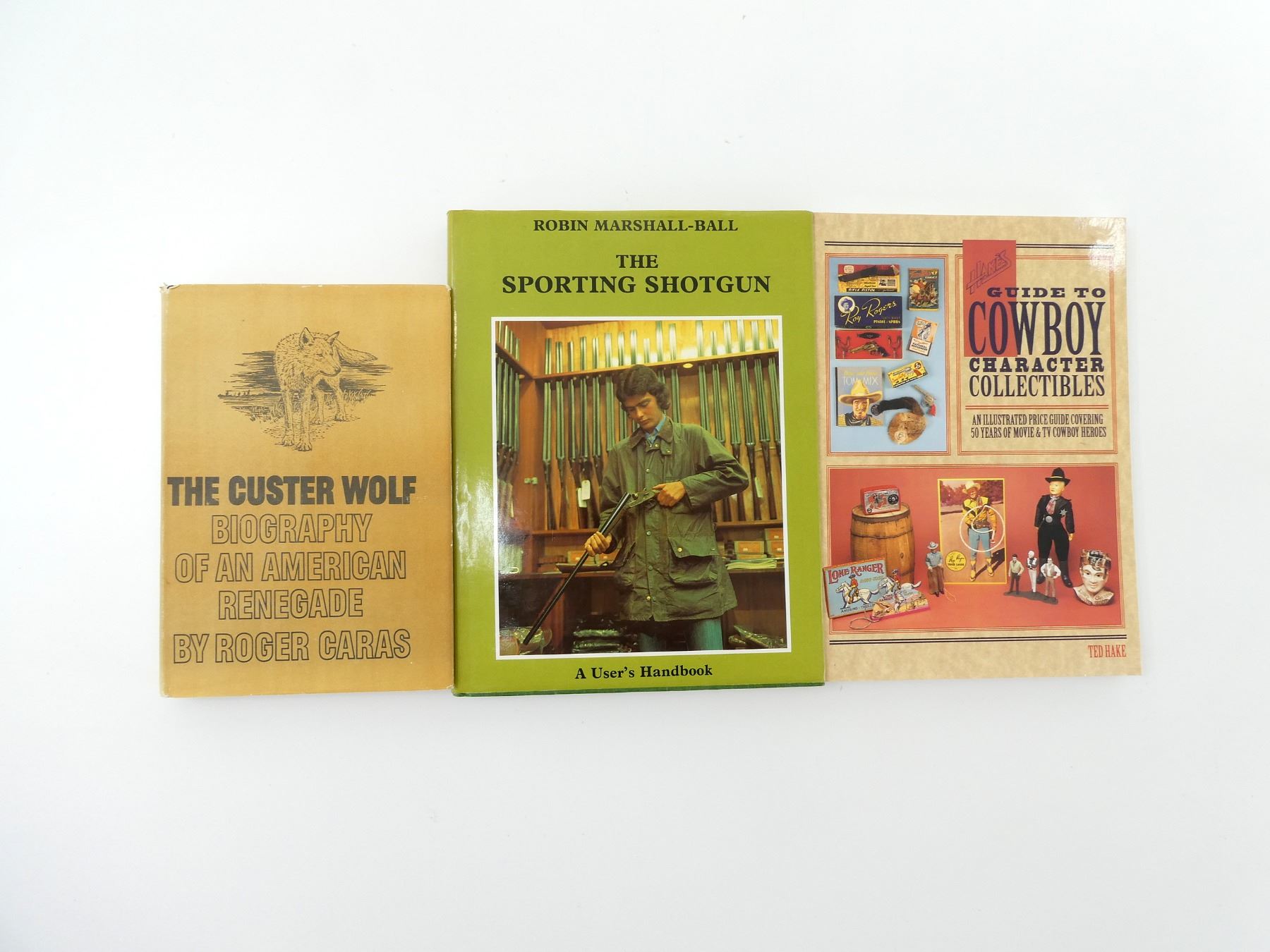 LOT INCLUDES; (1) "THE CUSTER WOLF" BOOK BY ROGER CARAS, HARD COVER WITH DUST COVER, COPYRIGHT 1966, (1) "HAKE'S GUIDE TO COWBOY CHARACTER COLLECTIBLES" BOOK BY TED HAKE, SOFT COVER, ISBN: 0-87069-647-5 & (1) "THE SPORTING SHOTGUN" BOOK BY ROBIN MARSHALL-BALL, HARD COVER WITH DUST COVER, ISBN: 0-86230-0371. SEE PHOTOS.