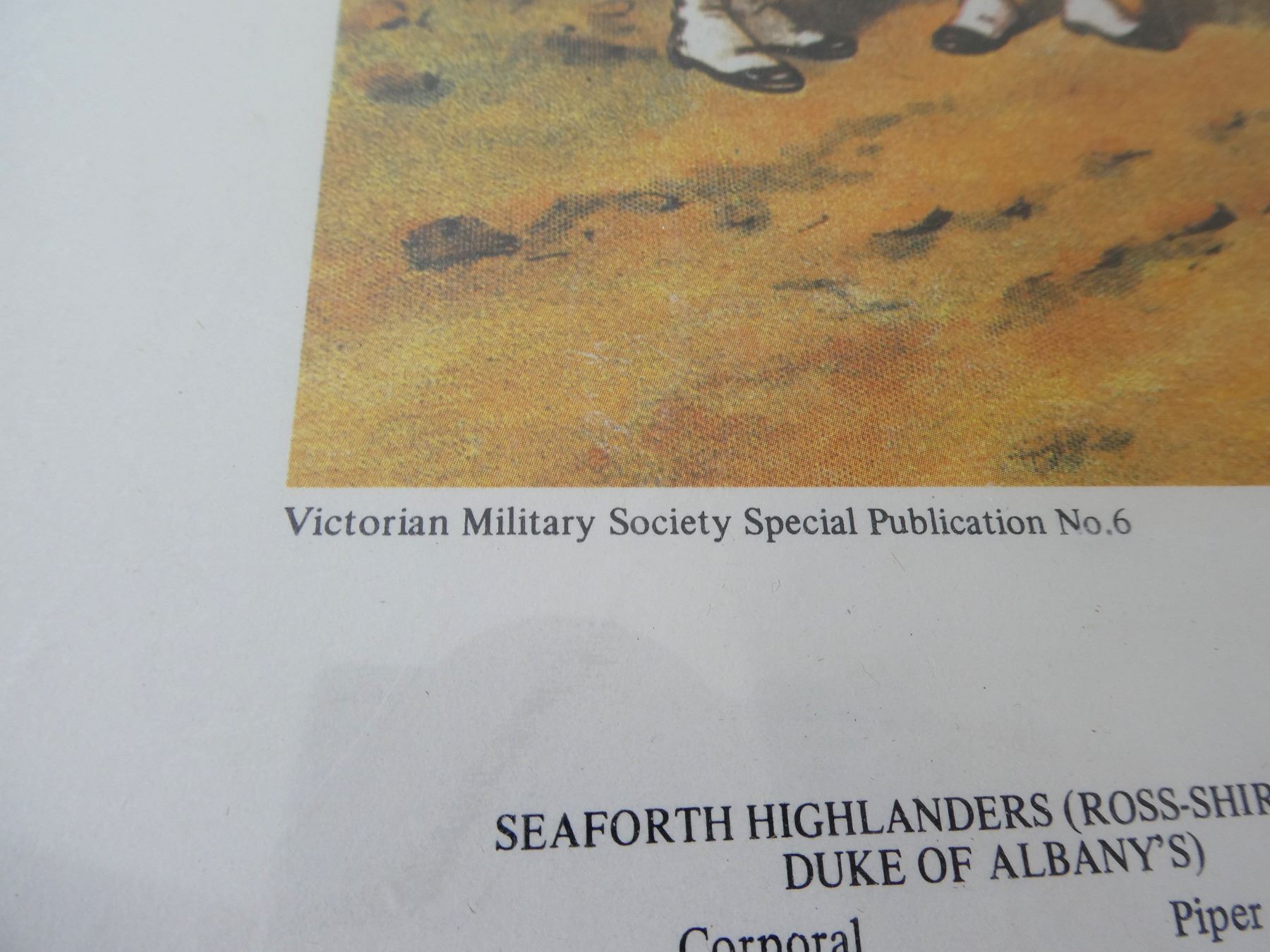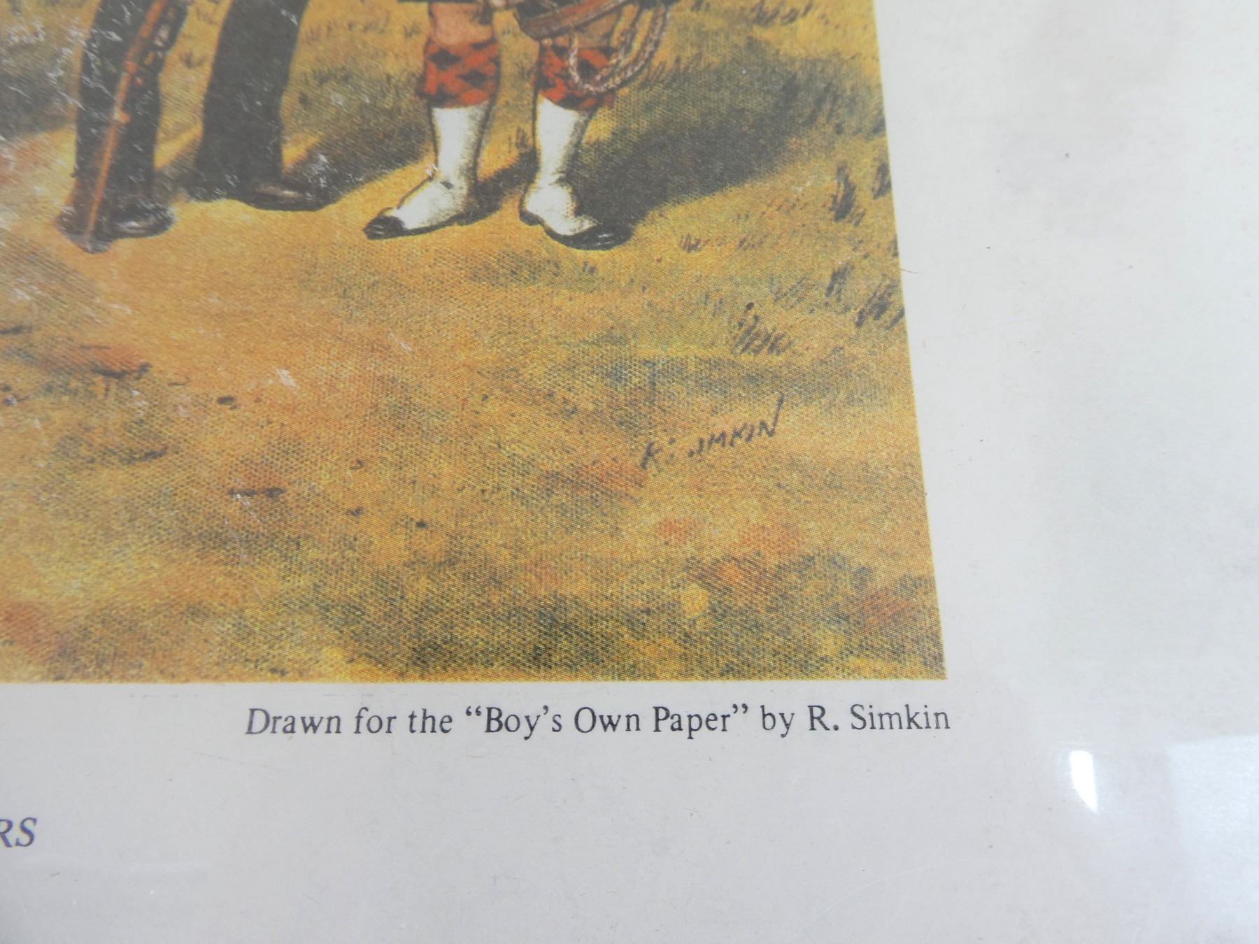 (1) DRAWN FOR THE "BOY'S OWN PAPER" BY R. SIMKIN, VICTORIAN MILITARY SOCIETY SPECIAL PUBLICATION NO.6, UNDER PLASTIC, BLUE / GOLD COLOURED PLASTIC FRAME, TOP EDGE OF FRAME MISSING, SOME WATER DAMAGE TO PRINT, APPROX. 28.25" X 22.25". SEE PHOTOS.