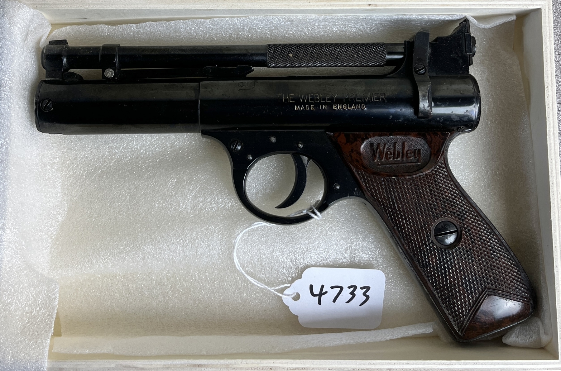 CONDITION: G OVERALL INCL BORE. NOTE SHOWS 2 X'S CRUDLEY ENGRAVED ON HEEL OF GRIP, LEFT GRIP SCALE CHIPPED. SPECS: 6-1/2IN BBL. <500FPS. EXTRAS: WOODEN CASE. S/N: 249