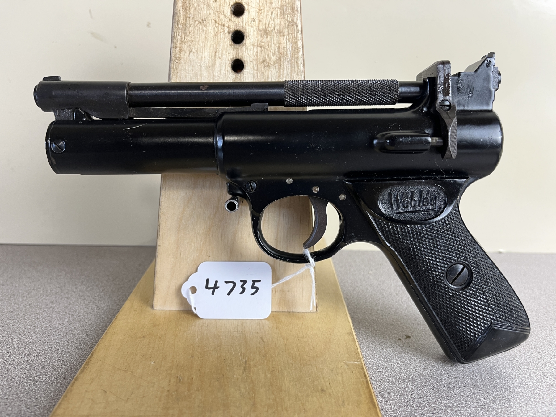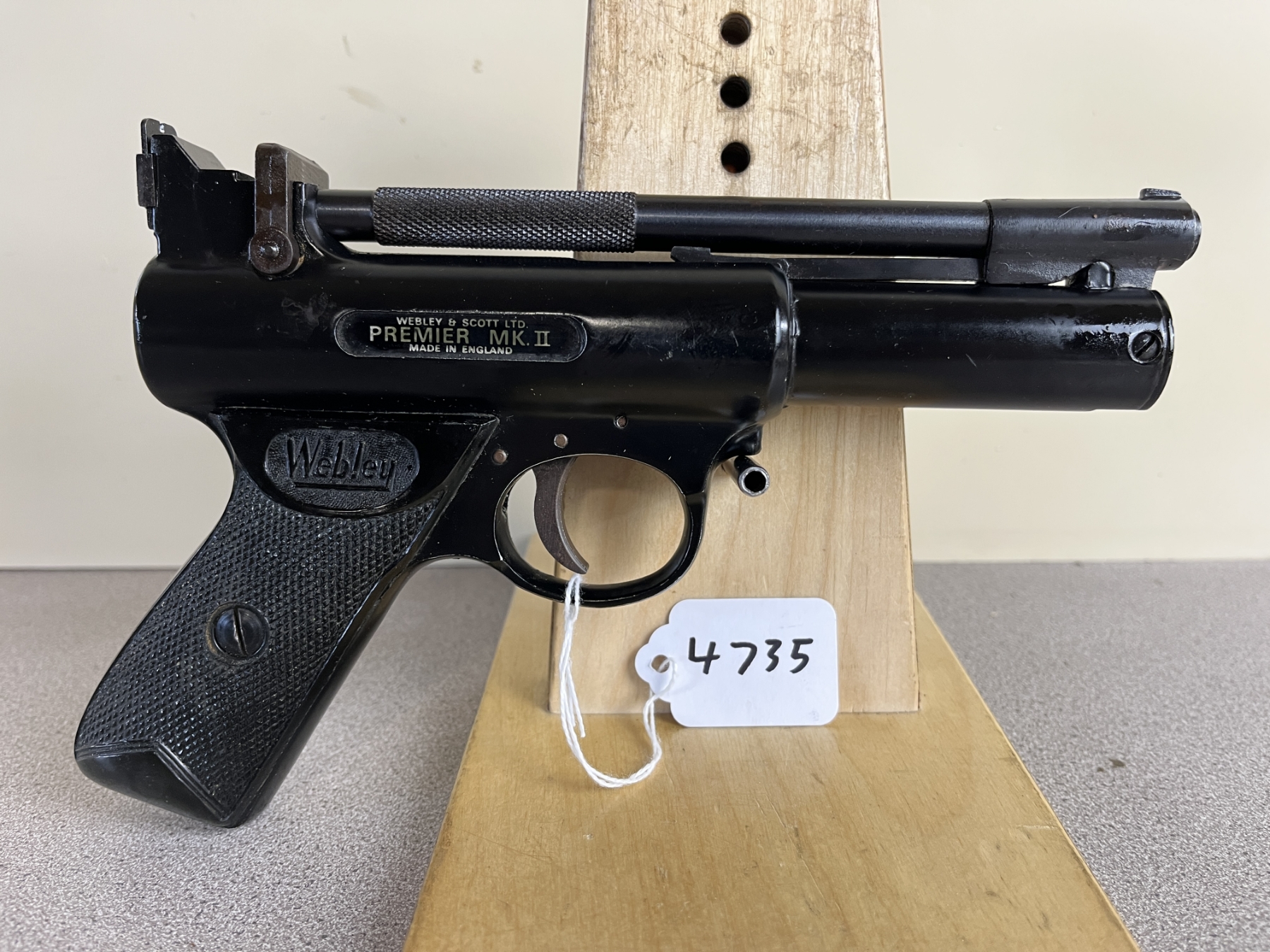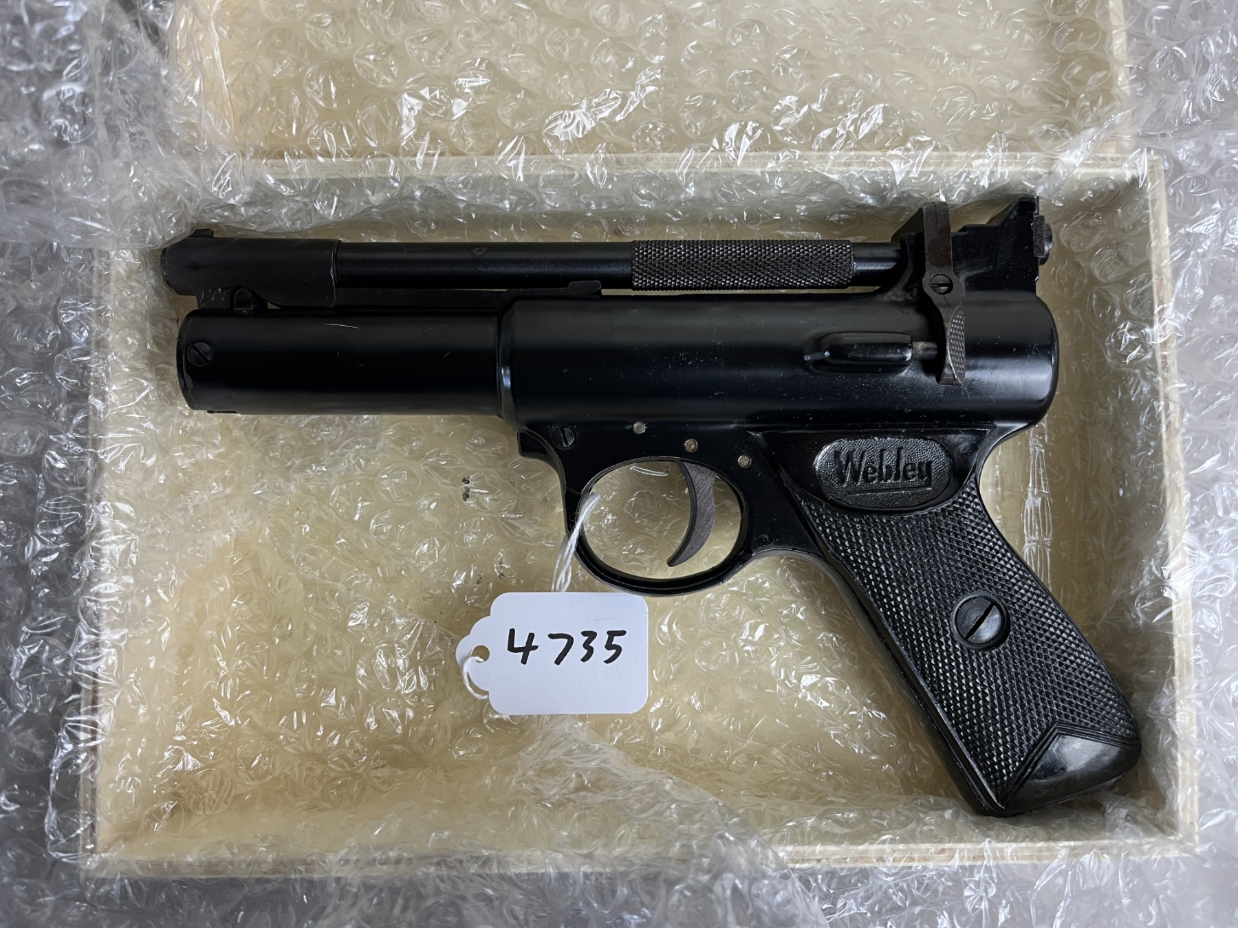 CONDITION: G-VG OVERALL INCL BORE. SPECS: 6-3/4IN BBL. <500FPS. EXTRAS: WOODEN BOX. S/N: 474
