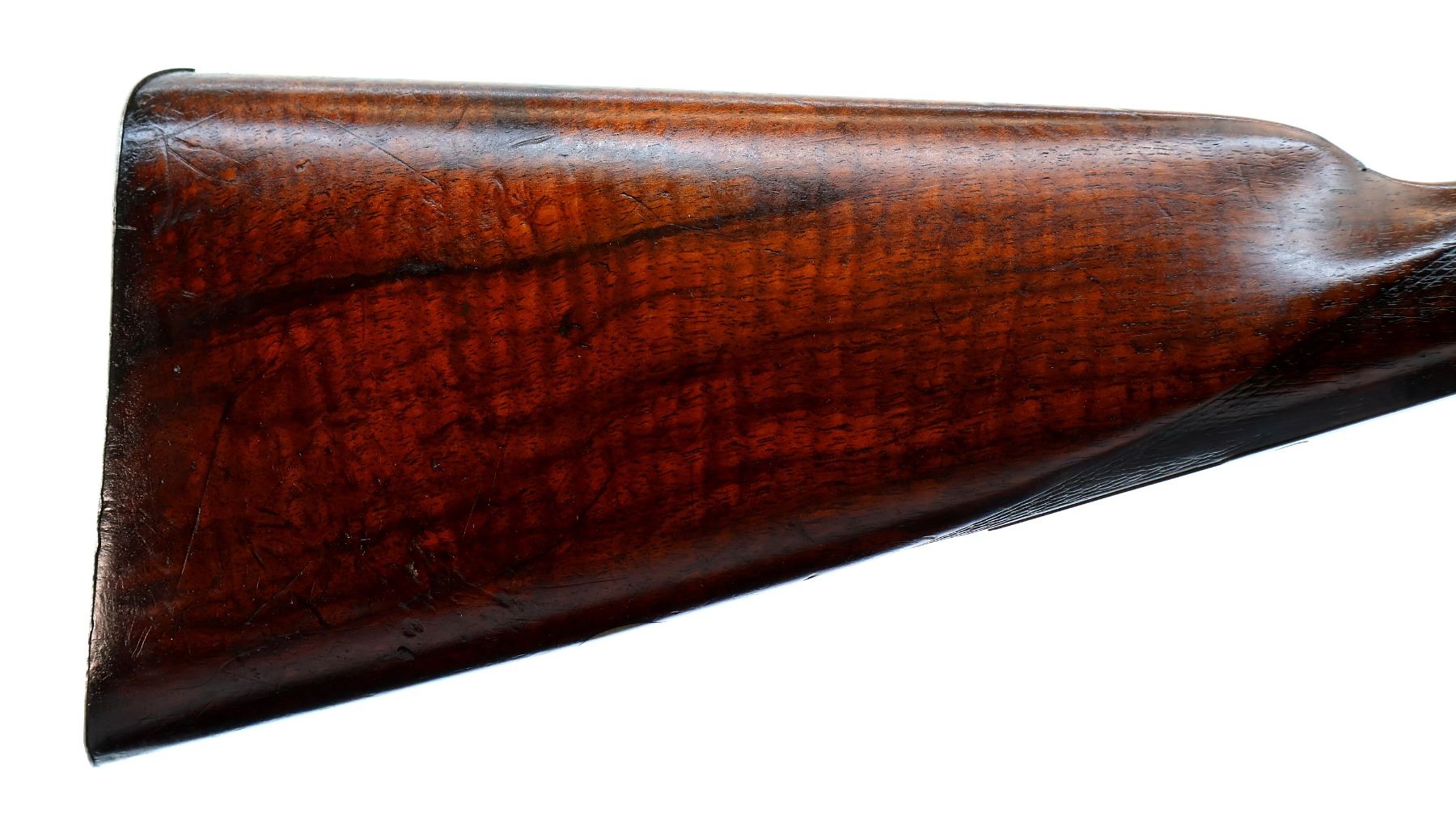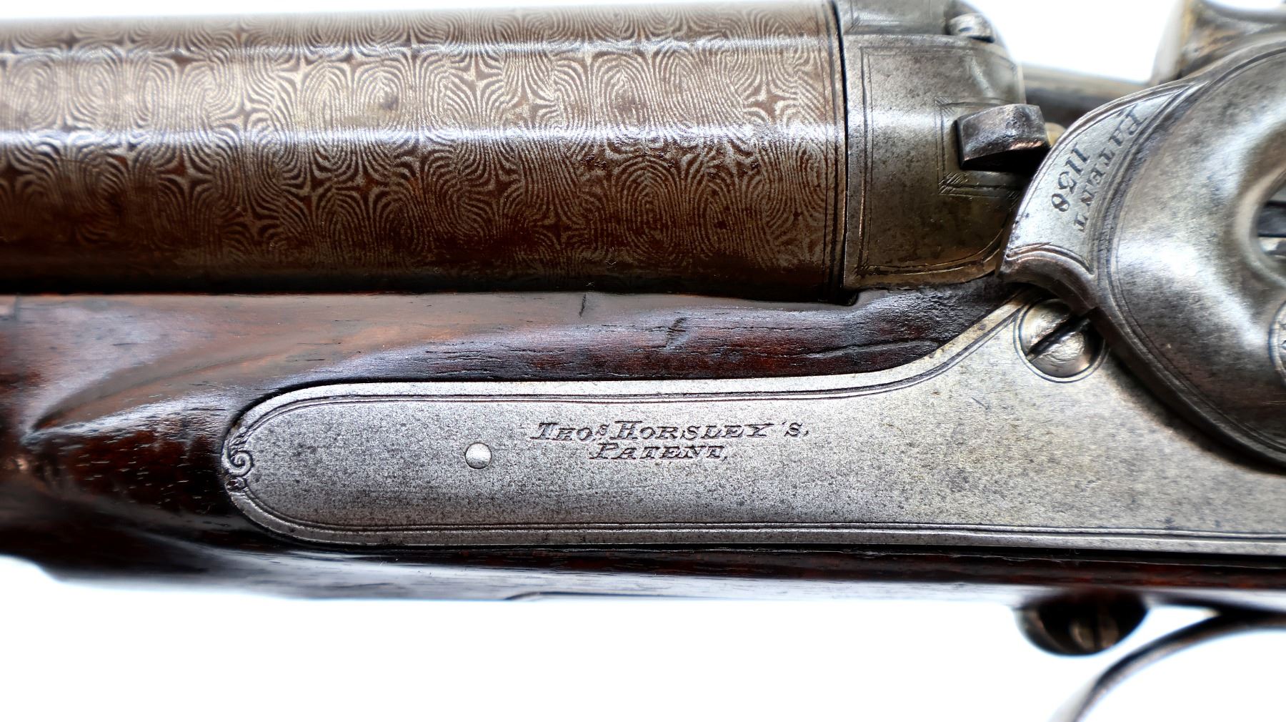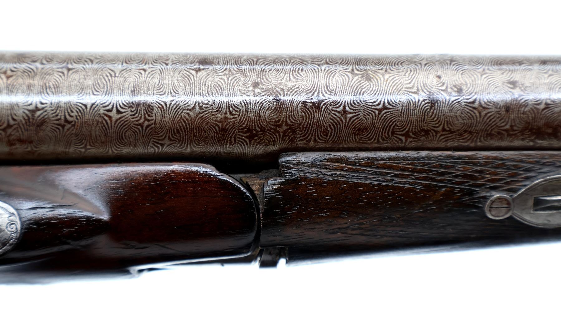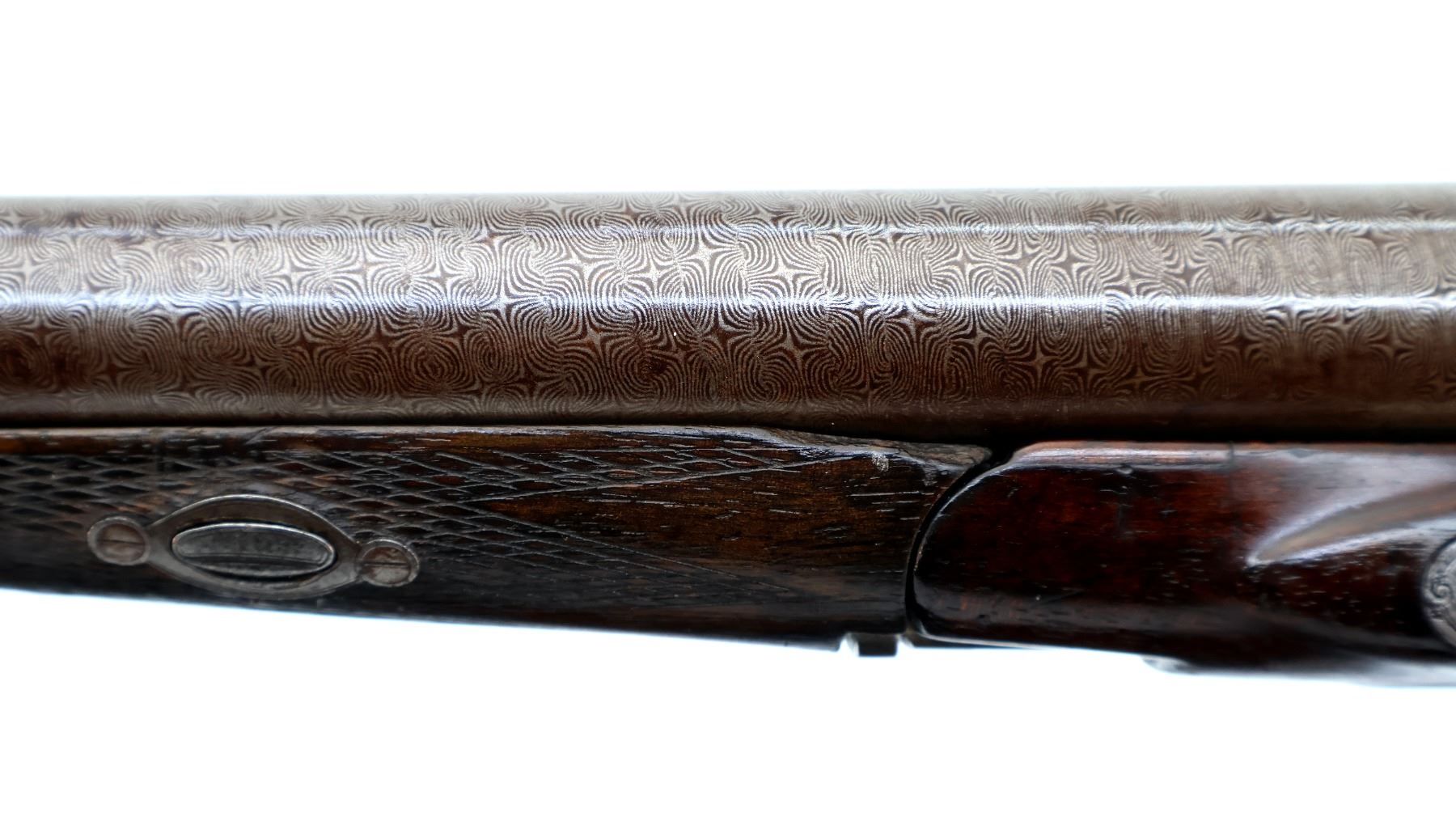 Main Description: Silver bead, Damascus barrels with smooth rib that are tight on face, small receiver with checkered sliding opening lever on top tang, side locks with checkered spur hammers that function, extractor, double triggers. Two piece wood stocks, checkered forearm which is cracked and repaired with single wedge, checkered straight grip, stock cracked in front of trigger guard, chipped and cracked behind right lock, smooth steel butt plate and vanity plate. Unique shotgun with receiver surrounded by wood