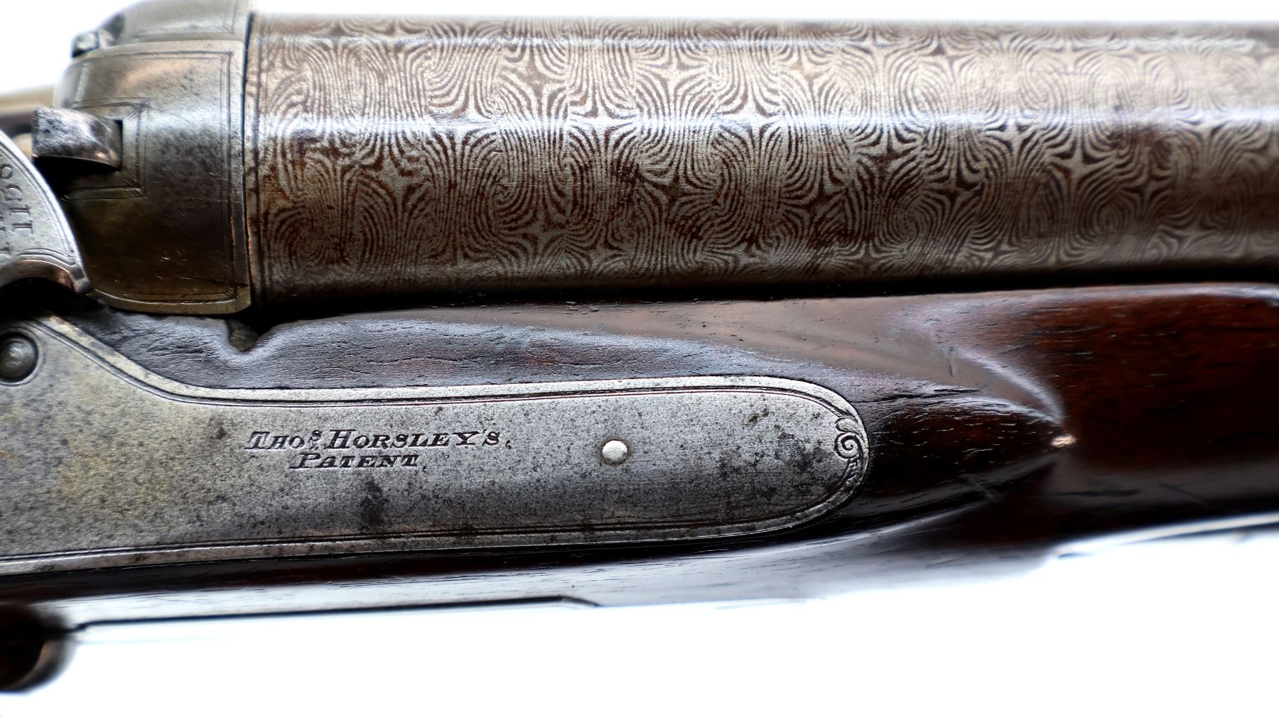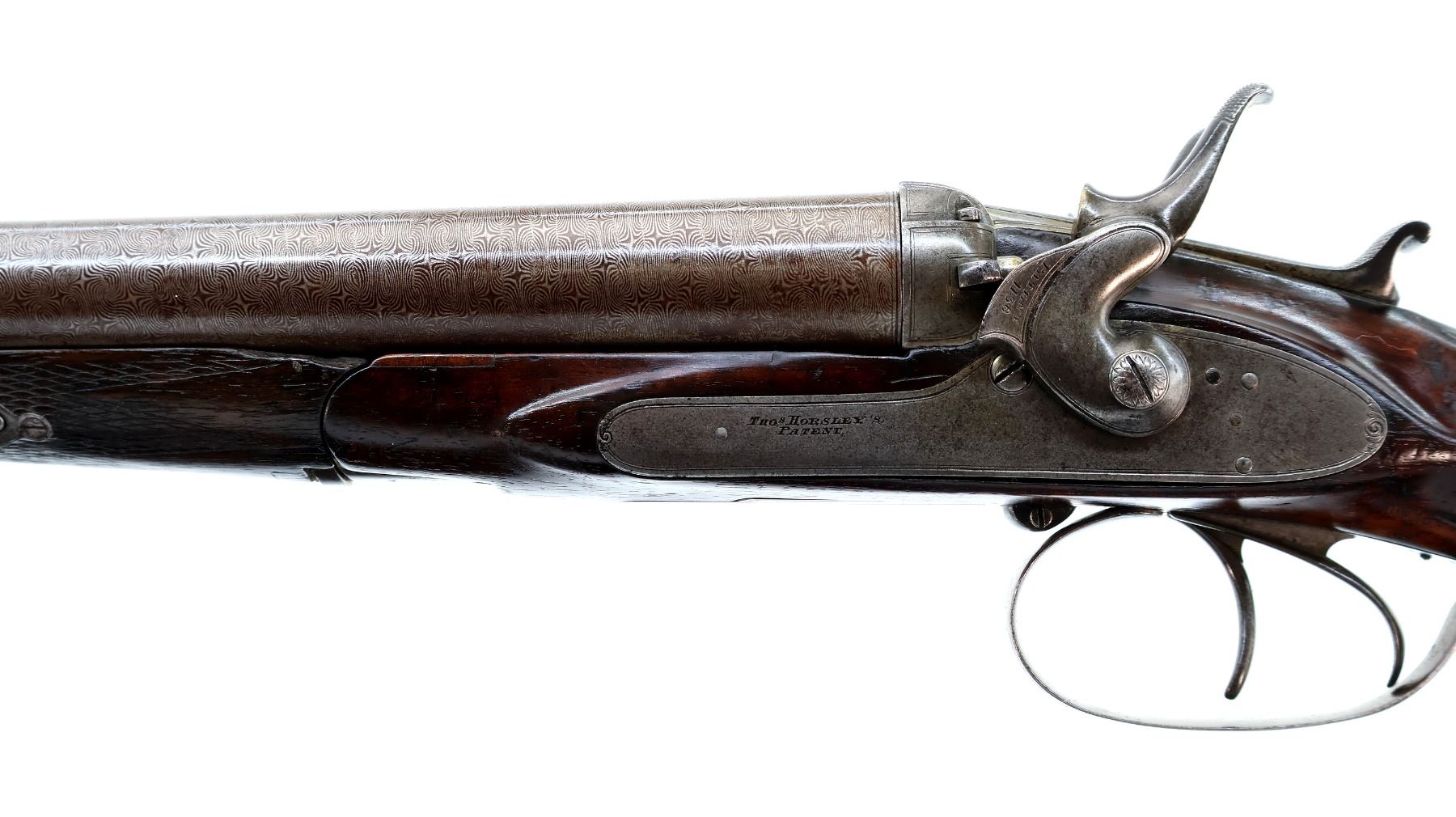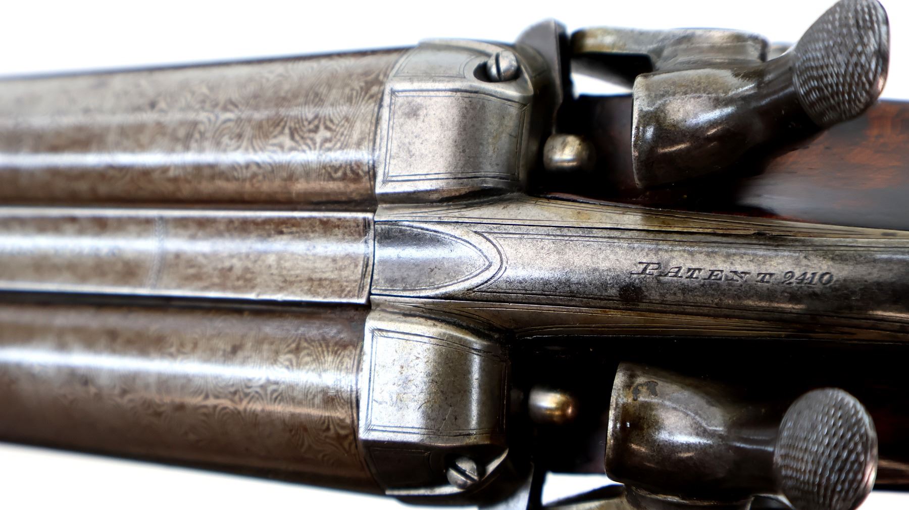 Main Description: Silver bead, Damascus barrels with smooth rib that are tight on face, small receiver with checkered sliding opening lever on top tang, side locks with checkered spur hammers that function, extractor, double triggers. Two piece wood stocks, checkered forearm which is cracked and repaired with single wedge, checkered straight grip, stock cracked in front of trigger guard, chipped and cracked behind right lock, smooth steel butt plate and vanity plate. Unique shotgun with receiver surrounded by wood