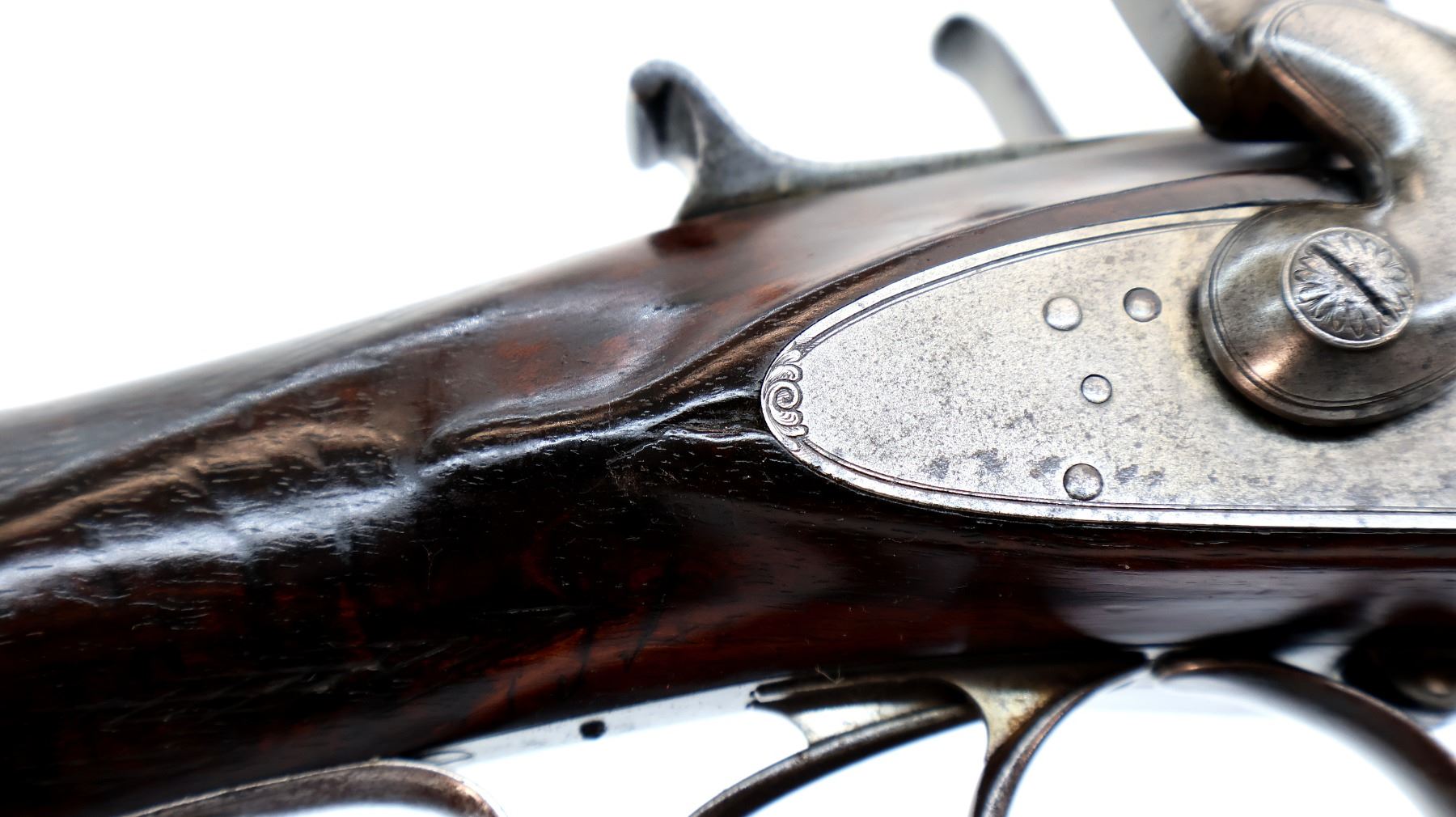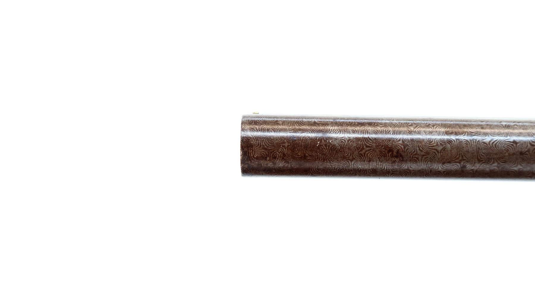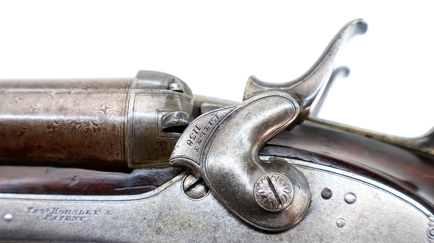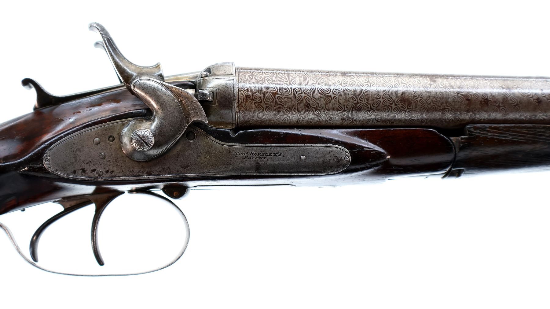 Main Description: Silver bead, Damascus barrels with smooth rib that are tight on face, small receiver with checkered sliding opening lever on top tang, side locks with checkered spur hammers that function, extractor, double triggers. Two piece wood stocks, checkered forearm which is cracked and repaired with single wedge, checkered straight grip, stock cracked in front of trigger guard, chipped and cracked behind right lock, smooth steel butt plate and vanity plate. Unique shotgun with receiver surrounded by wood
