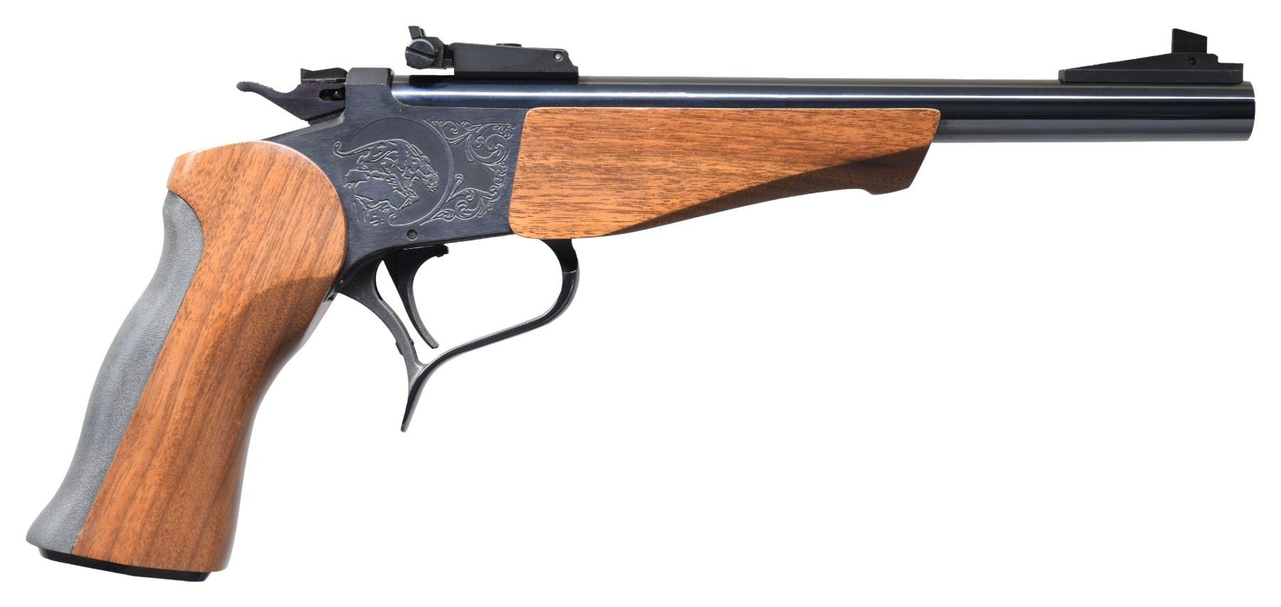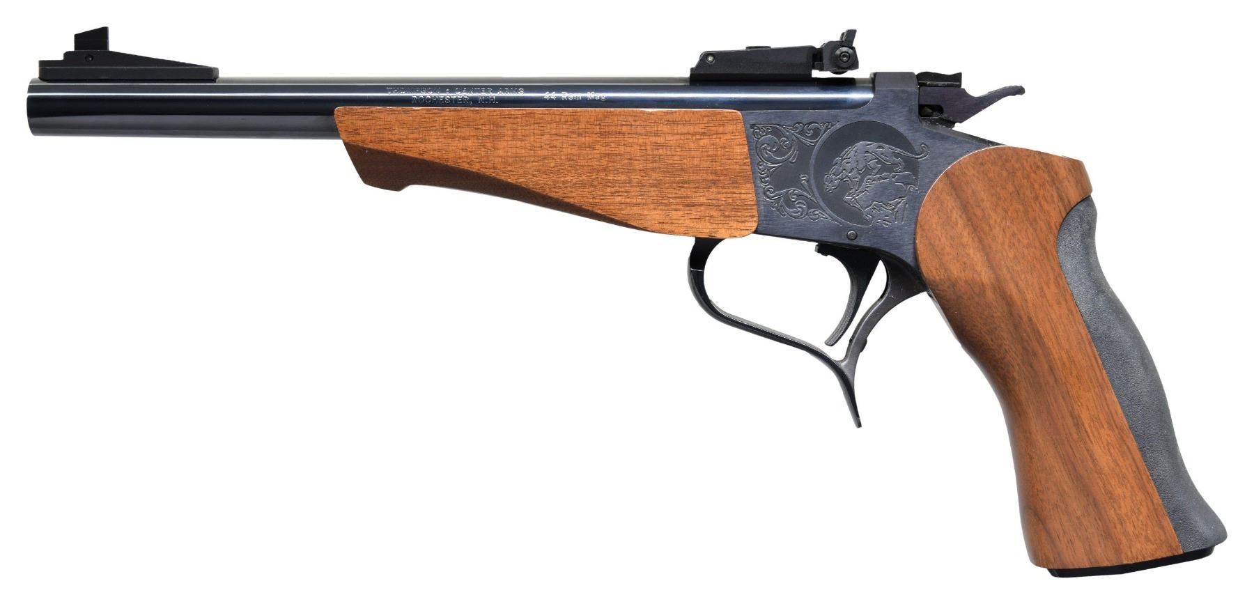 PISTOL. Cal. 44 Mag. S# 431806. Bbl. 10" bull with screw attached Patridge blade on ramped base for front sight and factory adjustable rear. Mfg. first half of 1995 (1967-2000) as blued with "Easy Open" frame. Safety and firing pin selector on top of hammer, Adjustable trigger and puma engraving on both sides of frame. Smooth walnut stock set; sculptured forend with schnable tip and Steve Herrett designed grip having integral recoil cushion on back strap area plus TC logo on black plastic grip cap. CONDITION: all aspects near excellent with like new appearance. (25-3678/NW). MODERN. $450-600.