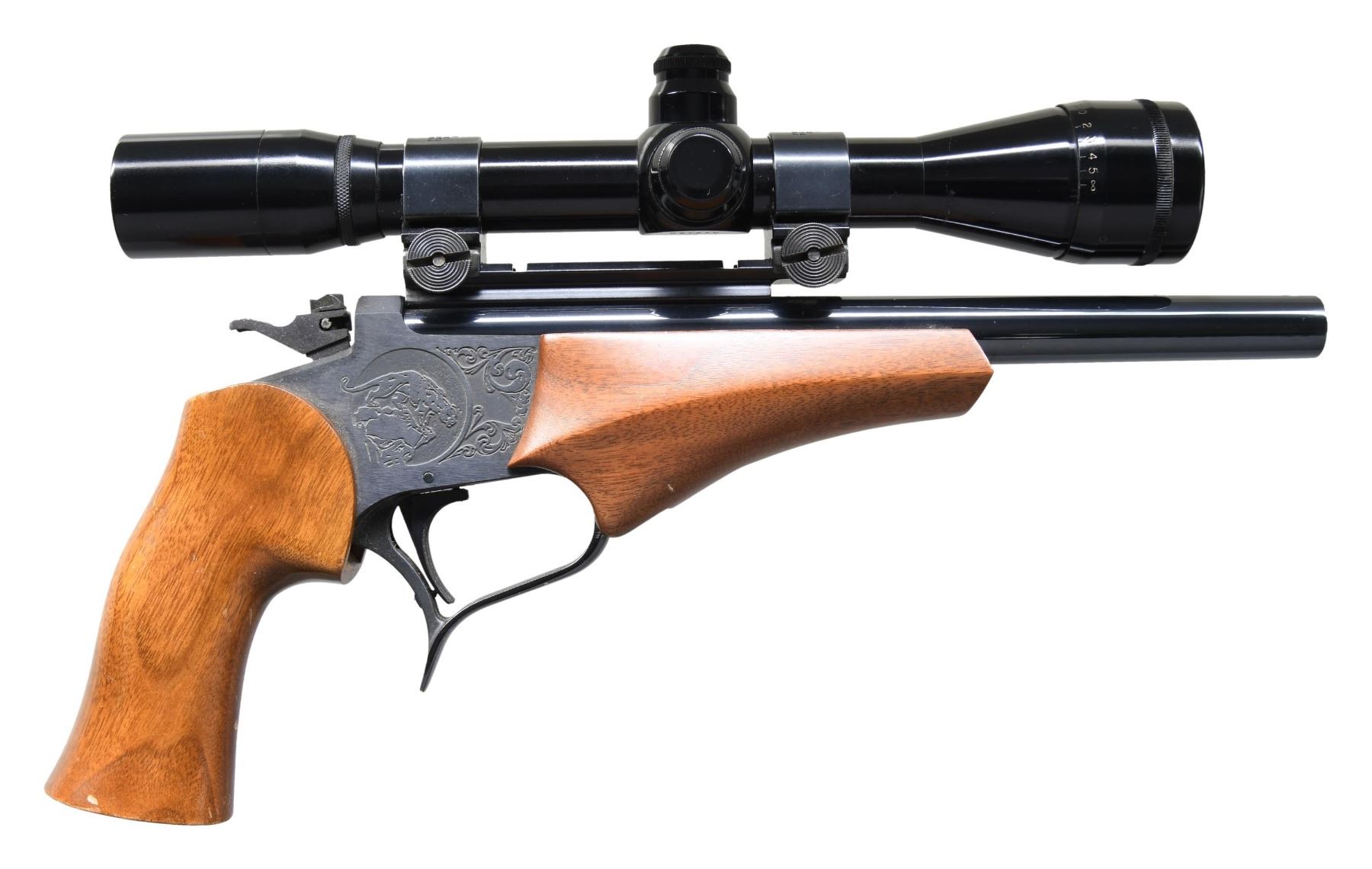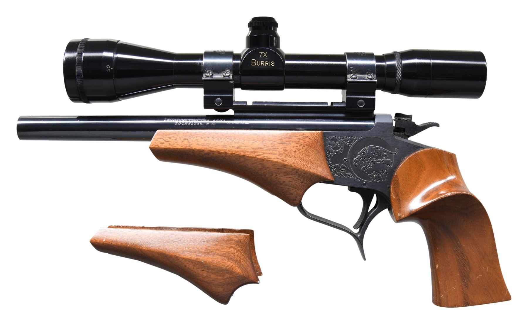 Cal. 32 H&R Mag. S# 292548. Bbl. 10" bull barrel drilled and tapped for front sight (missing). Mfg. second half of 1986 with Easy Open frame; total TC production was 1967-2000. Solid serrated hammer has top turn dial safety and firing pin selector. Forend and grip (right handed) are smooth walnut by TC of sculptured design influenced by Steve Herrett. Fitted with Weaver base and rings with top quality Burris 7X Pistol Scope (long eye relief) having gloss finish, covered target knobs, adjustable objective and crosshair / dot reticle. UNATTACHED ACCESSORIES: matching forend (style and condition) for octagon barrel. CONDITION: very good to excellent overall with some faint handling marks on stock set. Barrel has been recrowned with beveled target crown and void of plug screws for front sight. Faint hint of prior scope ring mounting on scope exterior; balance of scope set is near excellent including optics. Near excellent blued finish (frame and barrel) and bore. (25-2427/NW). MODERN. $450-600.
