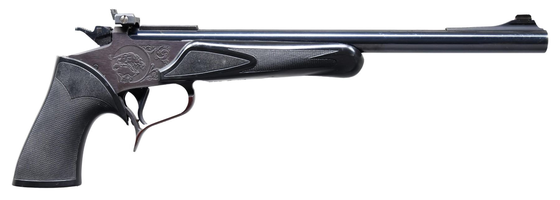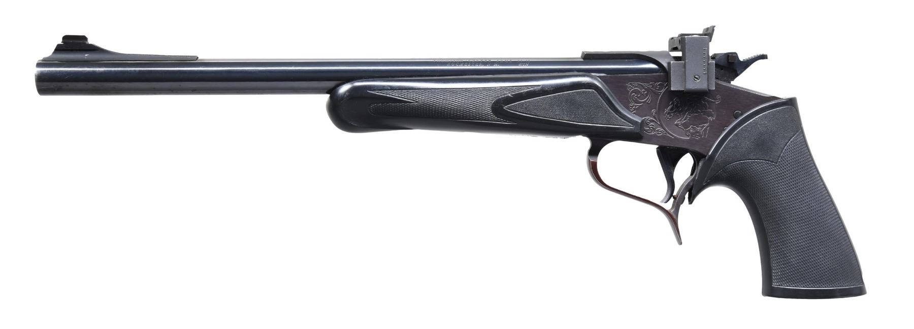 Cal. 30-30. S# 118295. Bbl. 14" bull barrel with sourdough style blued blade in TC supplied William's screw attached ramped base; rear sight is fully adjustable TC target sight designed for IHMSA competition. Mfg. first half of 1979 prior to Easy Open frame design; total TC production was 1967-2000. Skeletonized hammer has cross bolt safety and in face firing pin selector. Grip and forend are checkered black rubber Pachmayr Presentation models. CONDITION: generally very good with handling and use marks on barrel assembly; near excellent frame, stock set and bore. (25-3252/NW). MODERN. $350-500.