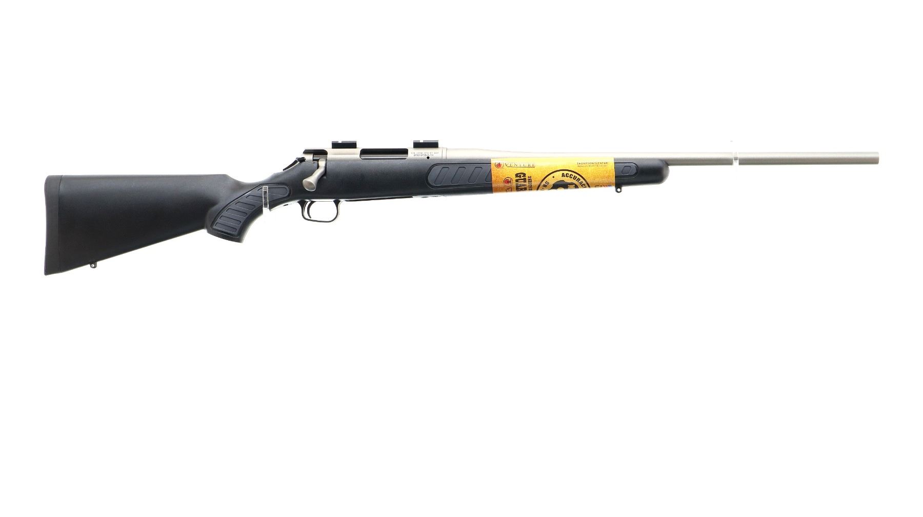 Main Description: No sights, stainless finish, receiver drilled and tapped with two piece scope bases installed, smooth bolt knob. One piece black synthetic stock, grooved grey rubber forearm and pistol grip panels, black rubber recoil pad, grip cap, swivel studs, retains factory tag.