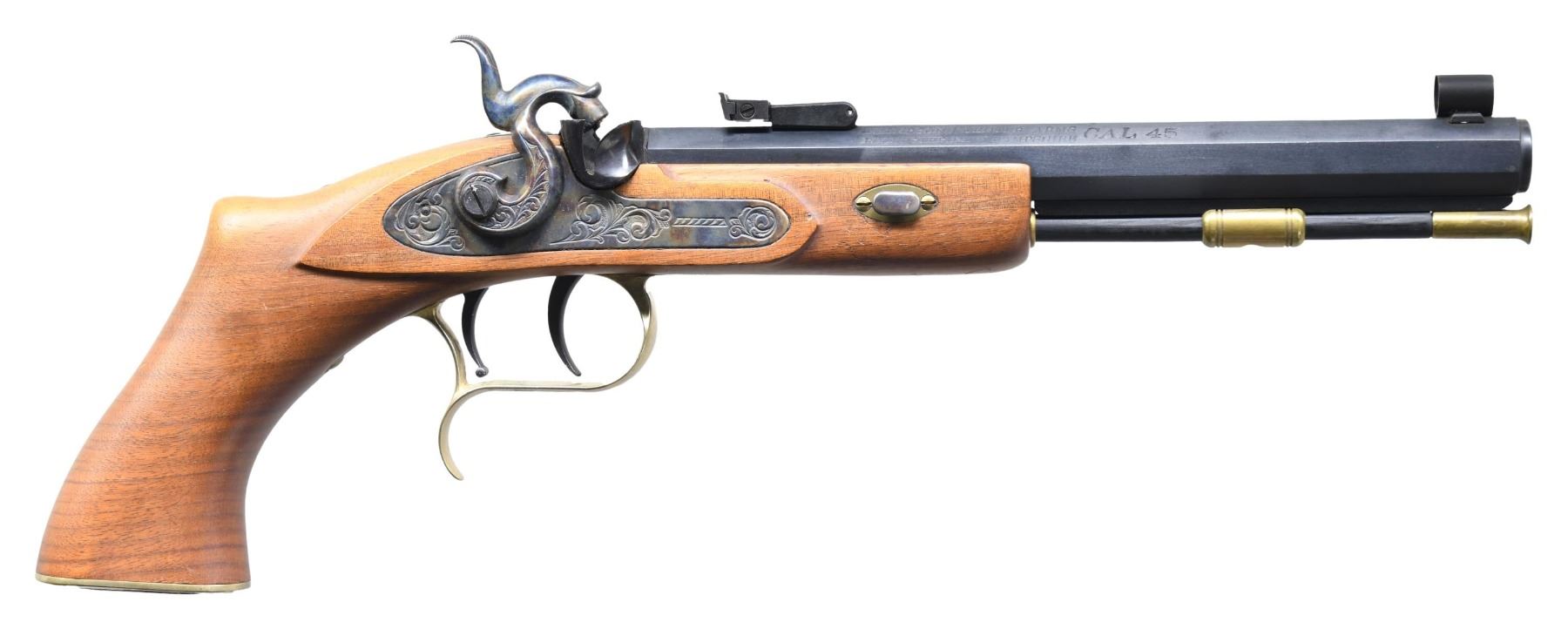Cal. 45. S# 2737. Oct. 9" bbl. Post front sight & adj. rear sight. Case colored lock. Dbl. set triggers. Walnut target stock w/ brass furniture & brass tipped hardwood ramrod. CONDITION: all aspects very good showing light wear. Very good shiny bore. (01-27364/MD). ANTIQUE. $200-300.
