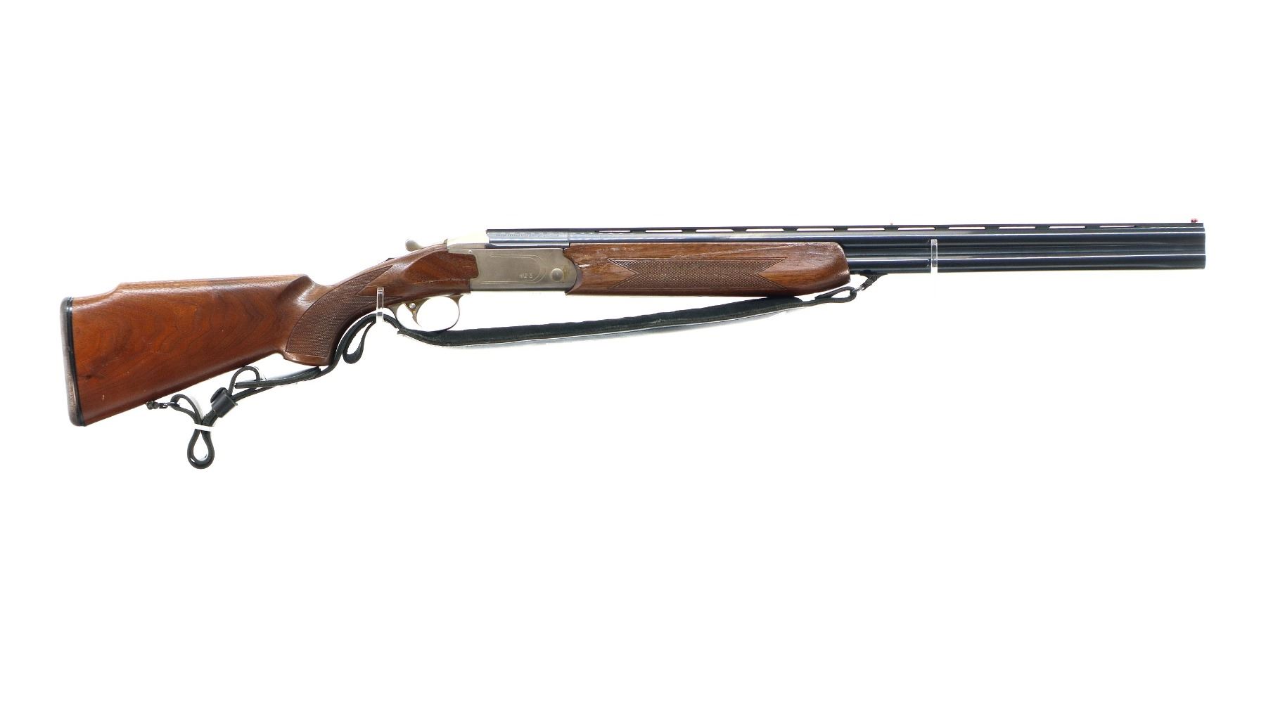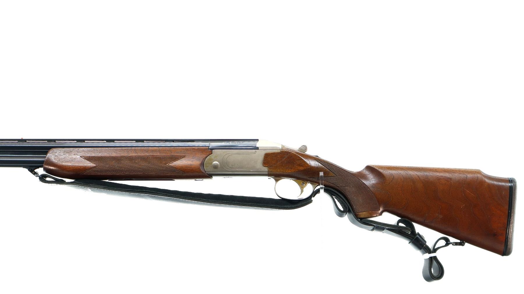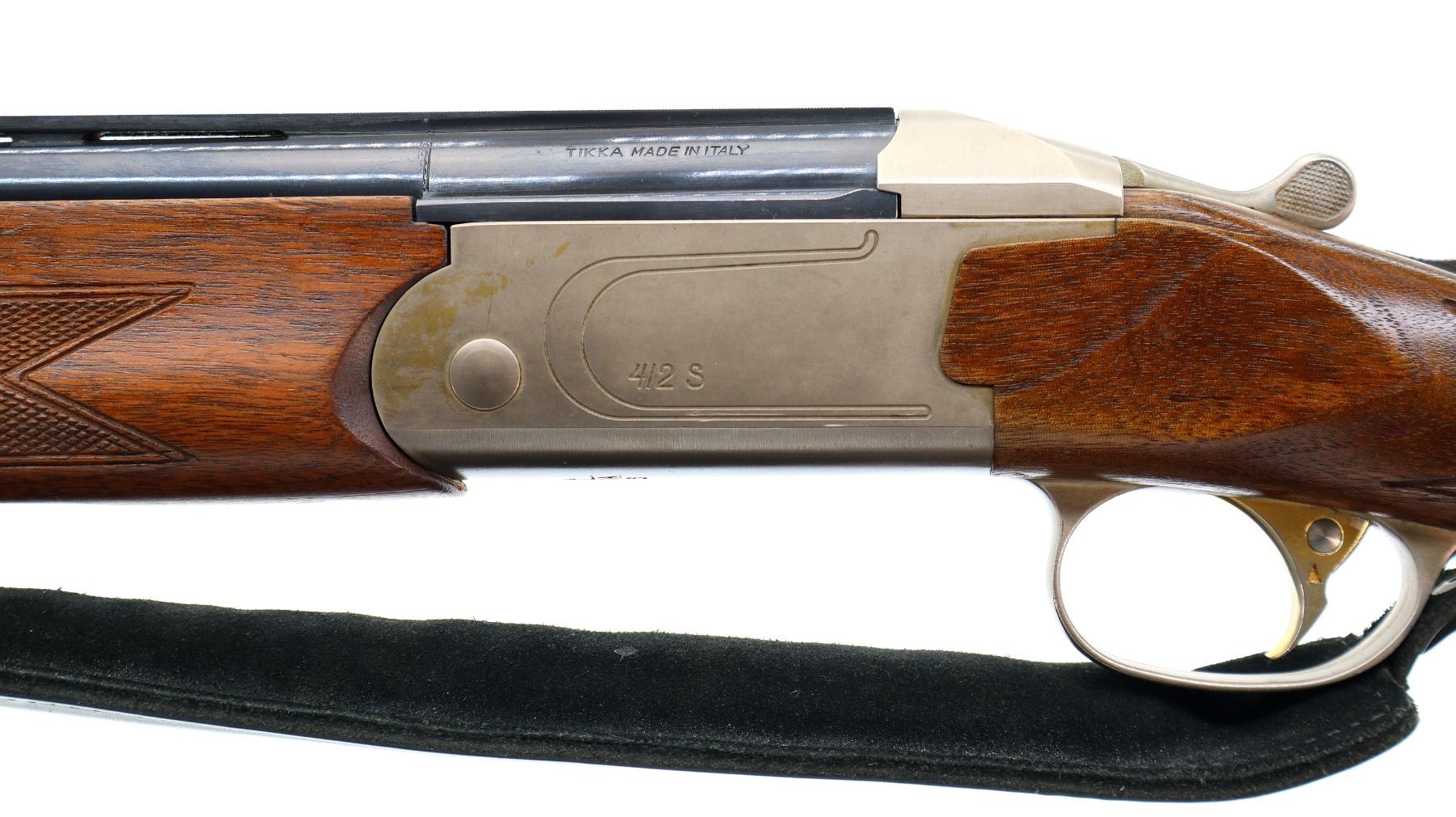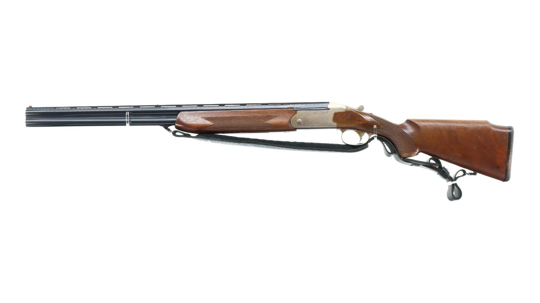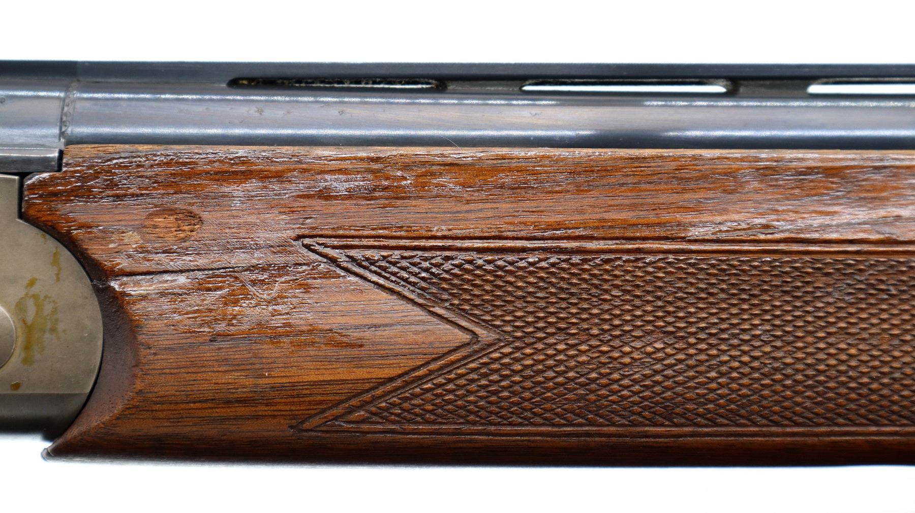 Main Description: Red fiber optic front and mid rib beads, blued vent rib barrel, stainless receiver, automatic safety, cocking indicators, ejectors, single gold selective mechanical trigger. Two piece wood stocks, checkered forearm which has been cracked and repaired, checkered pistol grip with right hand palm swell cracked through wrist, raised comb, brown rubber recoil pad, 14" LOP, sling swivels with black leather Tikka sling.