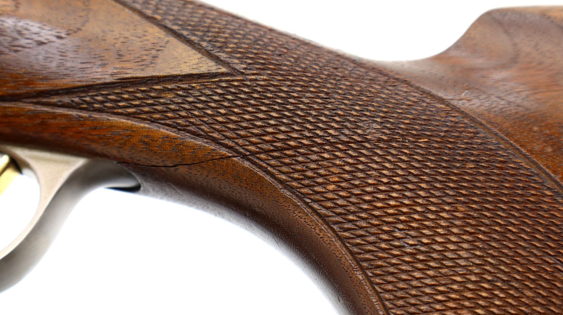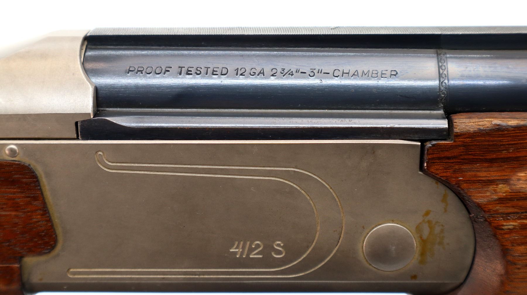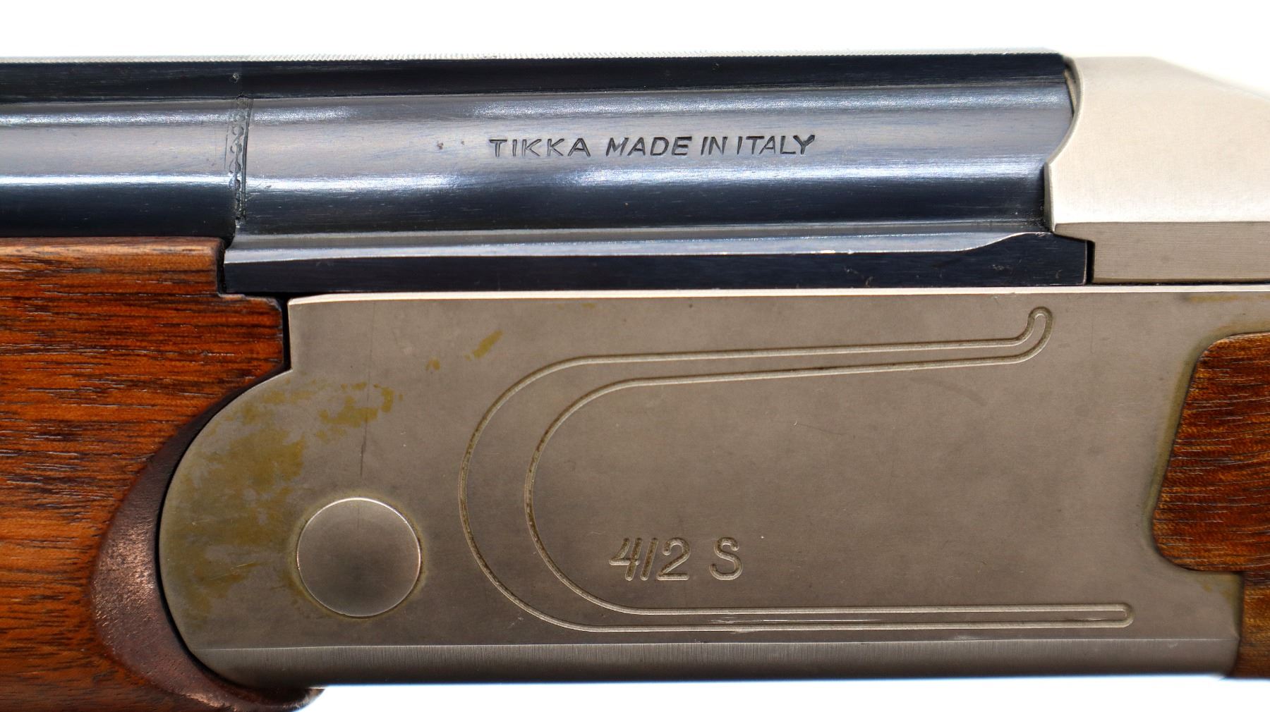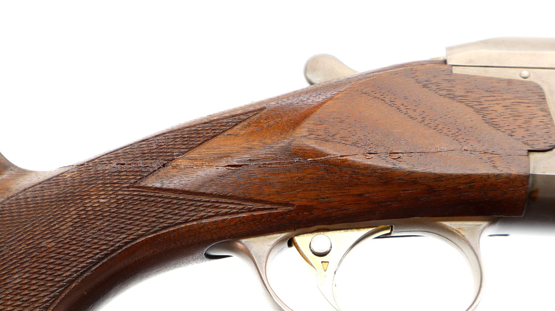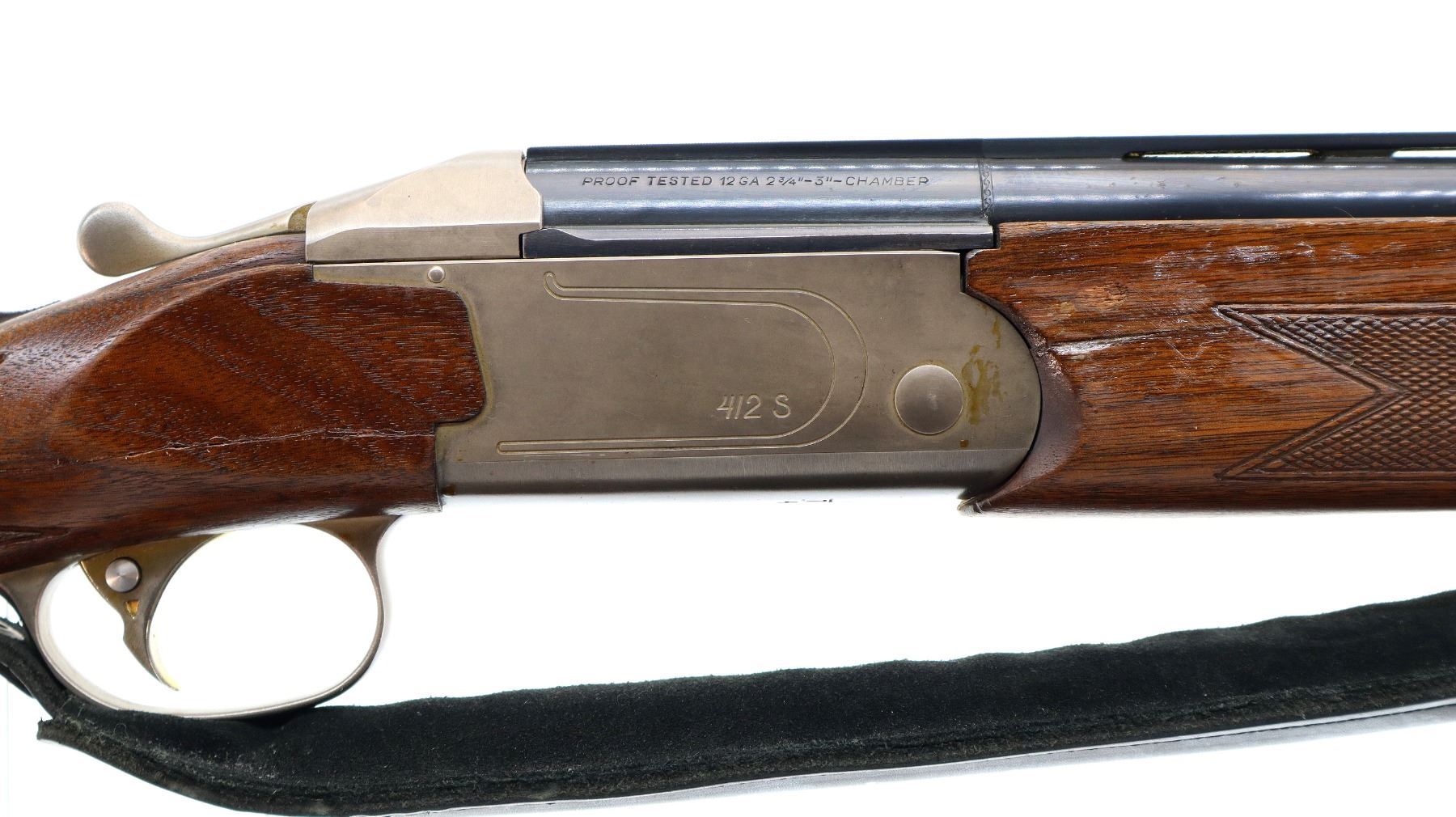Main Description: Red fiber optic front and mid rib beads, blued vent rib barrel, stainless receiver, automatic safety, cocking indicators, ejectors, single gold selective mechanical trigger. Two piece wood stocks, checkered forearm which has been cracked and repaired, checkered pistol grip with right hand palm swell cracked through wrist, raised comb, brown rubber recoil pad, 14" LOP, sling swivels with black leather Tikka sling.