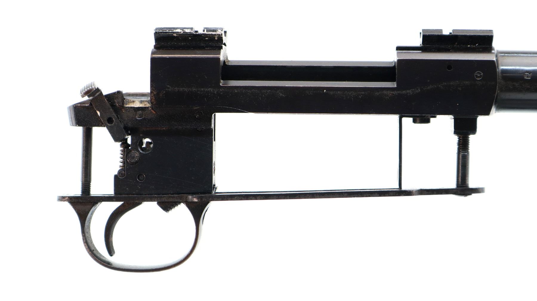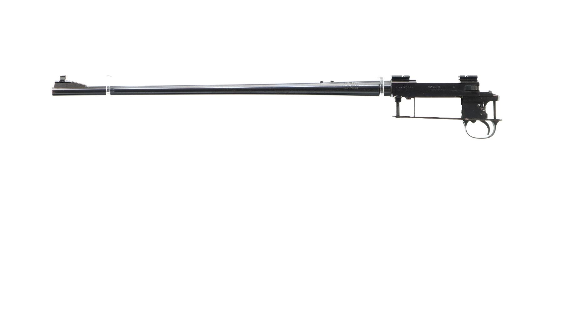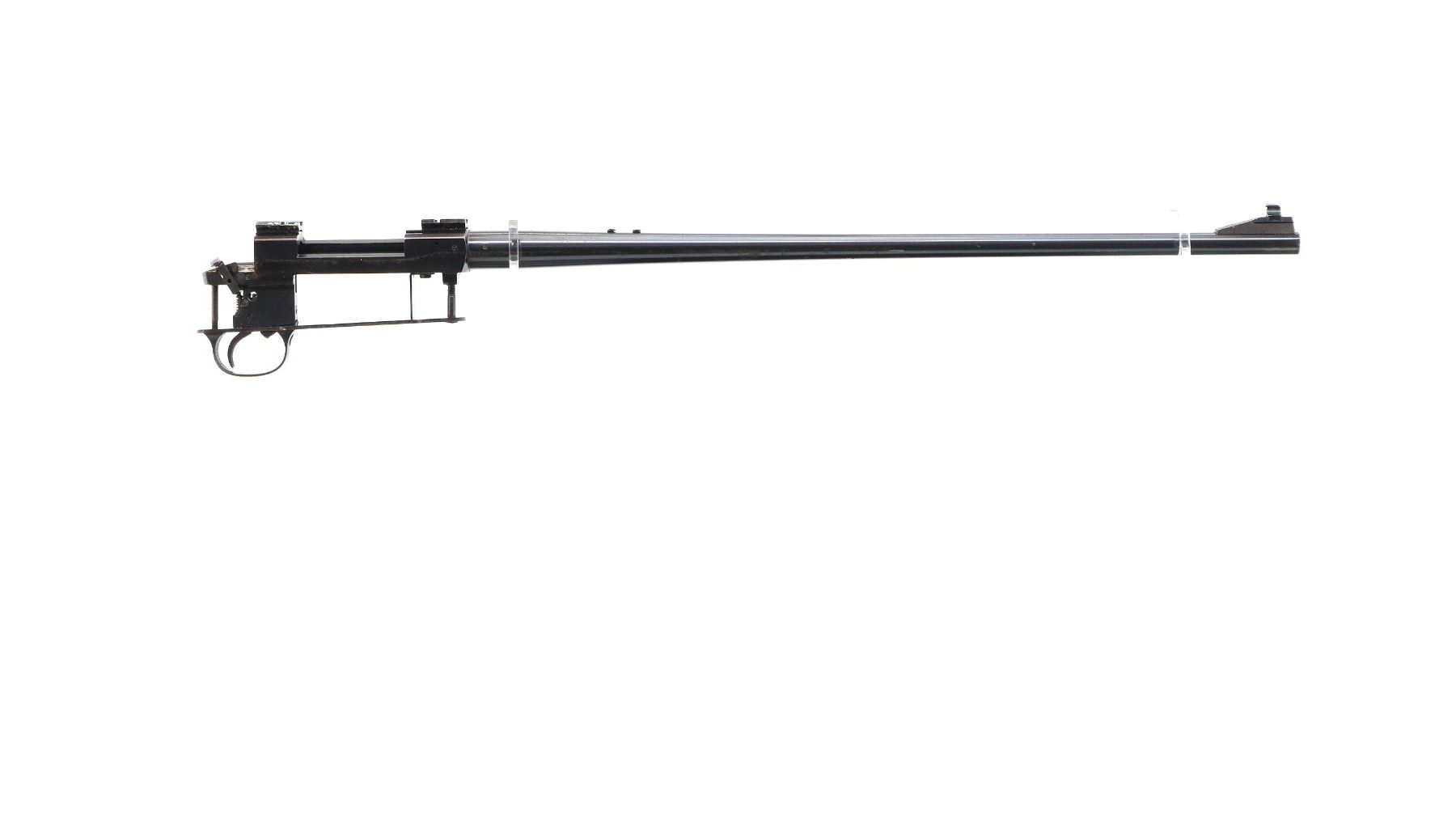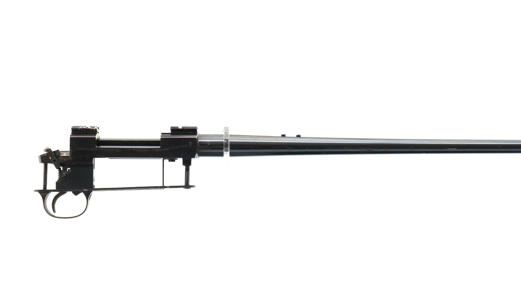 Main Description: Blade front sight with ramp, missing rear sight threaded holes with screws present, blued finish, receiver has integral scope bases drilled and tapped with two piece Weaver bases installed, includes bolt stop, adjustable trigger mech, trigger guard and action screws. No other parts or stocks are included.