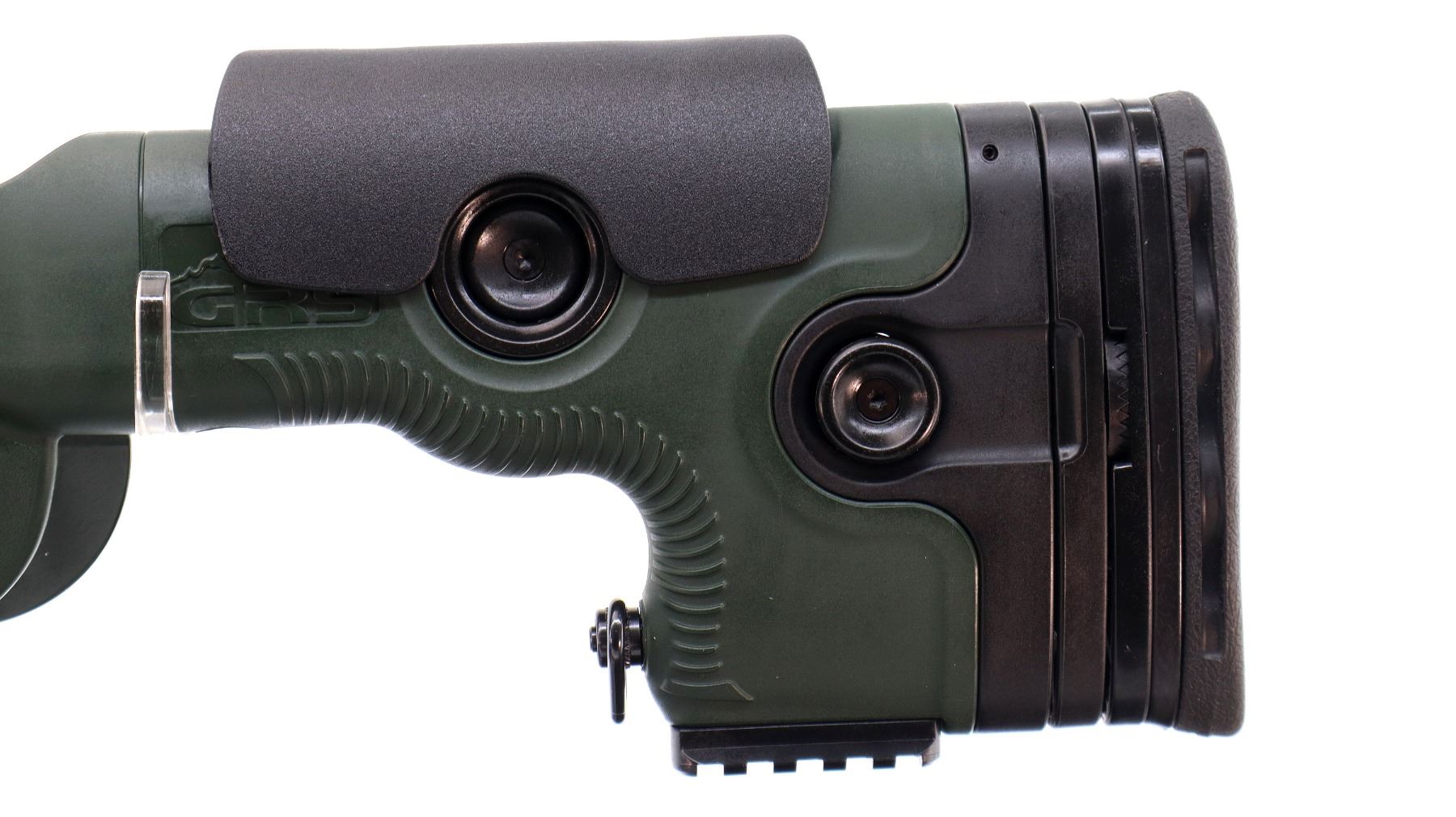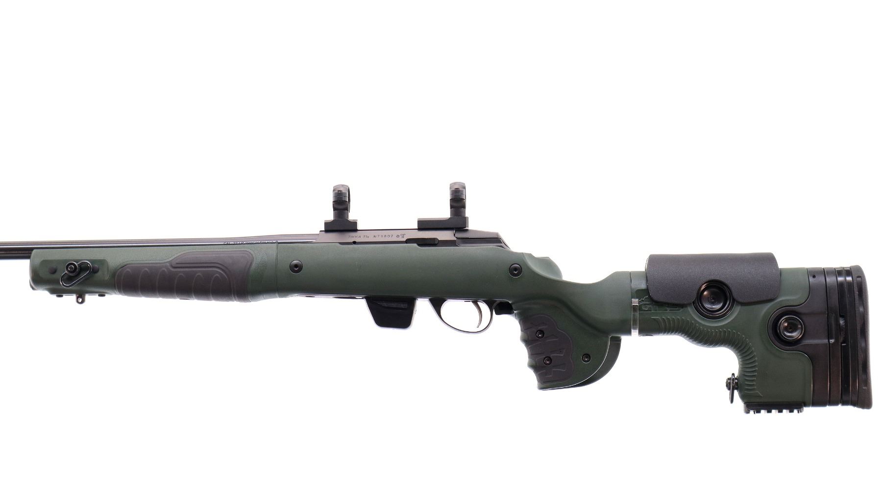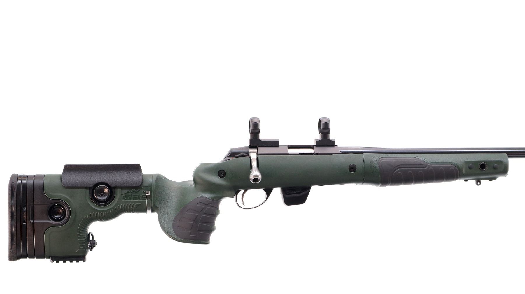 Main Description: No sights, blued heavy barrel threaded at muzzle with cap, Satin finish receiver drilled and tapped with Leupold 1" two piece rings and bases installed, smooth bolt knob. One piece ODG synthetic stock, grooved black rubber forearm and pistol grip panels, adjustable cheek rest and black rubber recoil pad with spacers, hooked butt with short rail on bottom, sling swivels and single swivel stud on bottom of forearm.