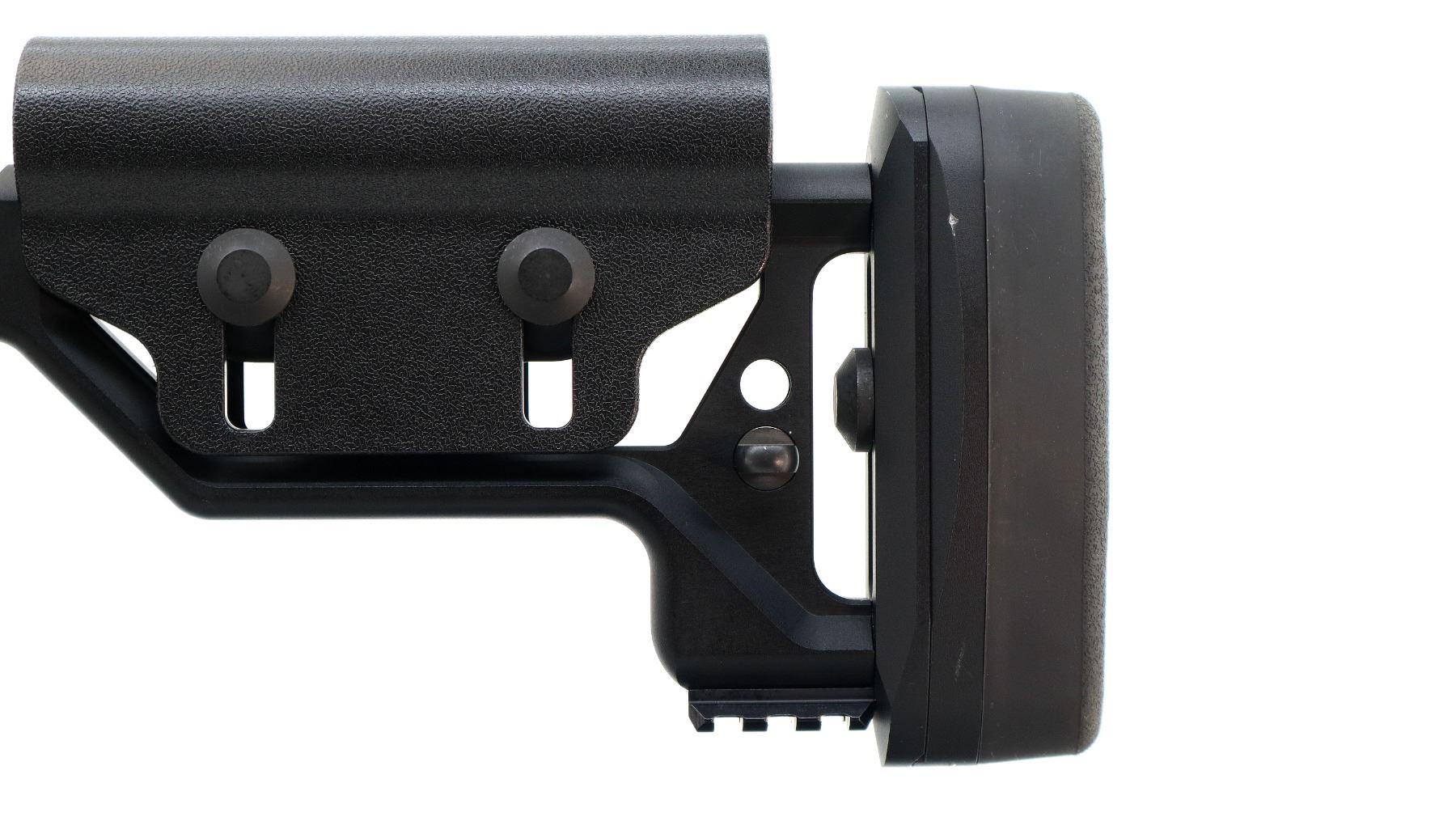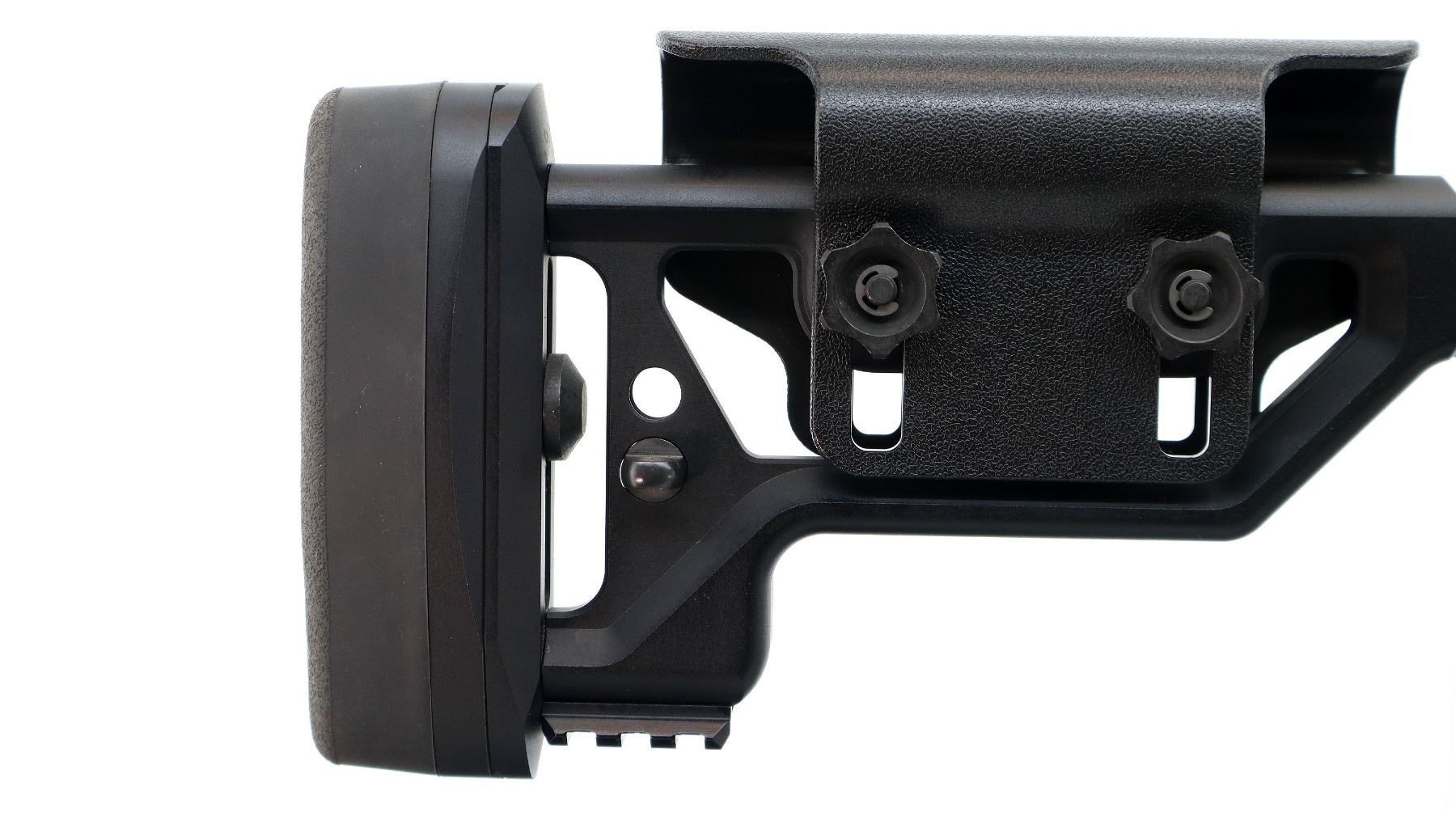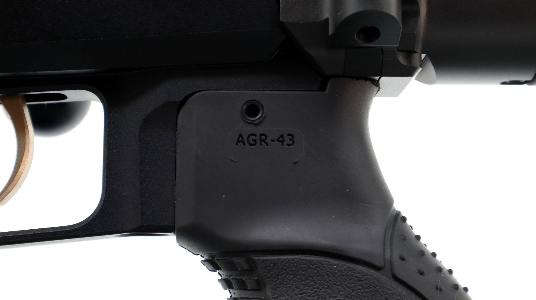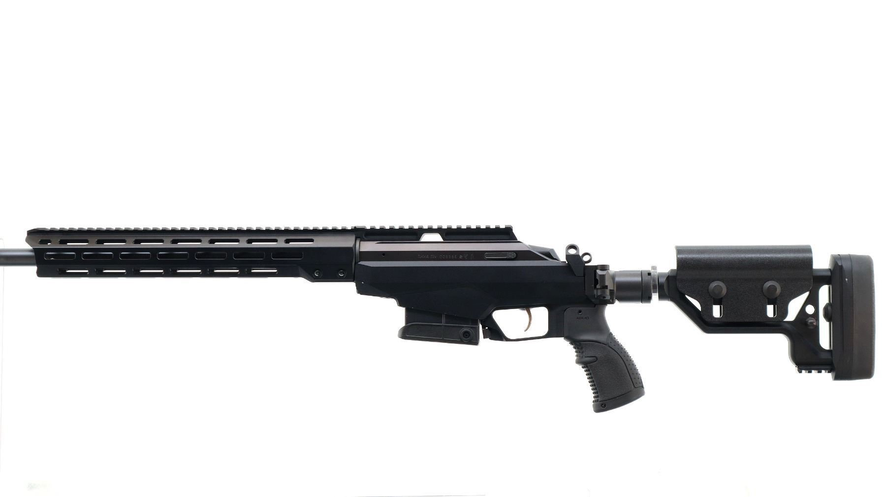 Main Description: No sights, satin blued finish, heavy barrel threaded at muzzle with cap, receiver drilled and tapped with one piece rail, black anodized chassis and ventilated forearm with full length rail. Two piece synthetic stocks, textured AGR 43 pistol grip, folding butt stock with adjustable cheek rest and black rubber recoil pad, hooked but with short rail, ambi magcatch, large black polymer bolt knob, swivel studs.