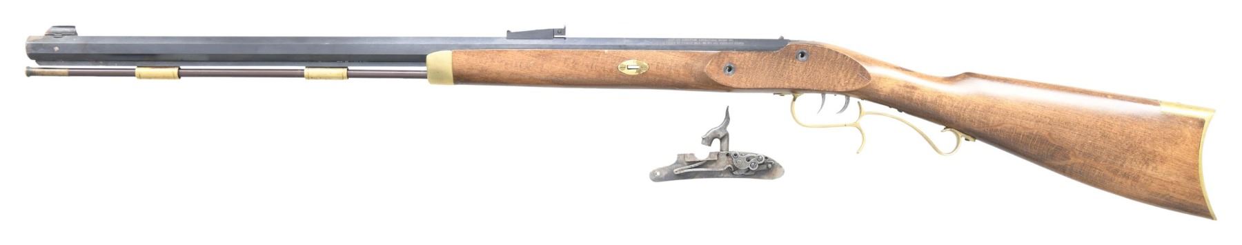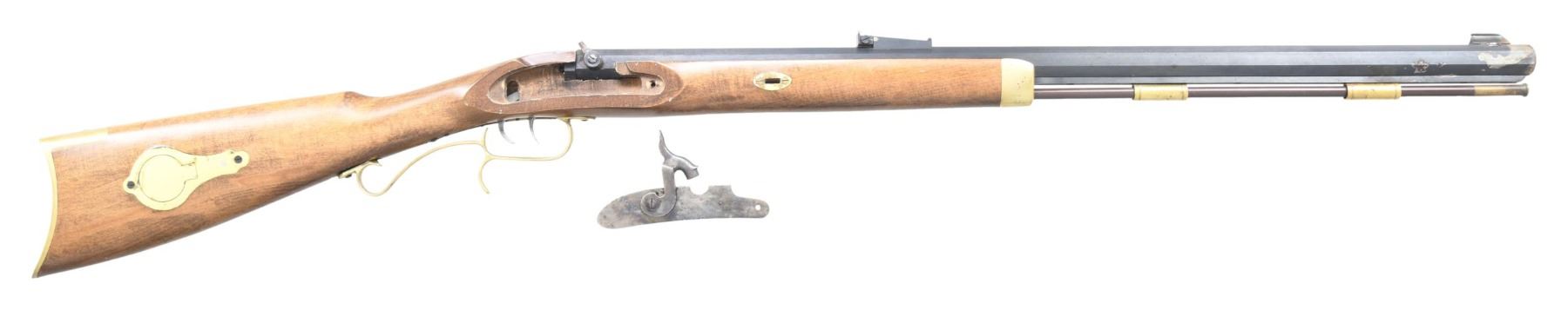 RIFLE. Cal. 50. S# 14-13-009845-00. Mfg. 2000. Bbl. 28". Blade front sight & adj. rear sight. Case colored lock. Hardwood stock w/ double triggers, ramrod & brass furniture. CONDITION: barrel has good blue overall with large areas missing around muzzle with oxidation. 2 lock screws missing and lock detached. Wood has very good finish. Brass showing patina. Heavily oxidized bore. (01-27349/MD). ANTIQUE. $40-60.