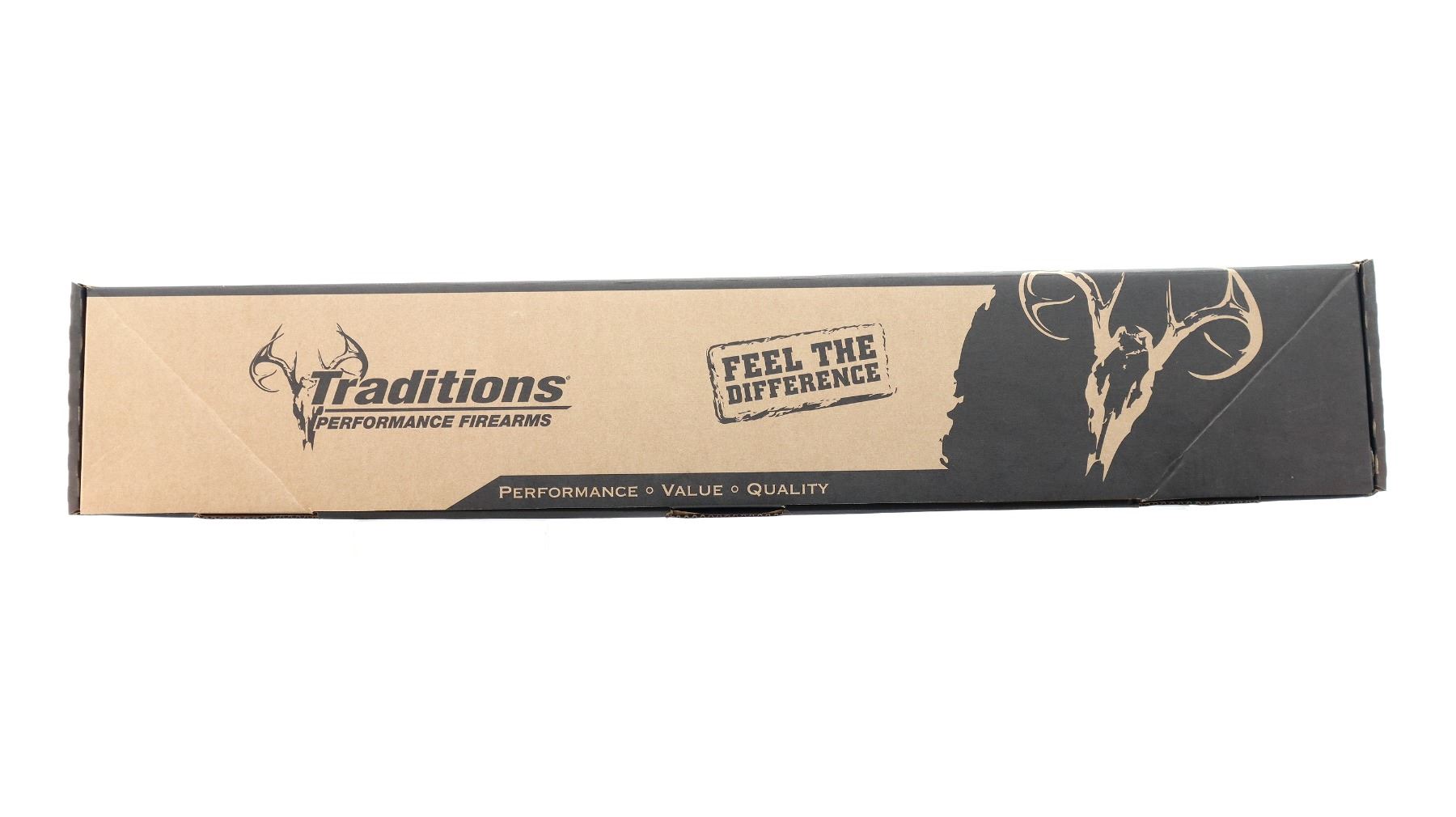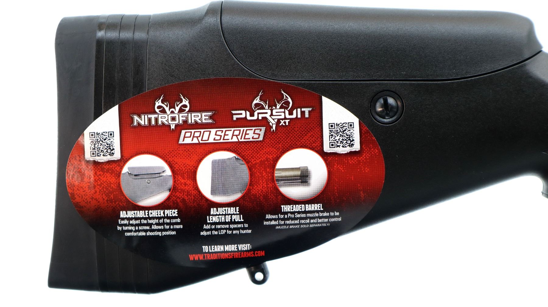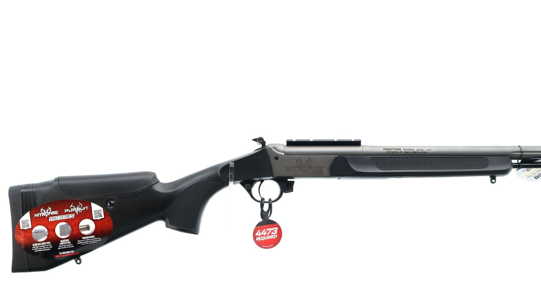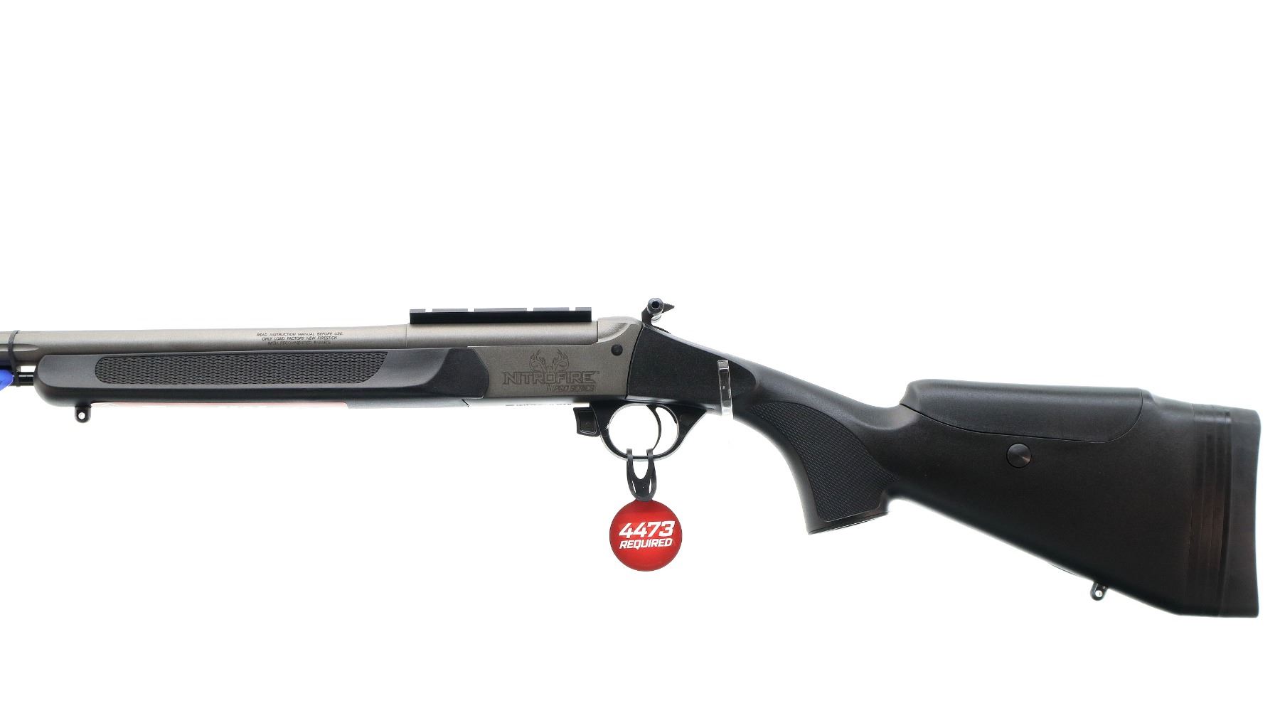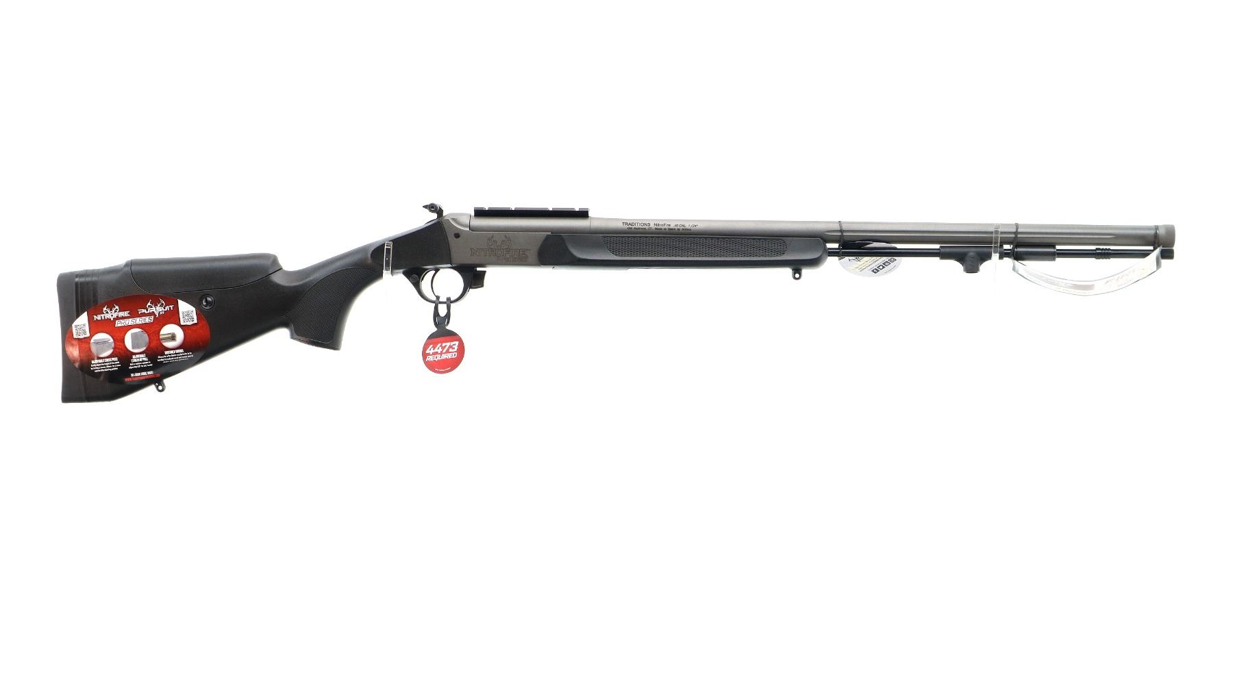 Main Description: No sights, threaded holes present with no plug screws, fluted grey Ceracote barrel with one piece rail at rear, grooved spur hammer with ambi checkered thumb extensions, uses fire stick to load from Federal. Grooved opening lever in front of trigger guard. Two piece black synthetic stocks, checkered forearm and pistol grip, adjustable comb, black rubber recoil pad with spacers, grip cap, swivel studs, black alloy ramrod, retains factory stickers and hang tags.