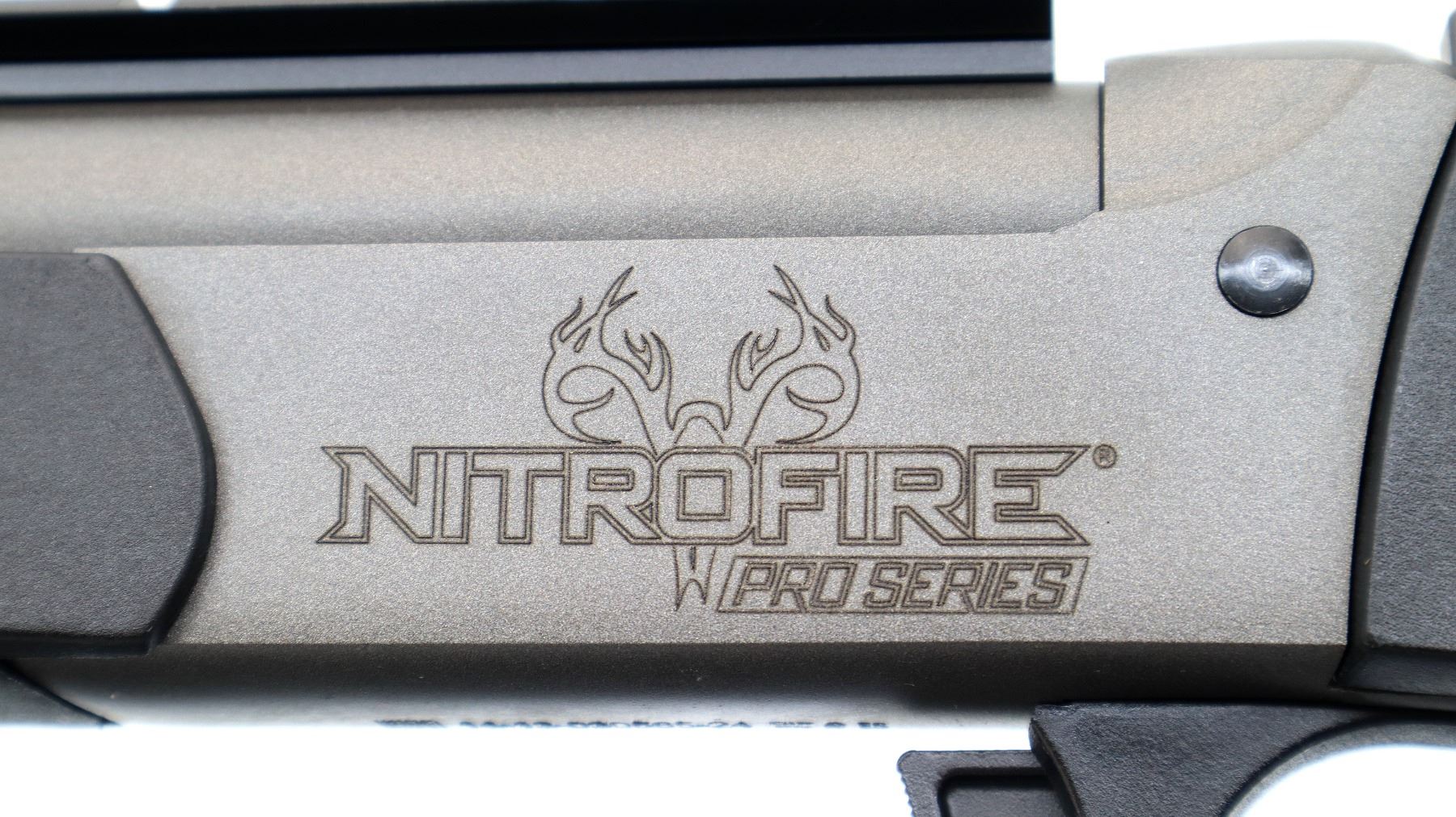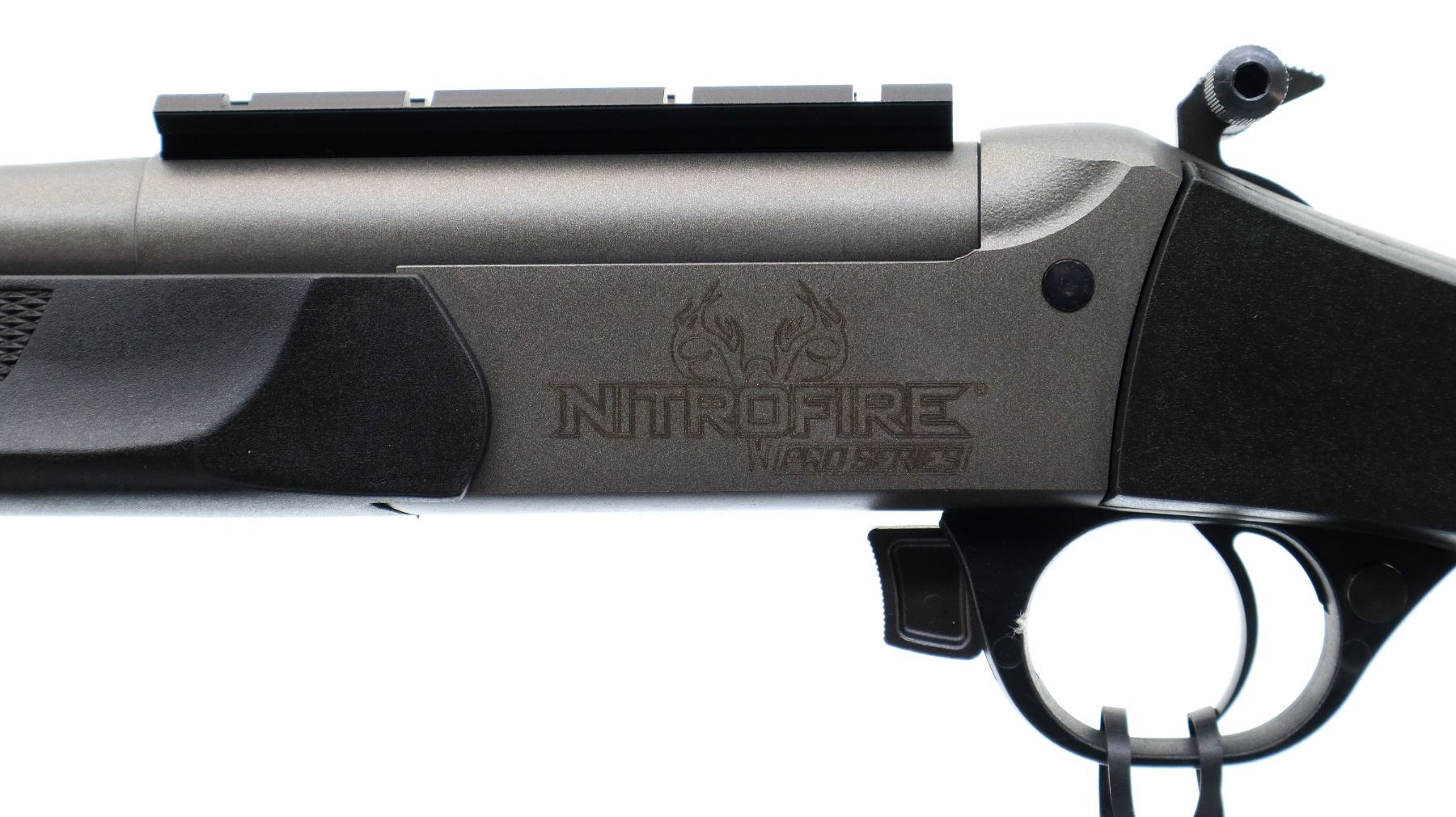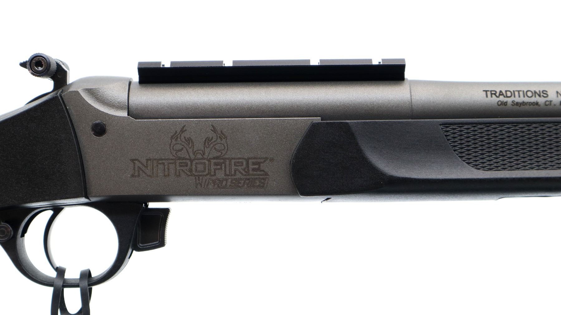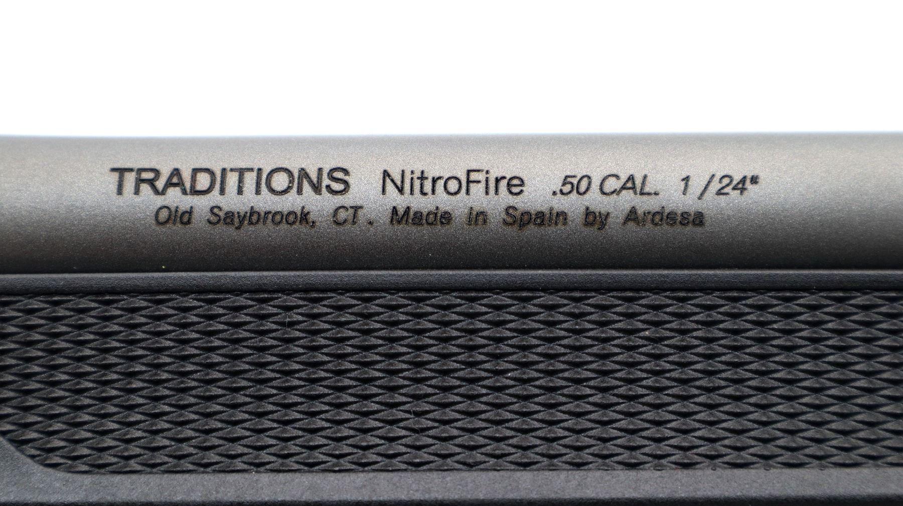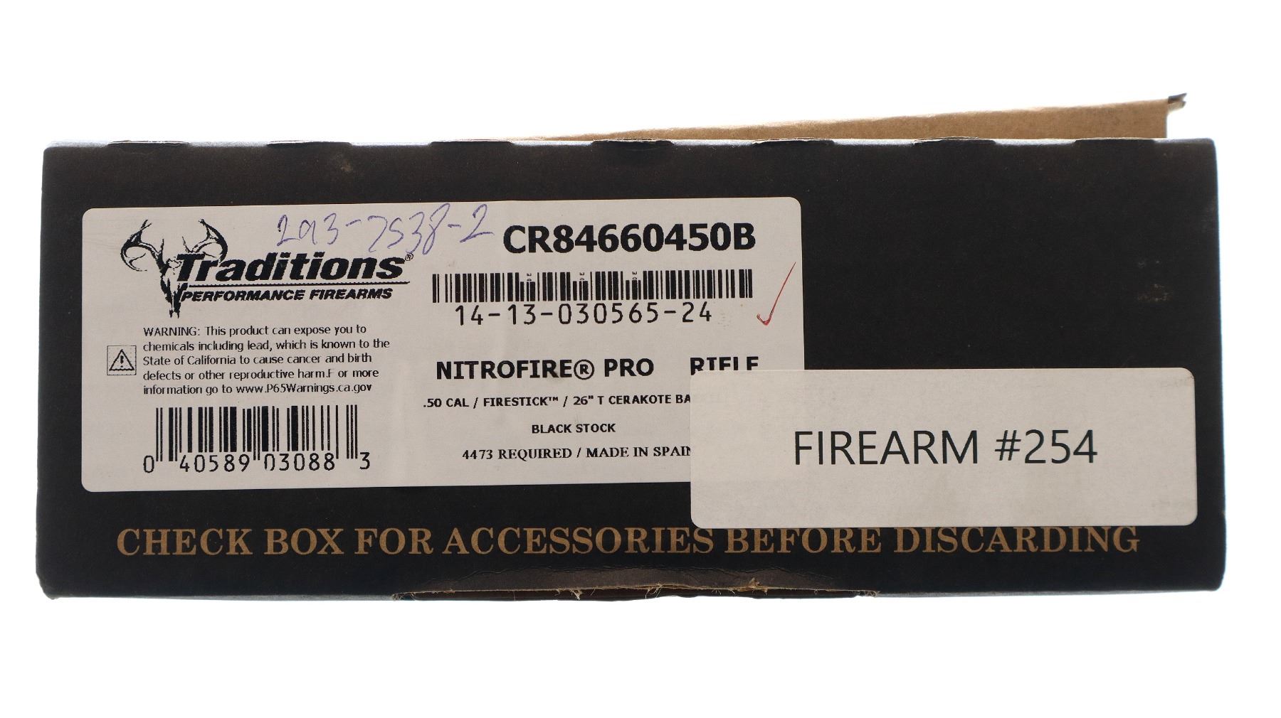 Main Description: No sights, threaded holes present with no plug screws, fluted grey Ceracote barrel with one piece rail at rear, grooved spur hammer with ambi checkered thumb extensions, uses fire stick to load from Federal. Grooved opening lever in front of trigger guard. Two piece black synthetic stocks, checkered forearm and pistol grip, adjustable comb, black rubber recoil pad with spacers, grip cap, swivel studs, black alloy ramrod, retains factory stickers and hang tags.