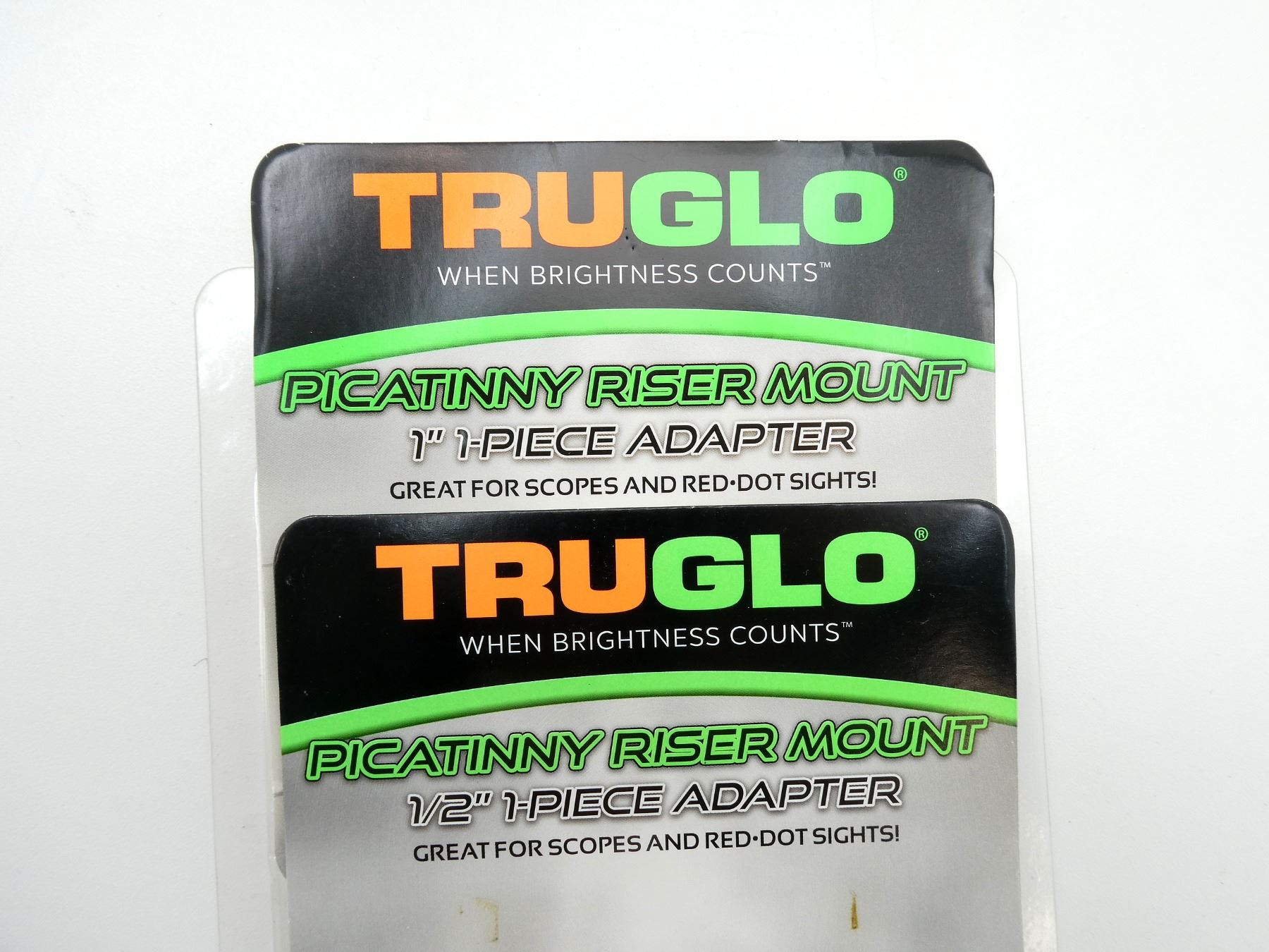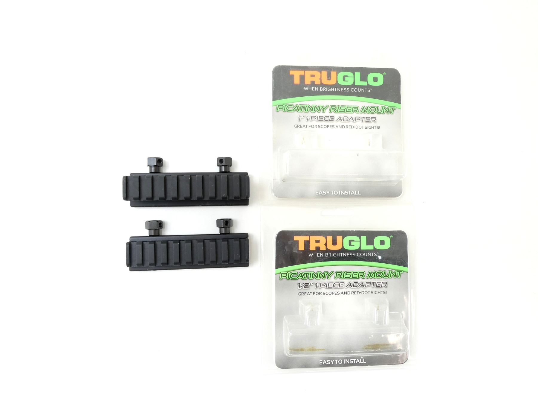 LOT INCLUDES; (1) TRUGLO PICATINNY RISER MOUNT, 1" 1-PIECE ADAPTER, FOR AR-15 FLATTOP RECEIVERS, SCOPES & RED-DOT SIGHTS, PRODUCT #: TG8990B, NEW OLD STOCK, IN ORIGINAL PACKAGING & (1) TRUGLO PICATINNY RISER MOUNT, 1/2" 1-PIECE ADAPTER, FOR AR-15 FLATTOP RECEIVERS, SCOPES & RED-DOT SIGHTS, PRODUCT #: TG8970B, NEW OLD STOCK, IN ORIGINAL PACKAGING. MAY REQUIRE FITTING. SEE PHOTOS.