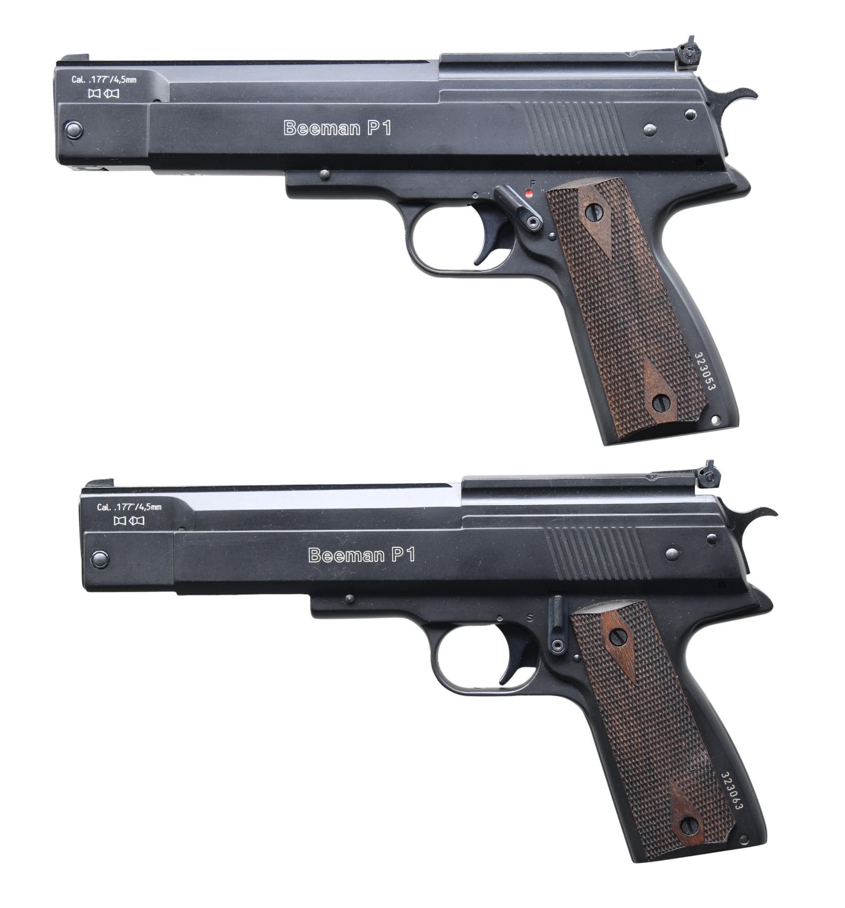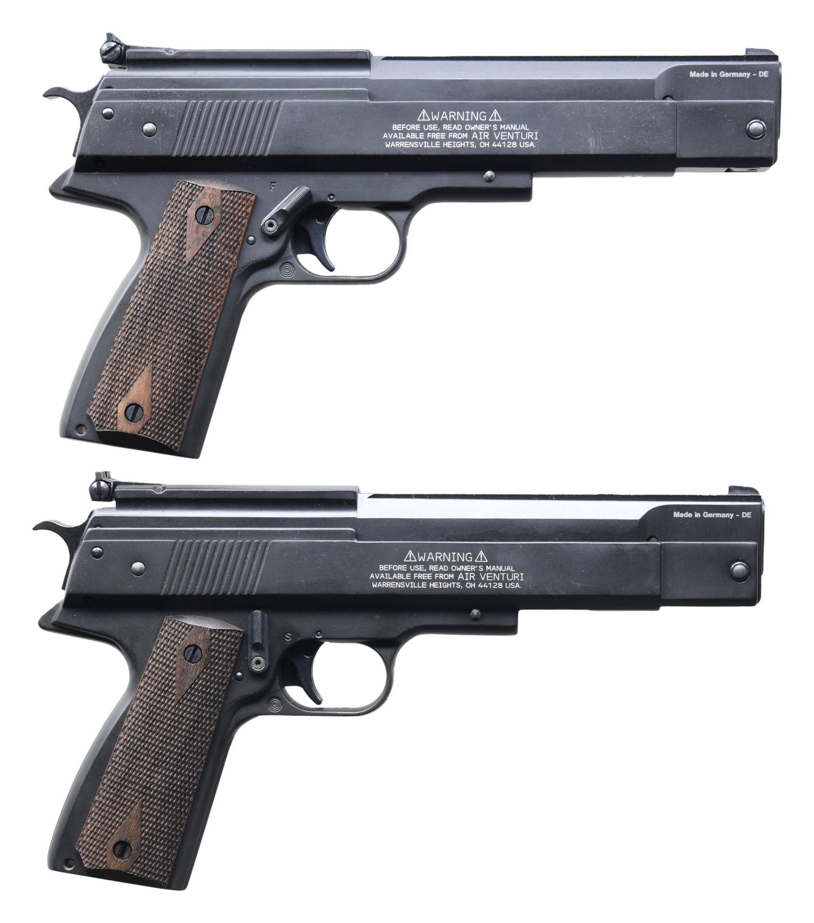 ALL: cal. .177/4.5mm pellet. Mfg. in Germany. Bbls. 8.5. Single shot. Top lever has blade front sight & adj. rear sight unlocked by cocking hammer. Spring piston action. Simulated Model 1911A1 controls. Two piece checkered wood grips. UNATTACHED ACCESSORIES: Beeman hang tags. CONDITION: both appear near excellent with light scratches. 1) S# 323053. 2) S# 323063. (02-24617/MD). $75-150.