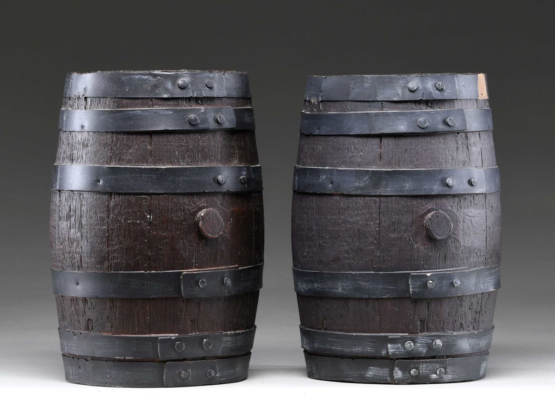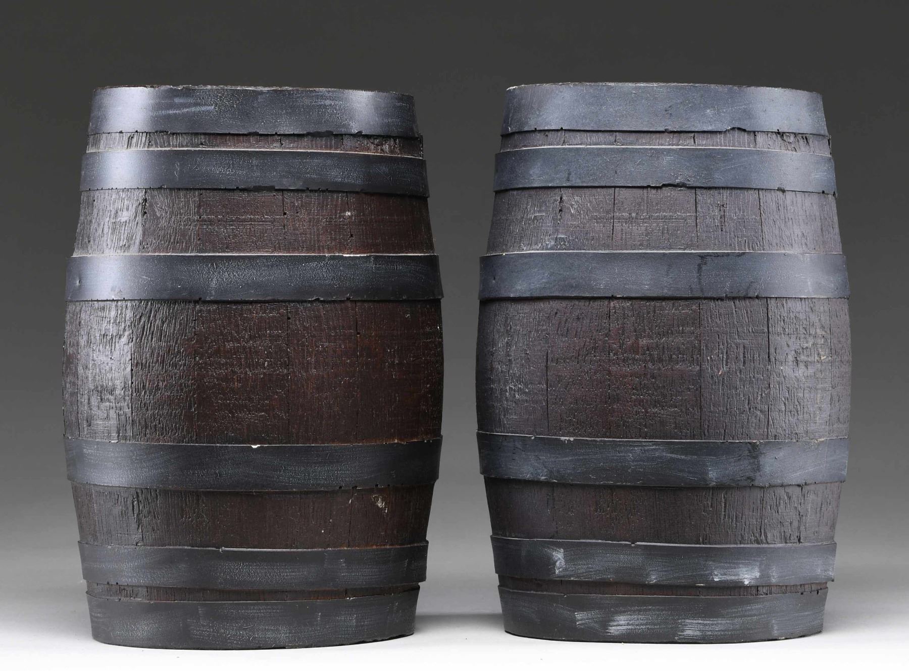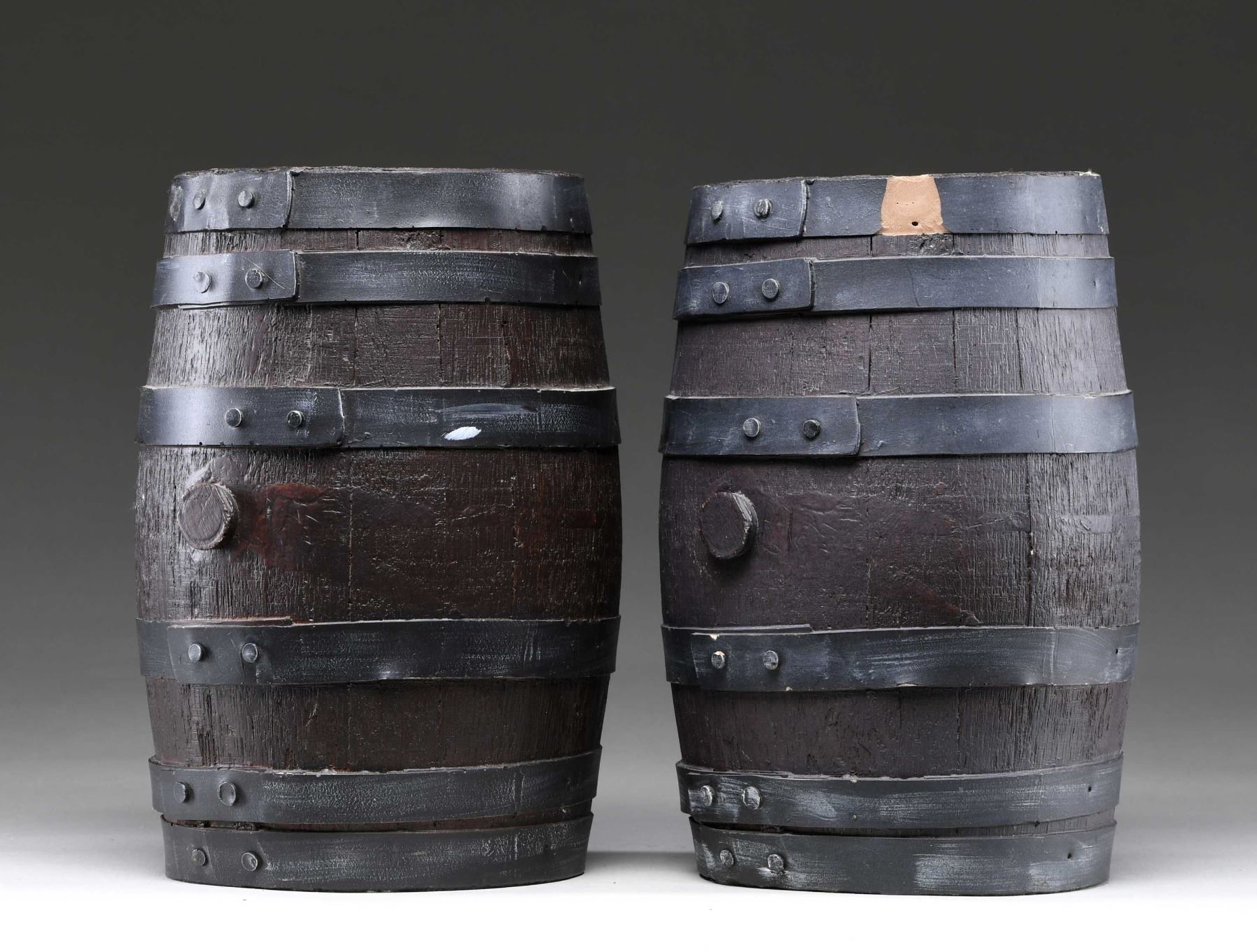 This lot includes 2 faux casks measuring approx. 10 3/4" x 6 1/2". Each cask has a total of 6 faux metal bands and a faux stopper in the center of the cask. The color is quite accurate and they would function well in a display. CONDITION: 1 cask is undamaged. The other has a small chip on the rim. (02-23563-12/BF). $25-50.