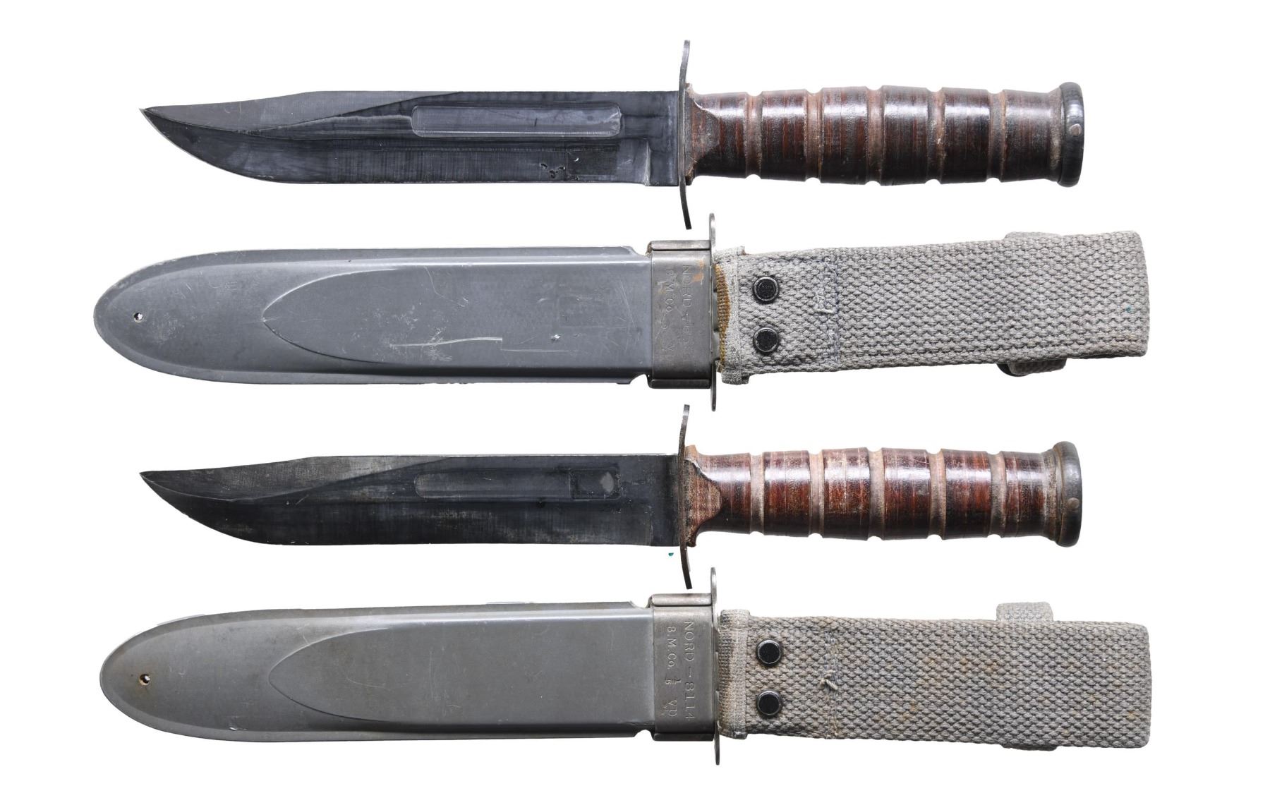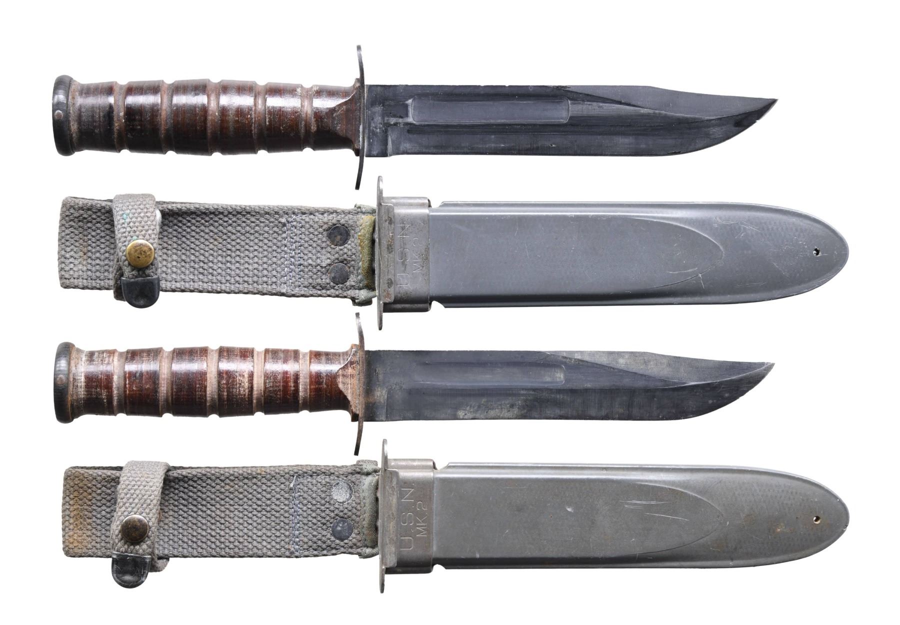 Both in comparable fine condition, 12" overall, 7" clip point blades, stacked leather washer grips, steel cross guards and pommels. Both maker marked "CAMILLUS" & "U.S.N. / MARK 2" on cross guards. CONDITION: very good overall, blades retain most of their original finish, correct gray composite sheaths with contract markings. PROVENANCE: Roger Ballard collection. (02-24039-1/JS). $300-500.