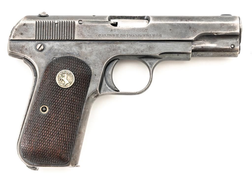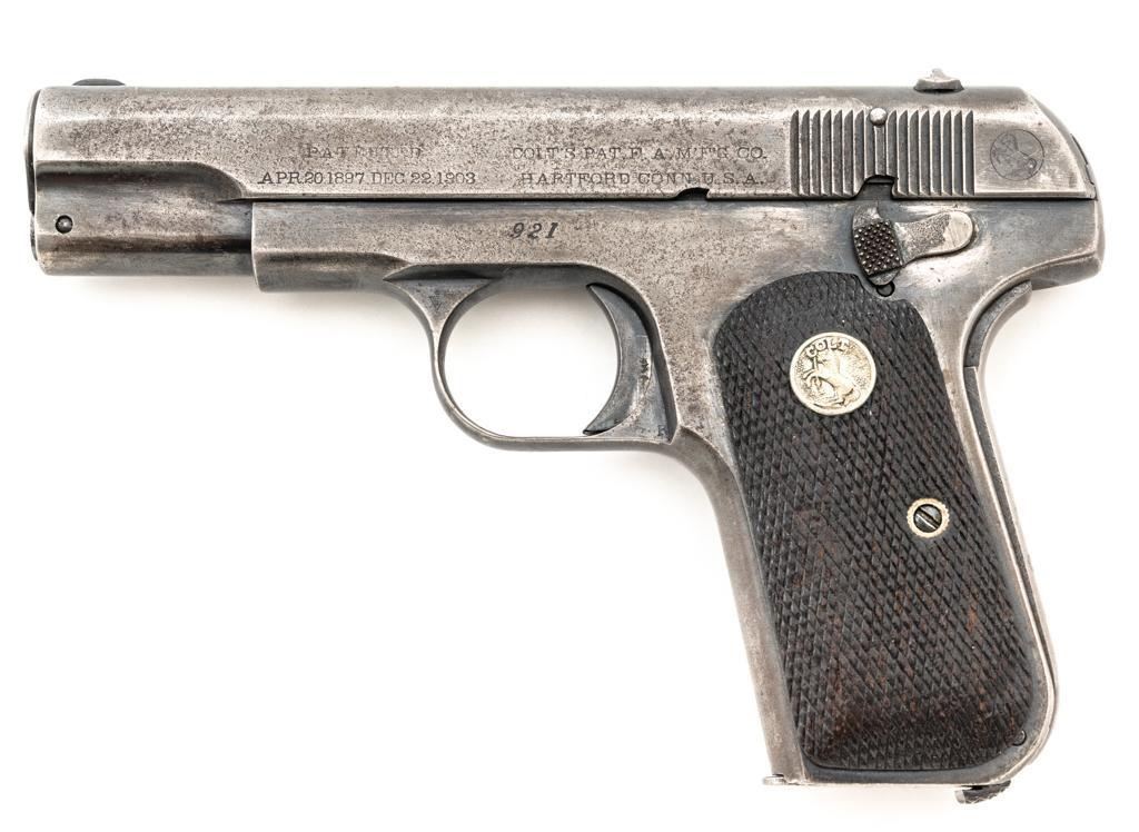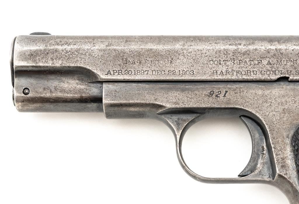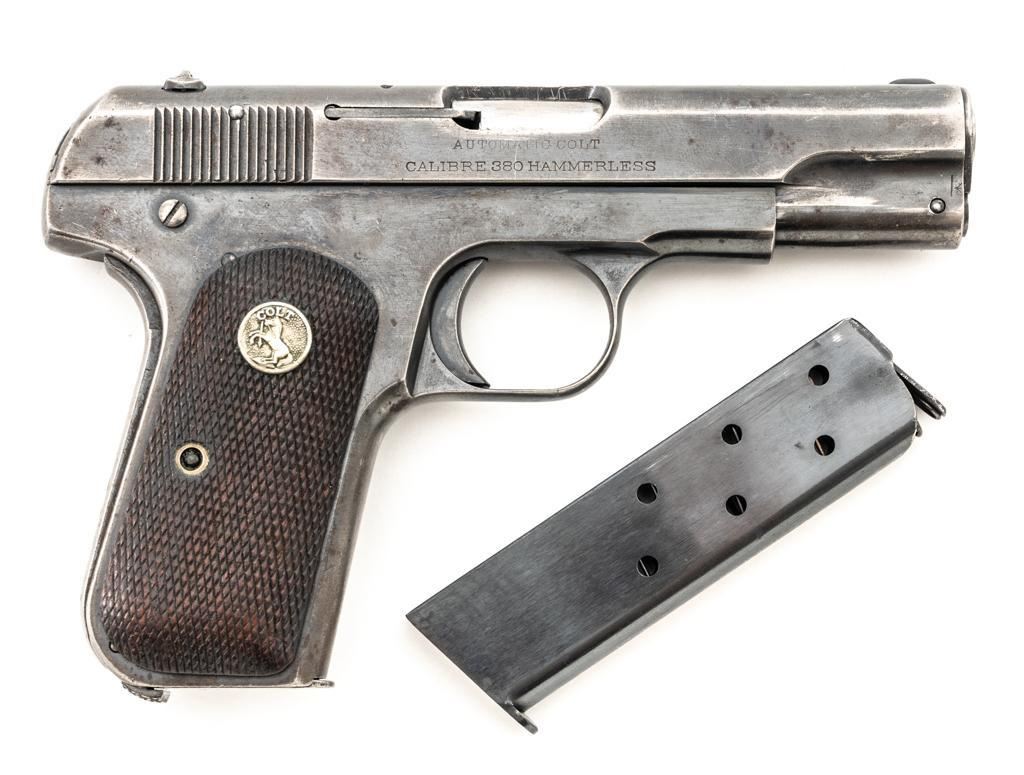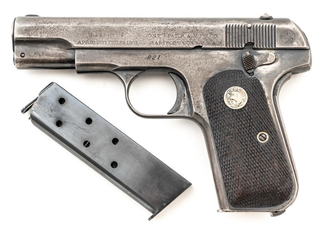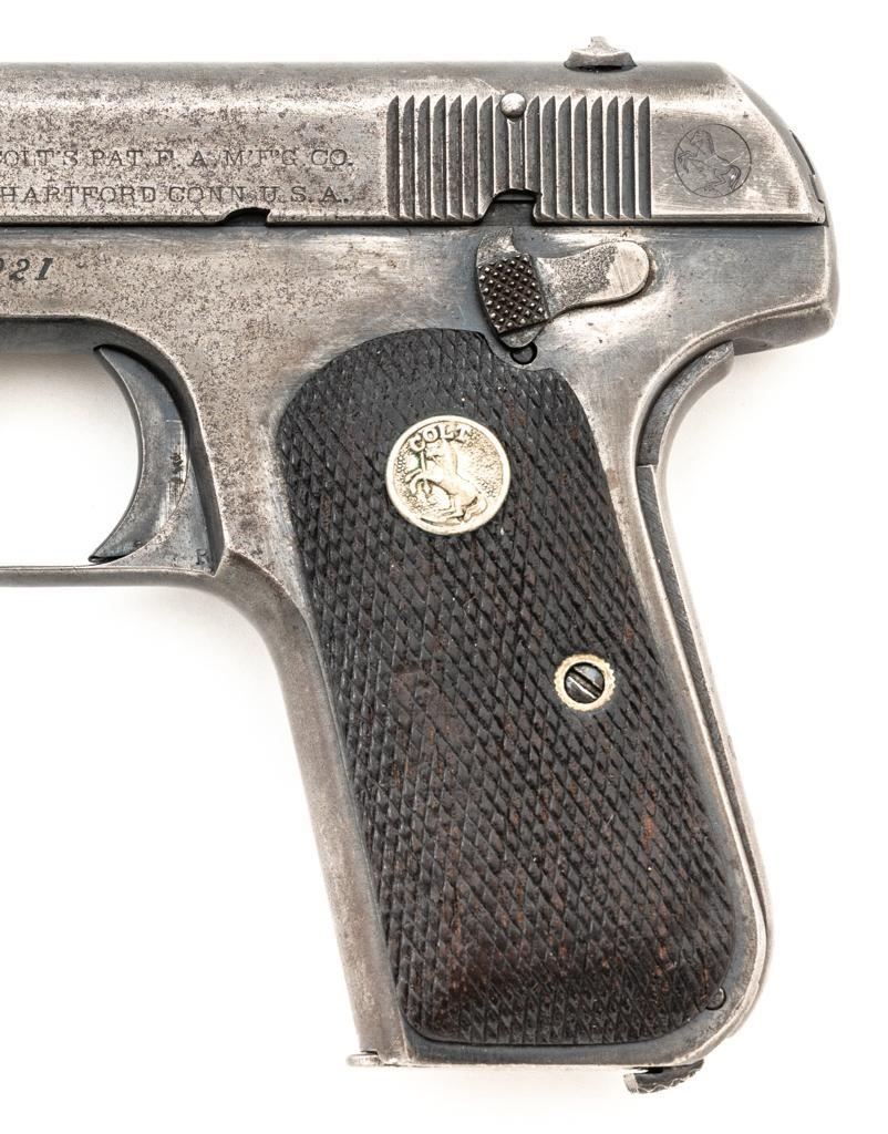 Three-Digit Colt Model 1908 Pocket Hammerless Semi-Automatic Pistol, #921, .380 ACP cal., 3.75" barrel, blued finish, checkered two-piece walnut grips with silver Colt medallions, fixed blade front sight, and "U"-notched rear sight. Standard markings for this early model are correct. Includes one unmarked blued steel magazine and one modern unmarked magazine. Mfgd 1908. Pistol is in good overall condition, retaining approx. 40% blue, mainly on the right side, balance has gone to gray, showing scattered pinprick pitting. Factory markings are visible. Later replacement factory grips show moderate signs of age and handling wear. Action is crisp and functions smoothly. Bore is bright throughout with very good, defined rifling. the action crisp & the bore/rifling are near fine. Est.: $300-$400. (C&R/PPT)