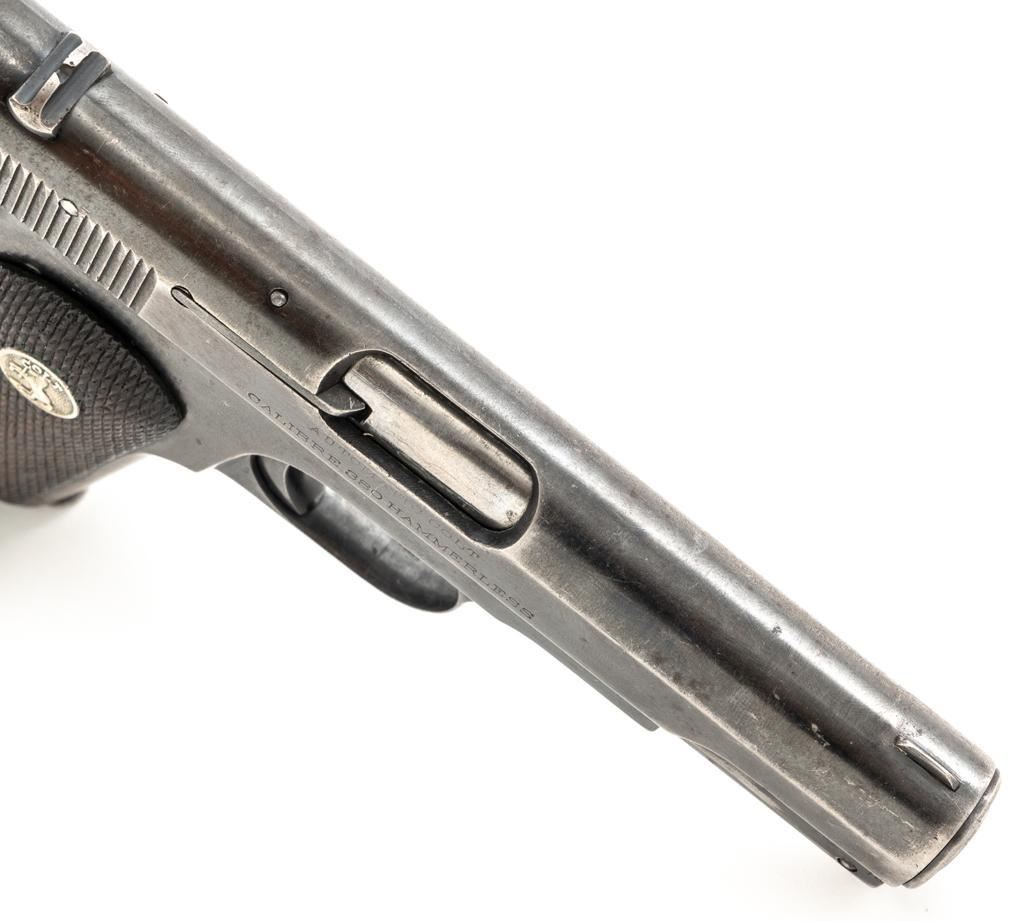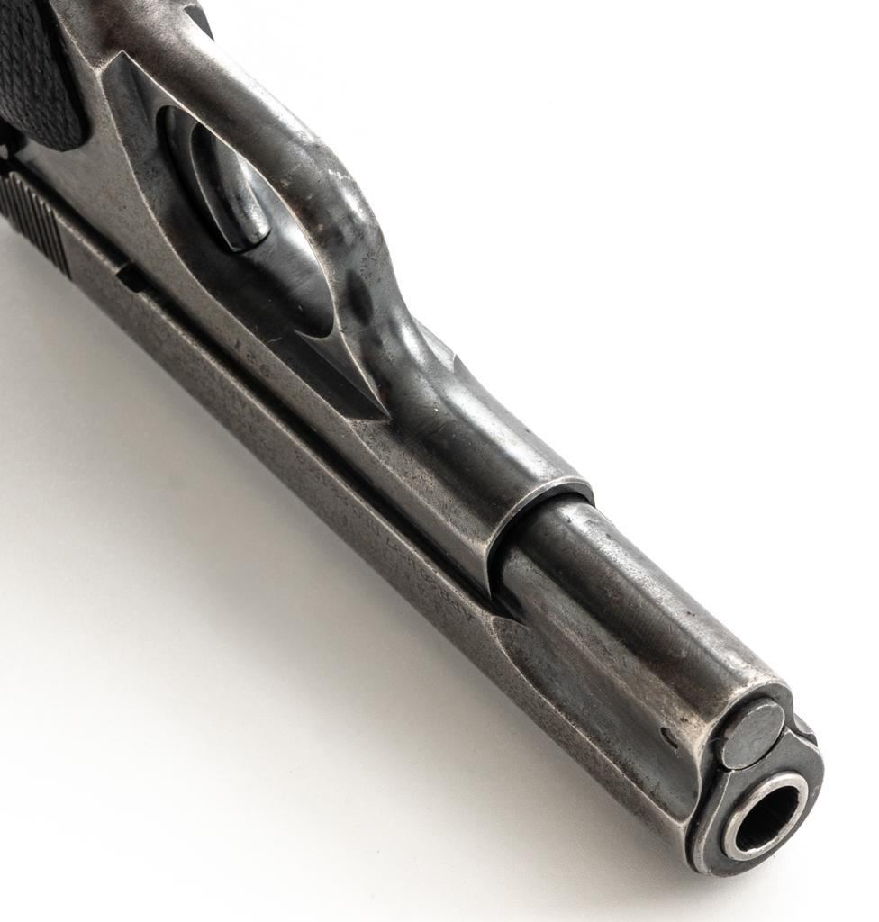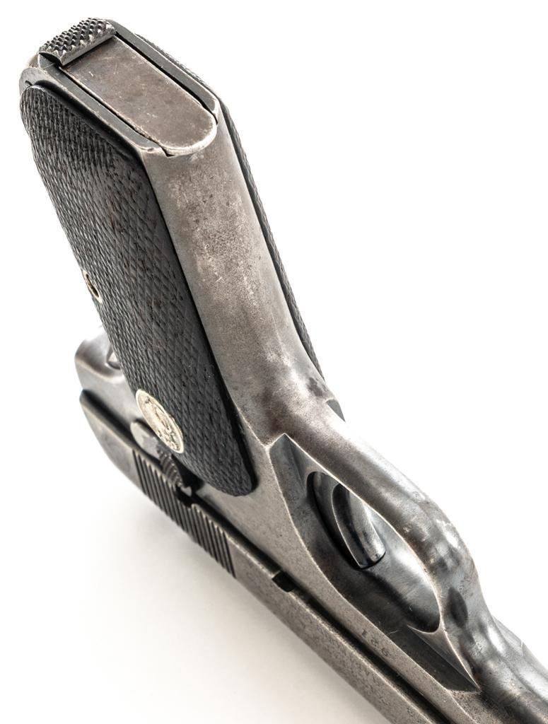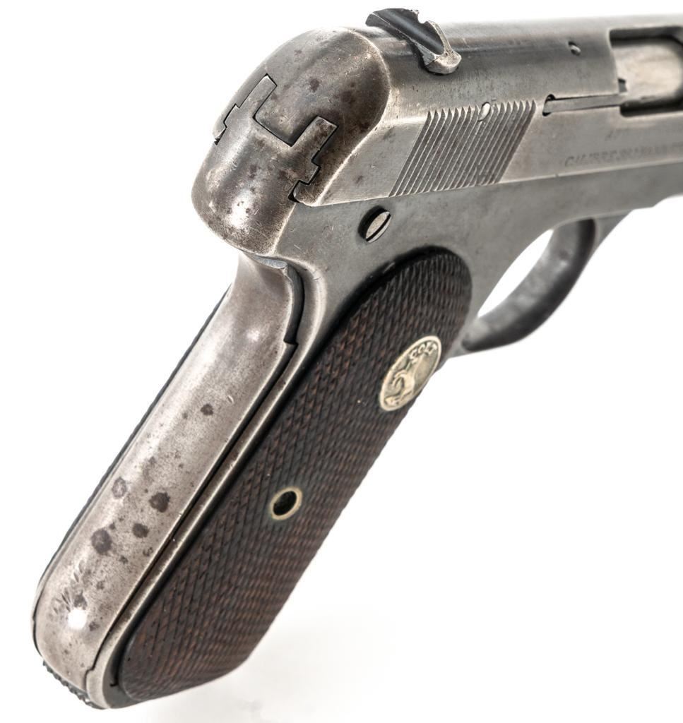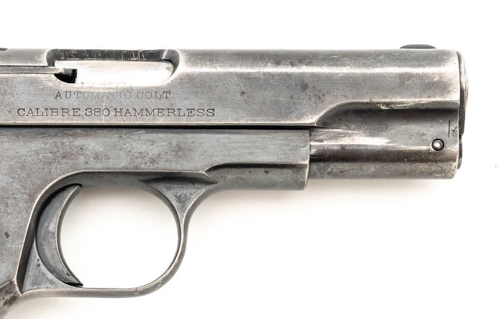 Three-Digit Colt Model 1908 Pocket Hammerless Semi-Automatic Pistol, #921, .380 ACP cal., 3.75" barrel, blued finish, checkered two-piece walnut grips with silver Colt medallions, fixed blade front sight, and "U"-notched rear sight. Standard markings for this early model are correct. Includes one unmarked blued steel magazine and one modern unmarked magazine. Mfgd 1908. Pistol is in good overall condition, retaining approx. 40% blue, mainly on the right side, balance has gone to gray, showing scattered pinprick pitting. Factory markings are visible. Later replacement factory grips show moderate signs of age and handling wear. Action is crisp and functions smoothly. Bore is bright throughout with very good, defined rifling. the action crisp & the bore/rifling are near fine. Est.: $300-$400. (C&R/PPT)