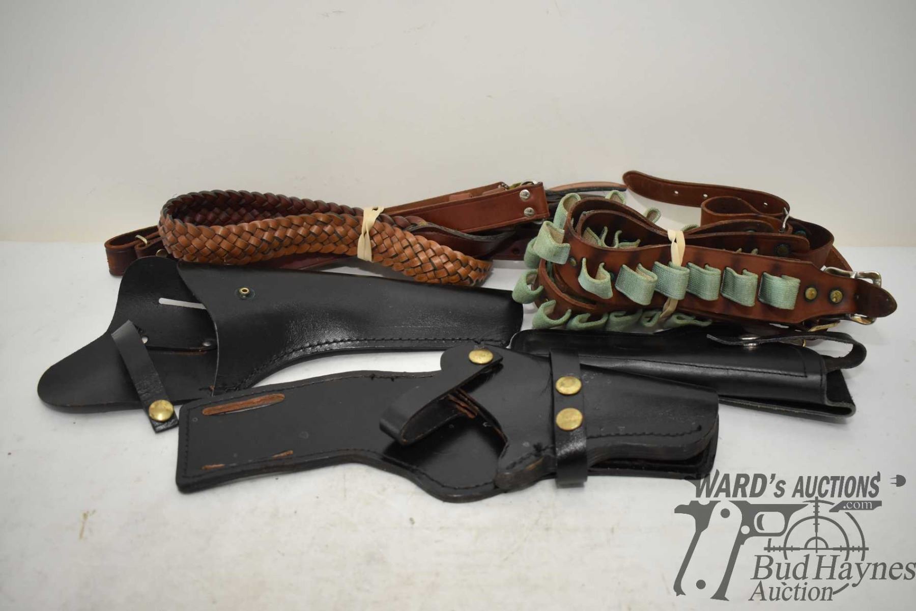 Three assorted black leather holsters, two 12 GA ammo belts and three leather gun slings