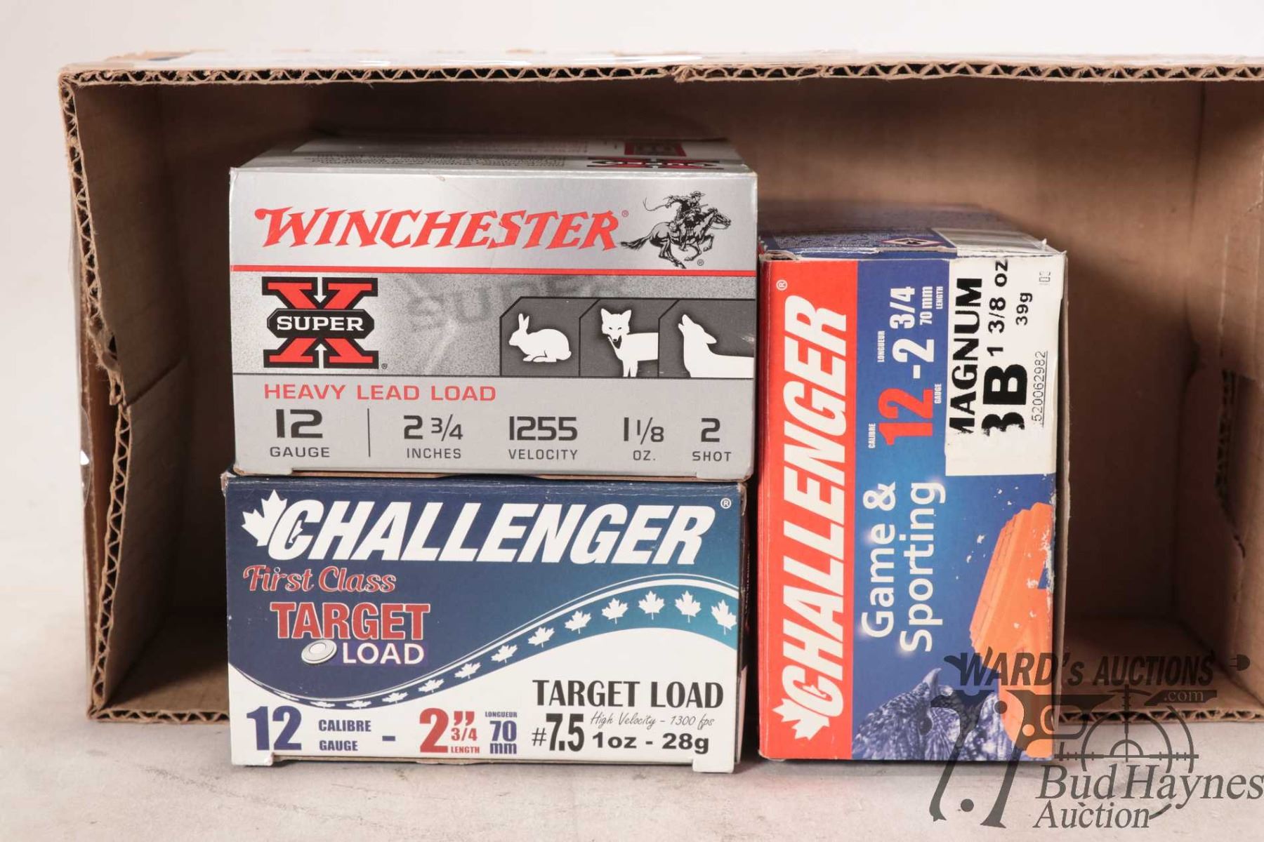 Three full 25 count boxes of 12 GA ammo including Three full 25 count boxes of 12 GA ammo including one Challenger 2 3/4" #7 1/2, one Challenger 2 3/4" magnum BB and one Winchester 2 3/4" #2