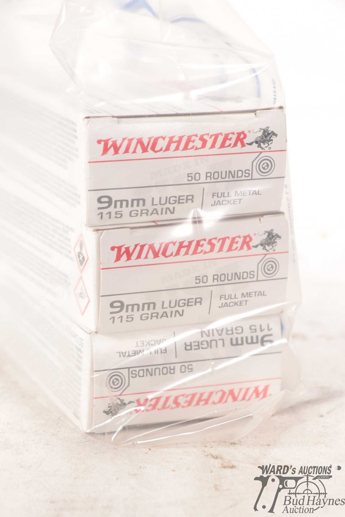 Three full 50 count boxes Winchester 9mm luger 115 Three full 50 count boxes Winchester 9mm luger 115 gr full metal jacket