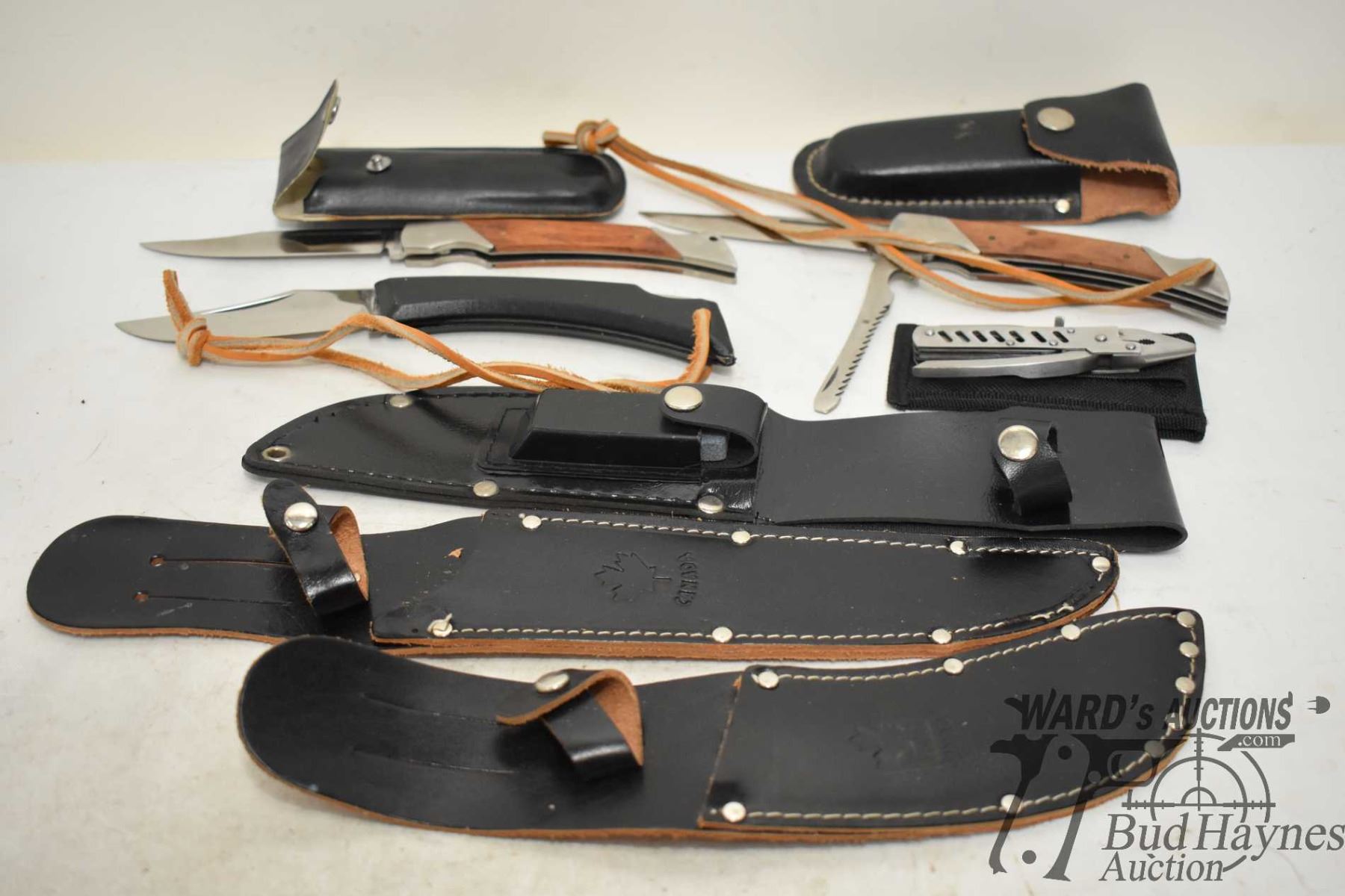 Three pocket knives (two w/ cases) and a multi tool, plus three leather knife sheaths sheaths